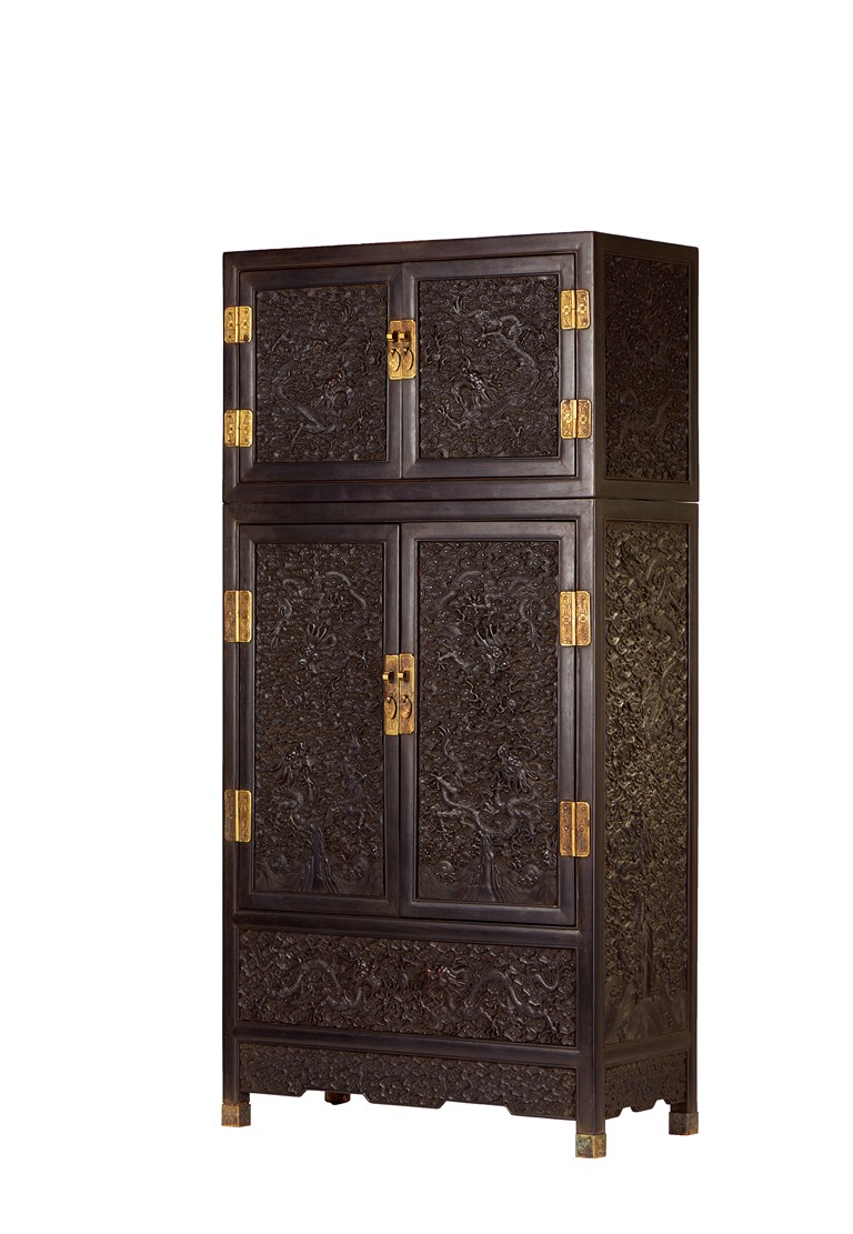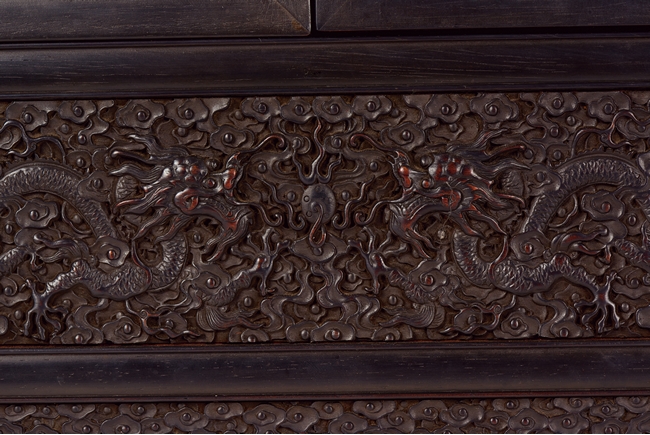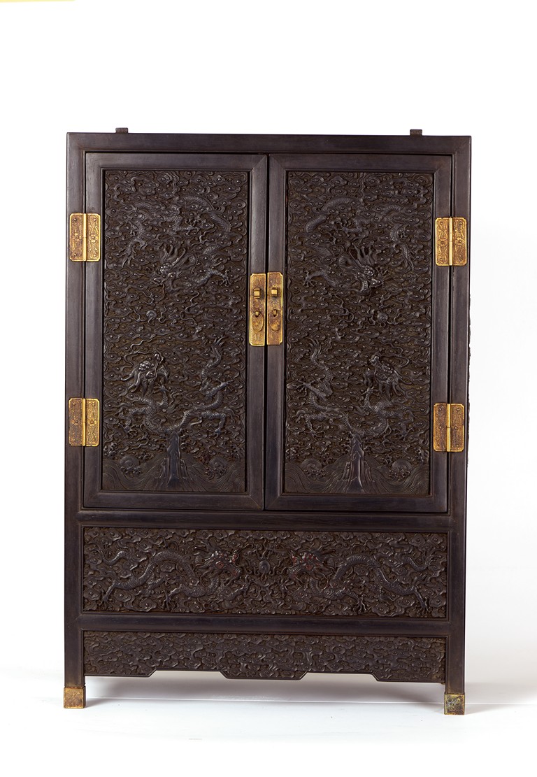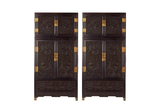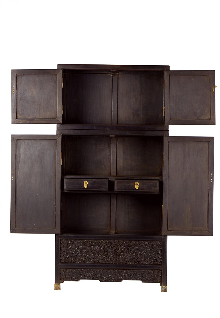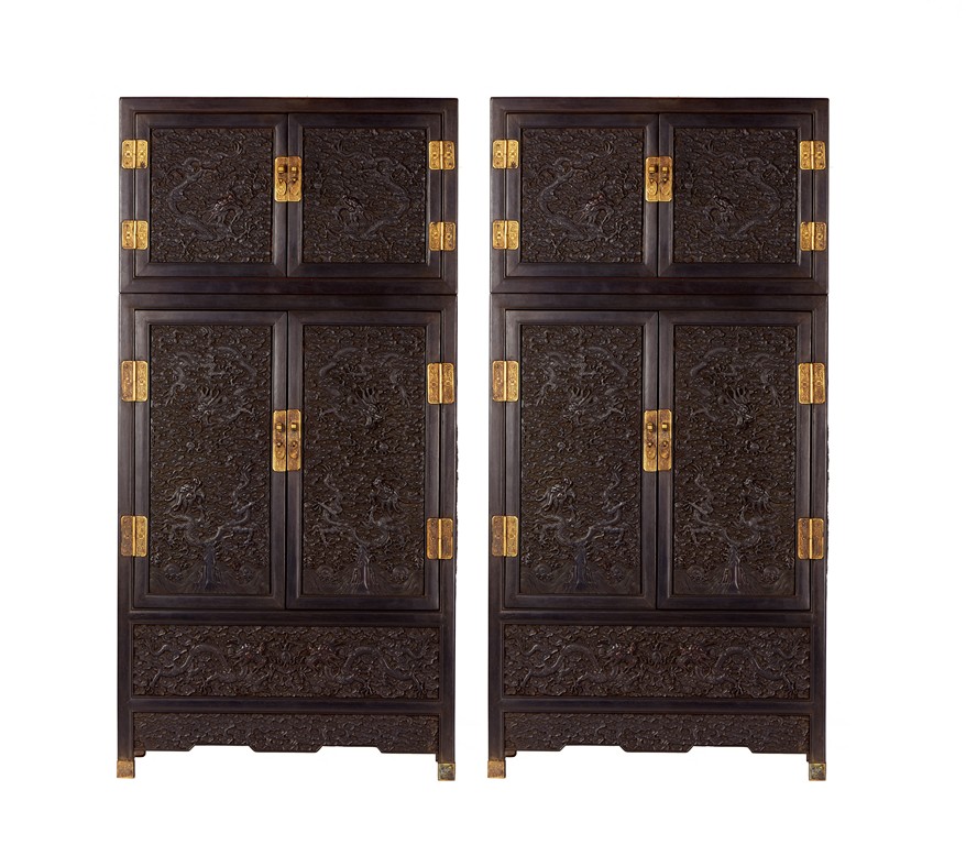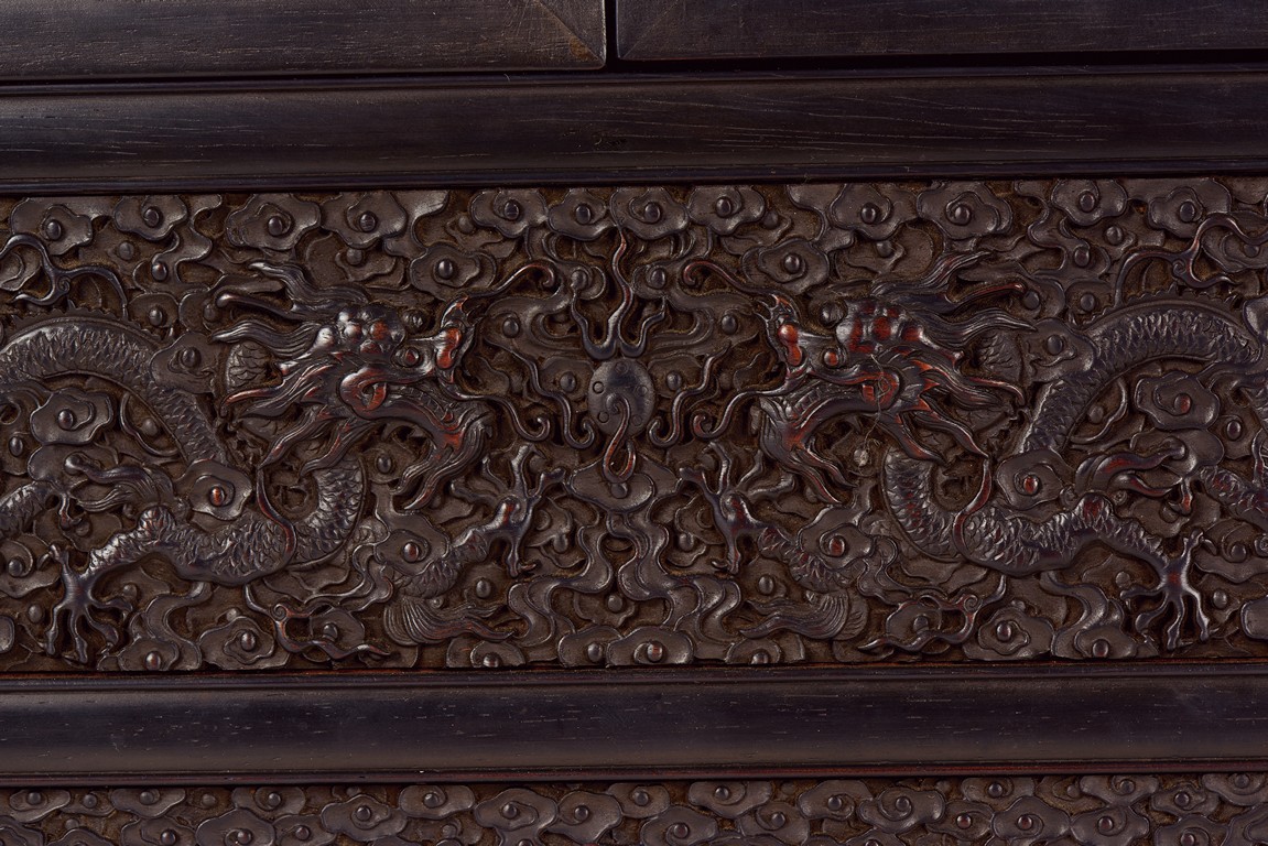 The cabinet is of square-corner form and has panel doors opening from the removable centre stile to reveal the interiorwith one shelf incorporating two drawers. Each door is elaborately carved with writhing dragon amongst clouds, the hat-chests similarly carved, above apron carved with confronting dragons flanking flaming pearl.