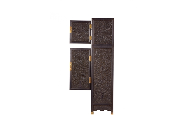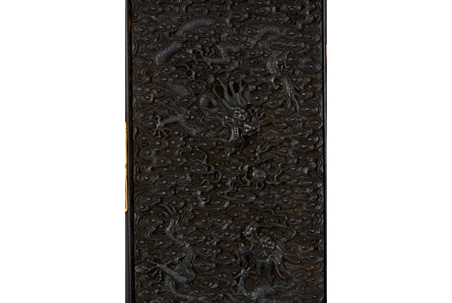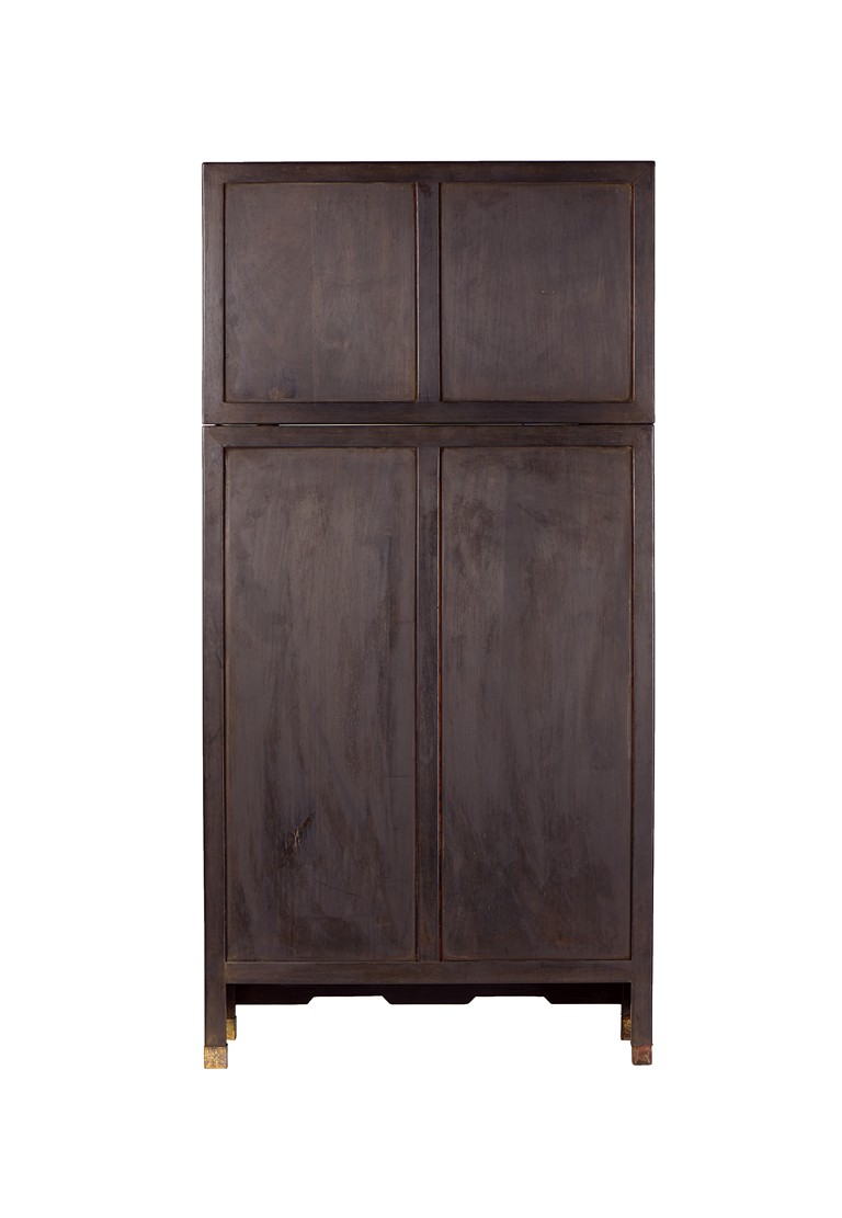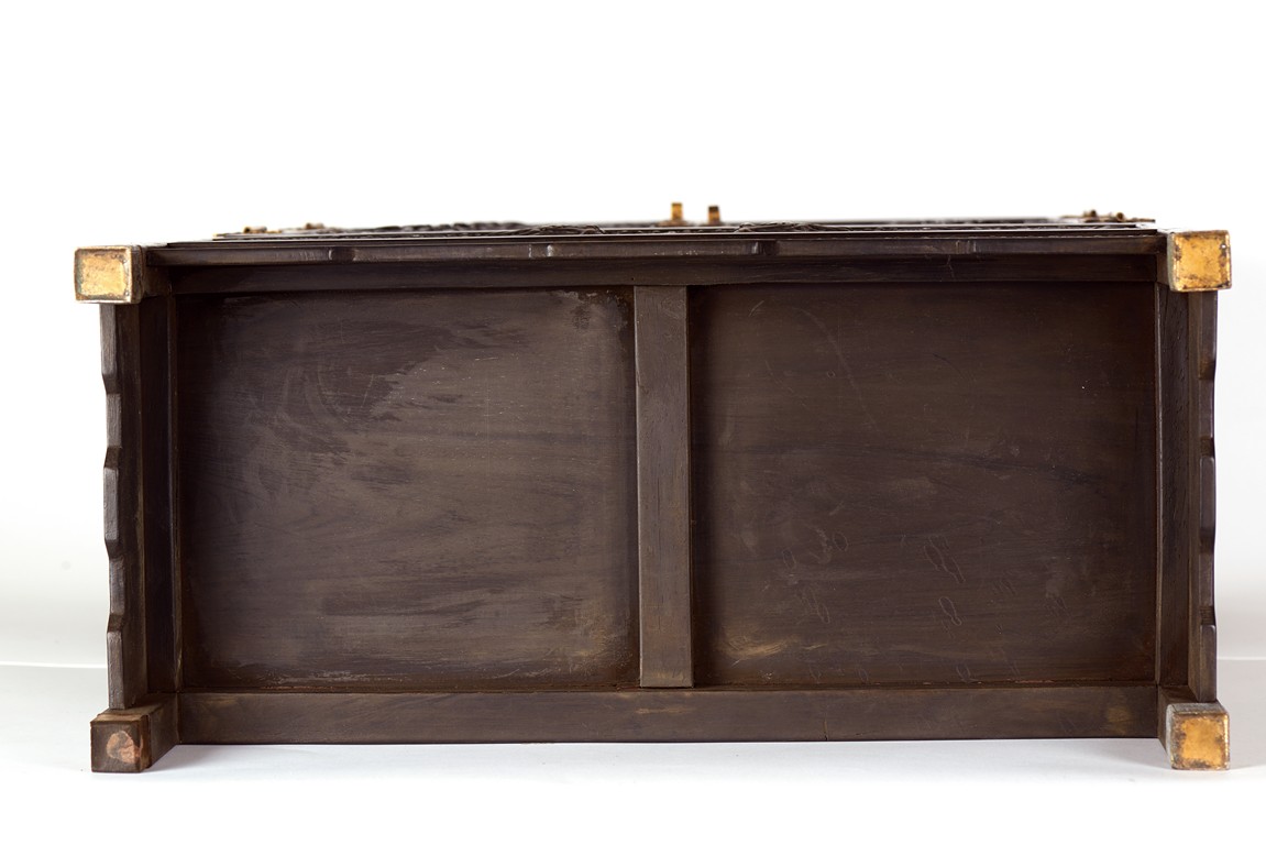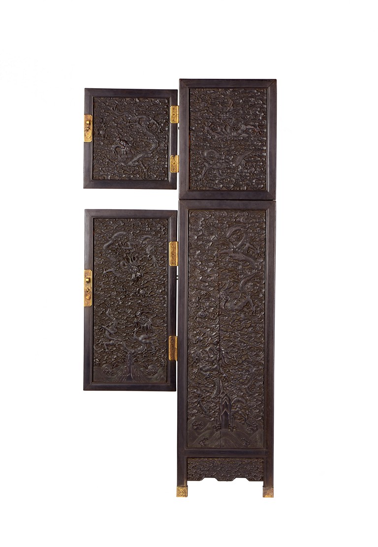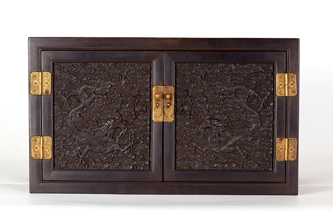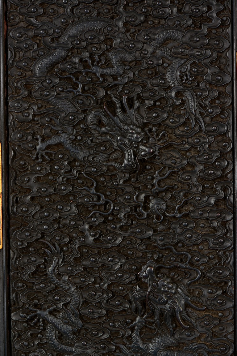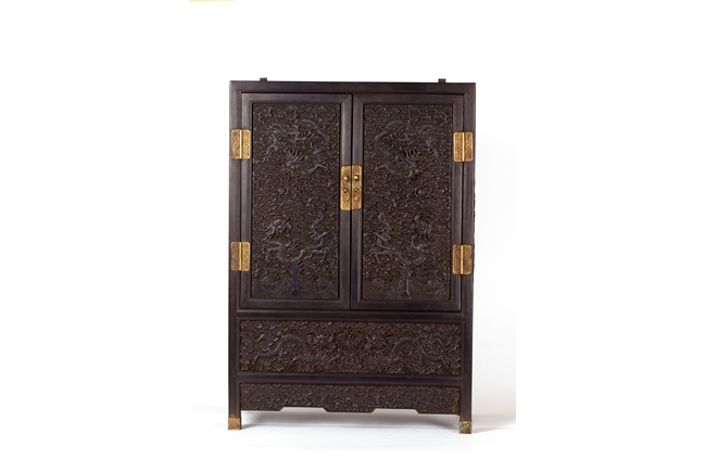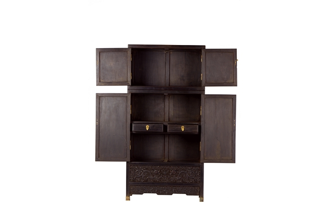 The cabinet is of square-corner form and has panel doors opening from the removable centre stile to reveal the interiorwith one shelf incorporating two drawers. Each door is elaborately carved with writhing dragon amongst clouds, the hat-chests similarly carved, above apron carved with confronting dragons flanking flaming pearl.