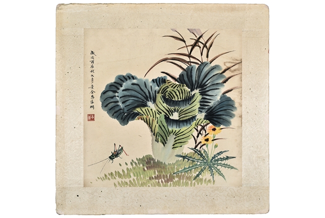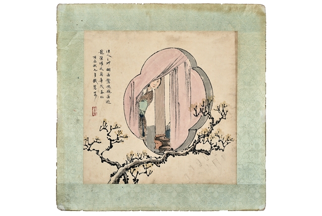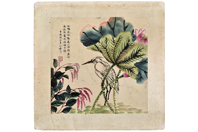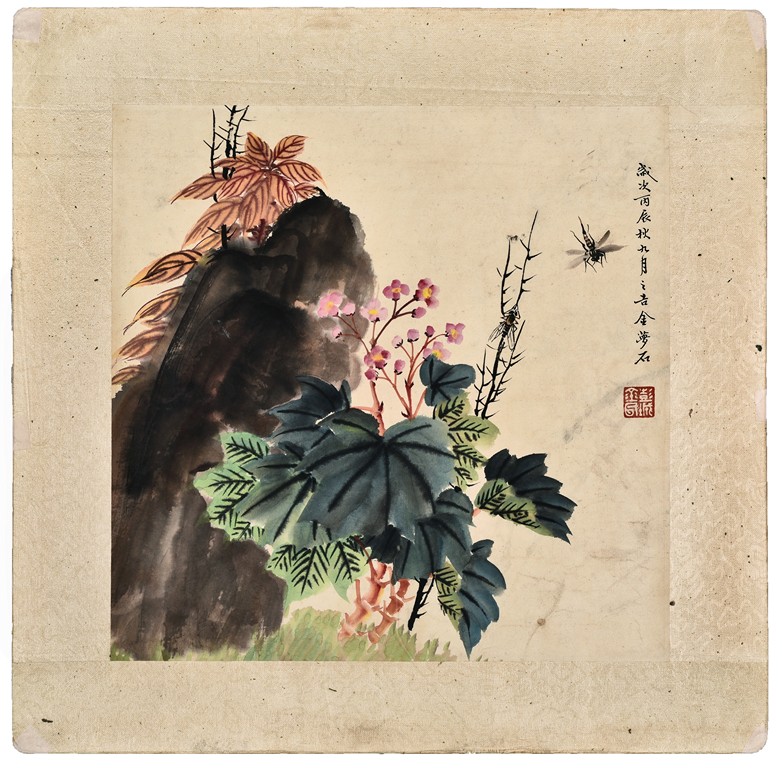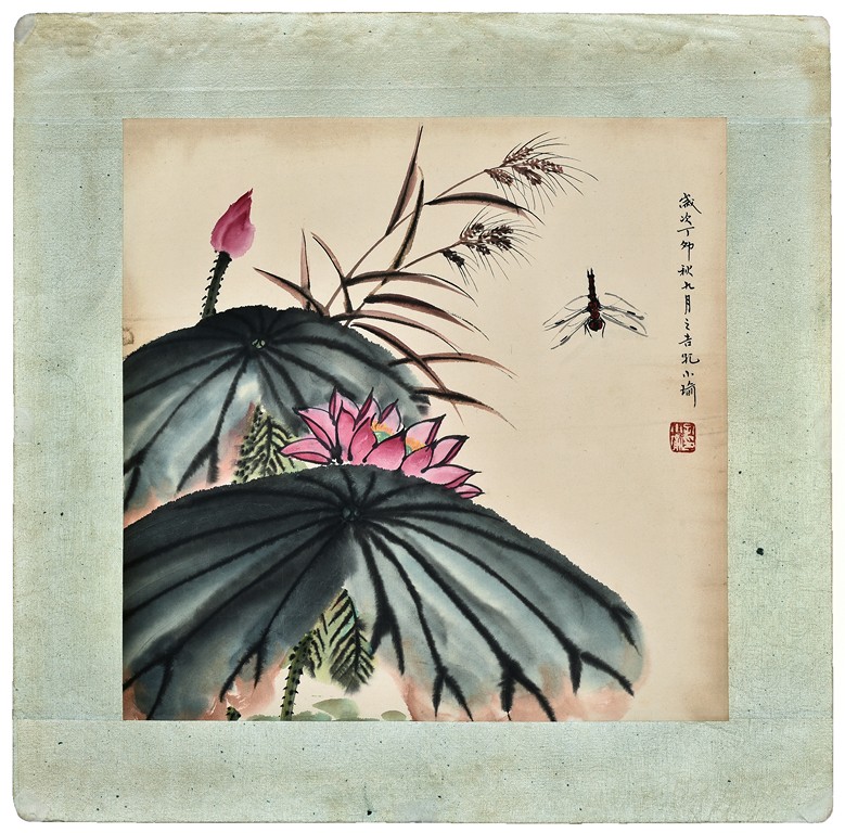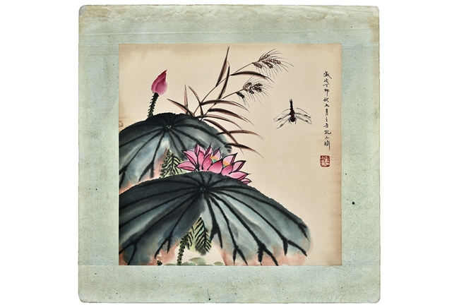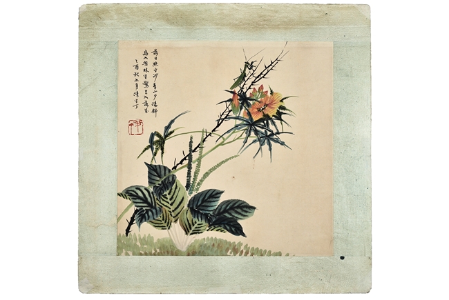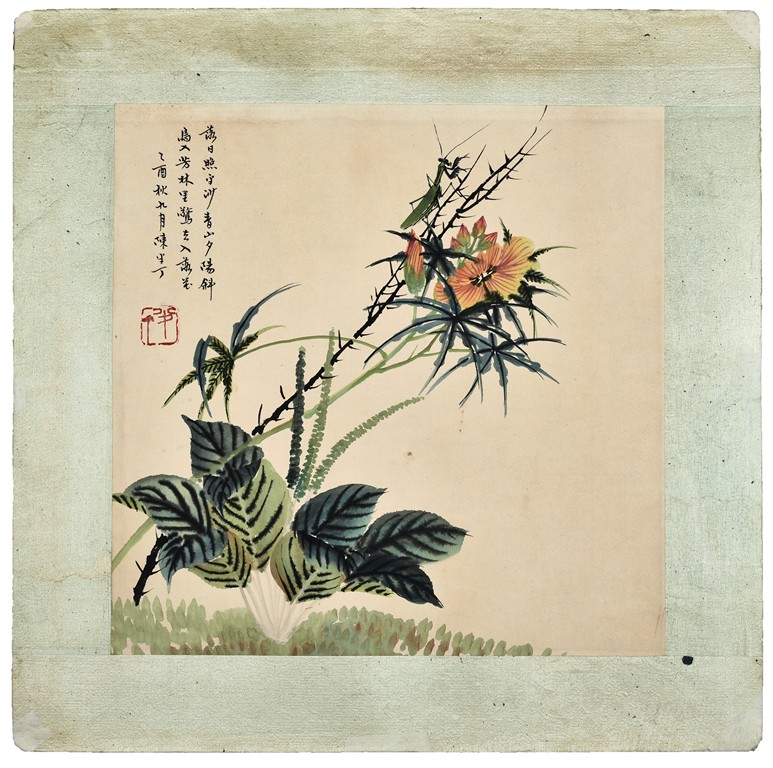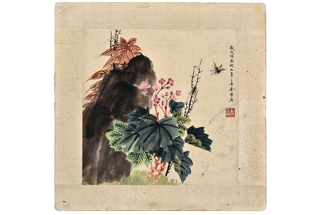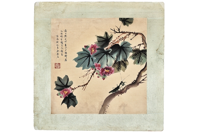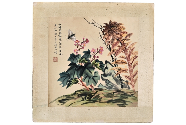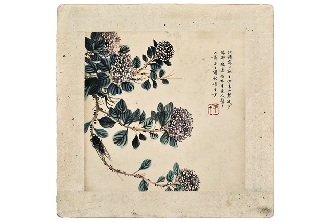 Ink and color on paper. Flowers and birds. Inscribed and signed. With seals of the artists.