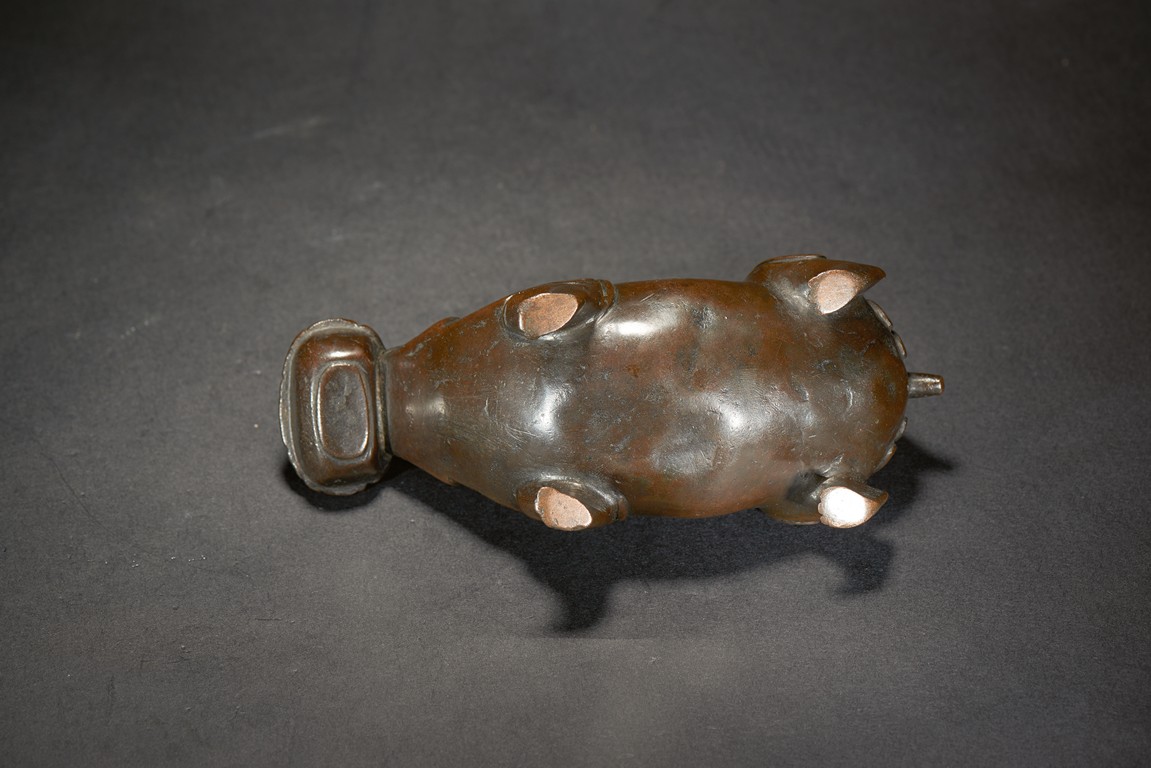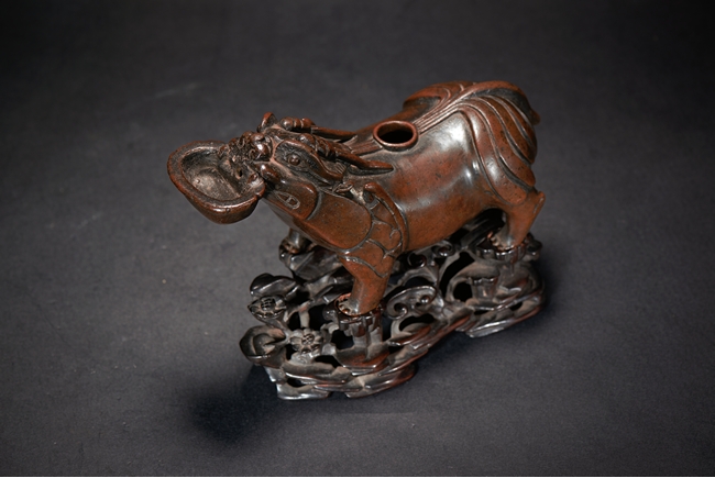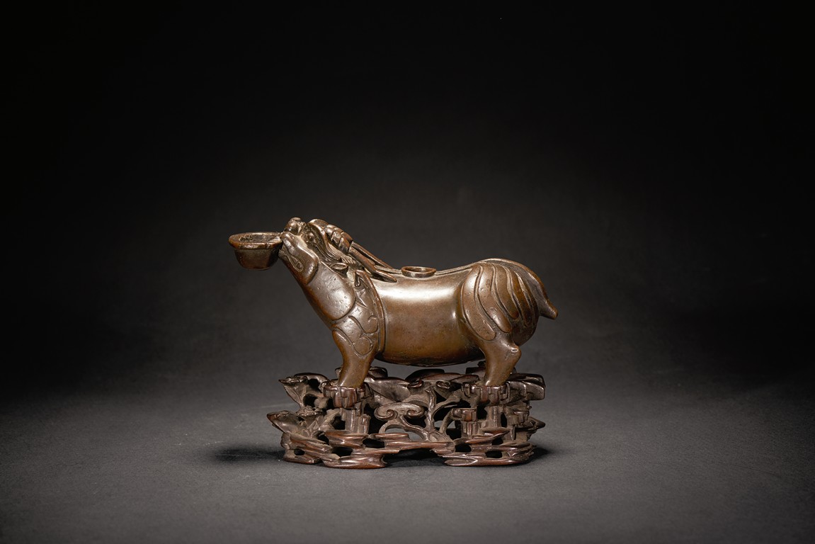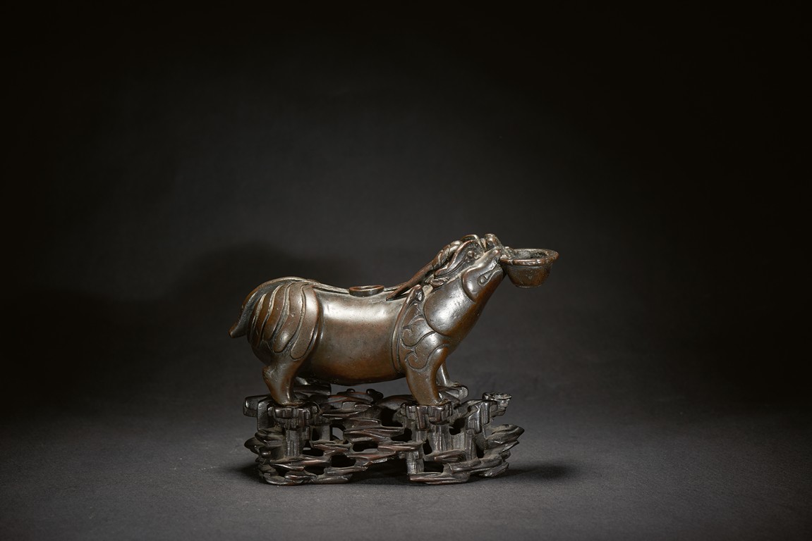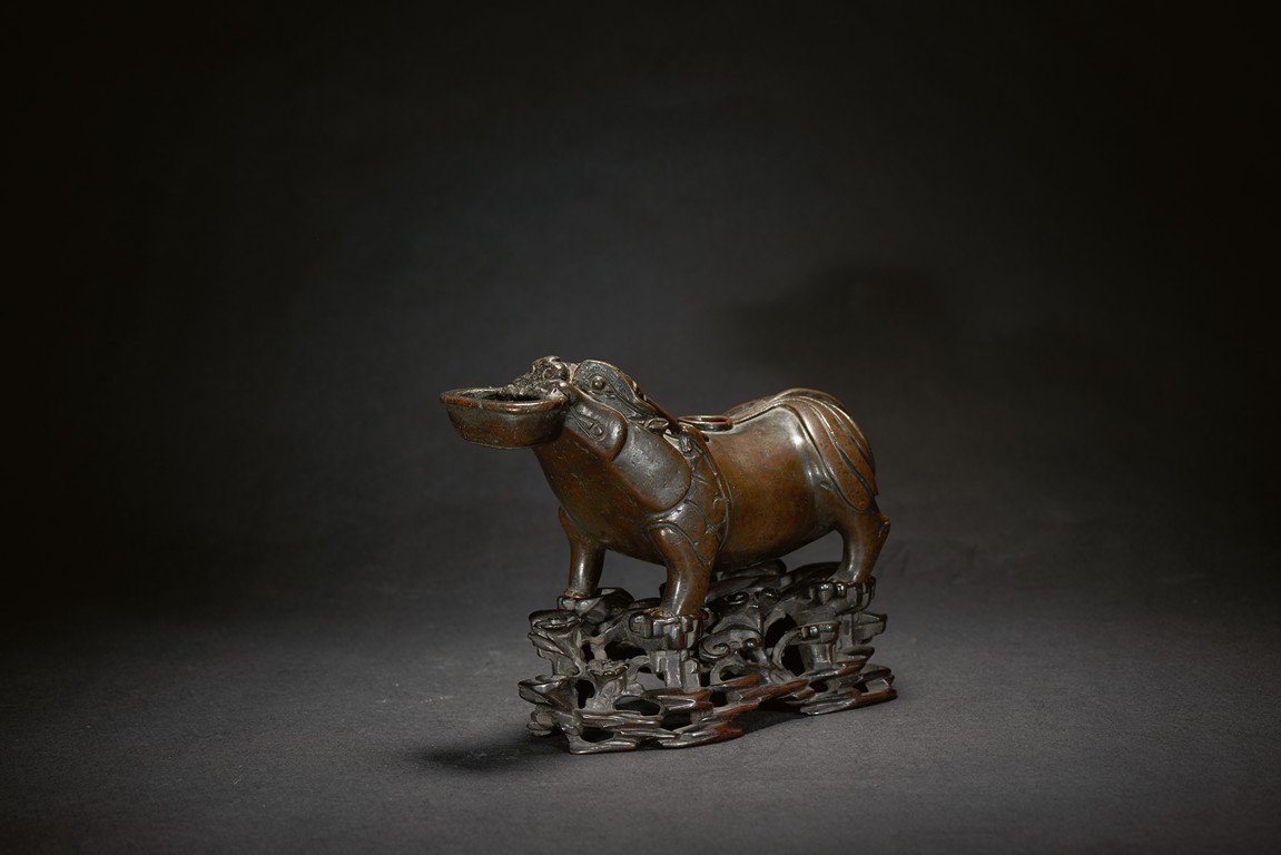 The mythical beast is shown standing foursquare, with bulging eyes, powerful nose, the mouth holding a small cup to collect water from flowers from the hollowed body, accompanied with an openwork hongmu stand. Ming Dynasty period.