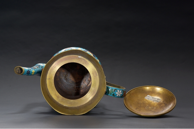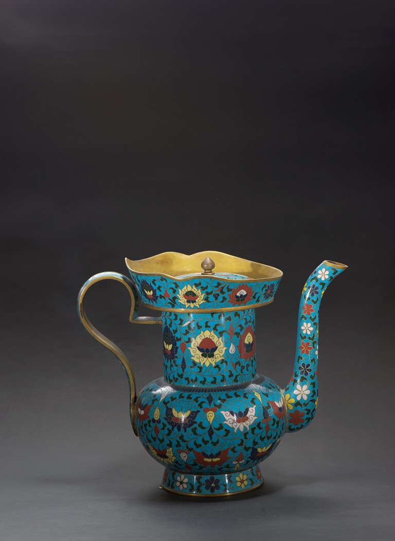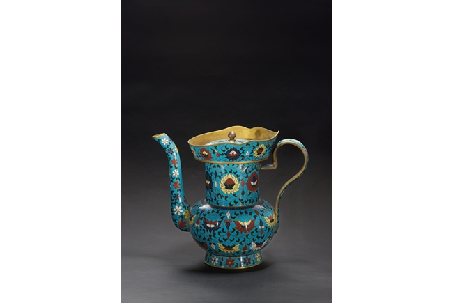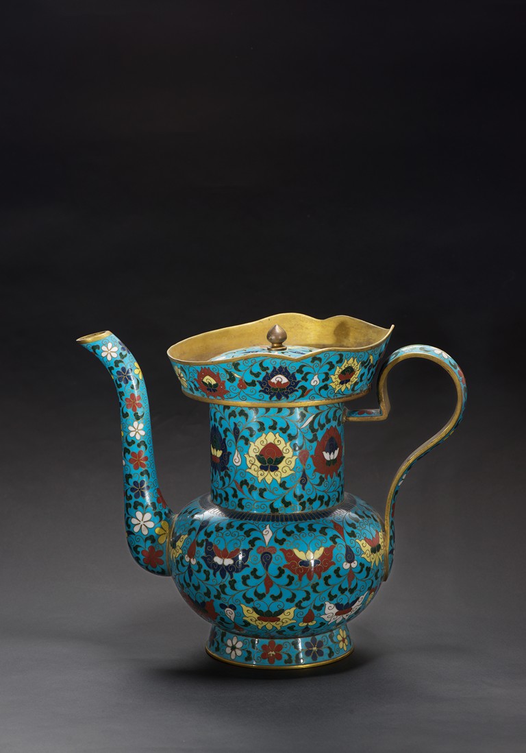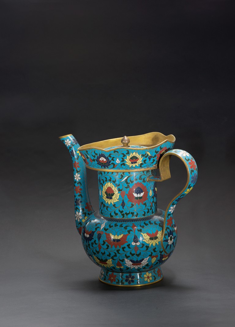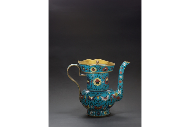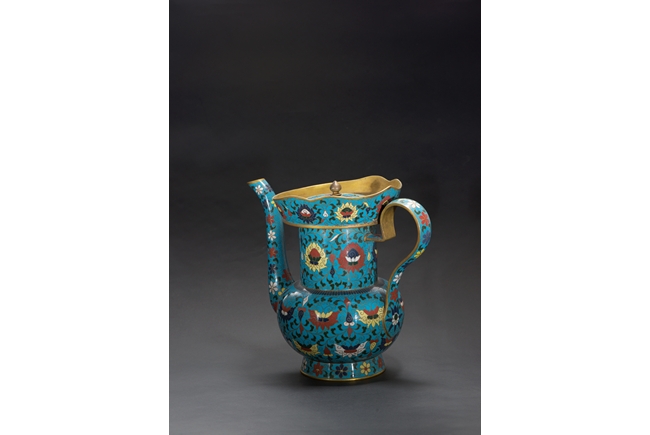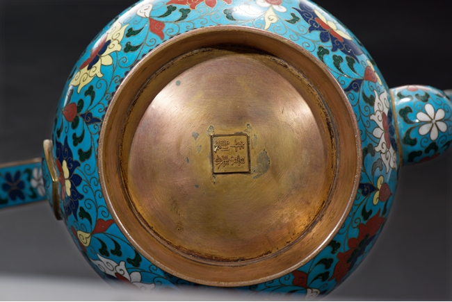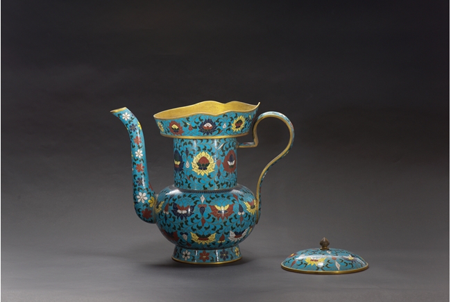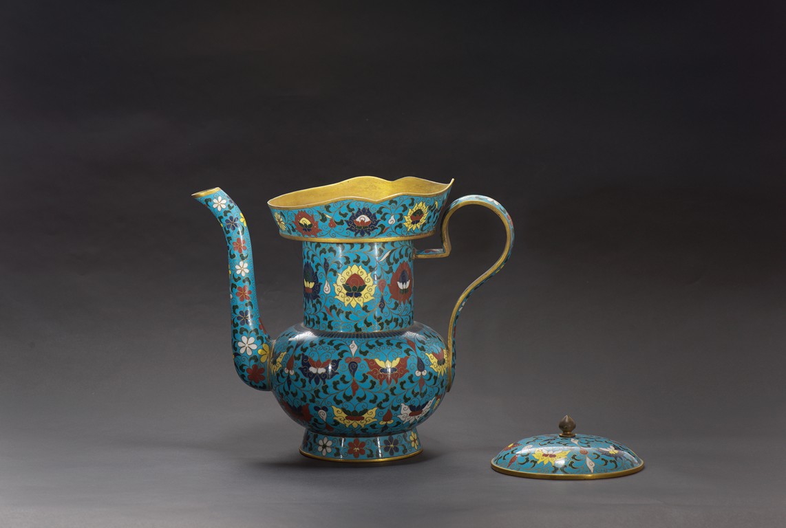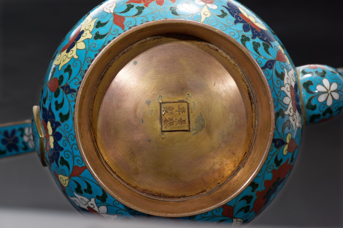 The ewer finely enamelled with lotus floral design, fitted with cover, the base with four character JINTAI mark. Qing Dynasty period.