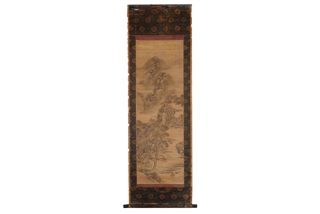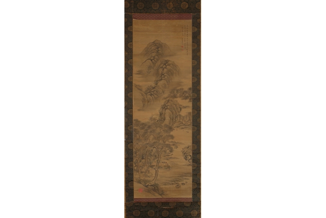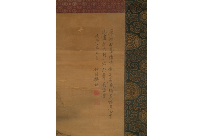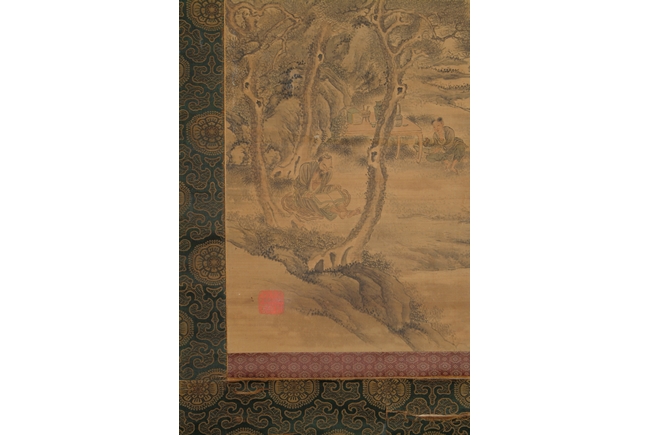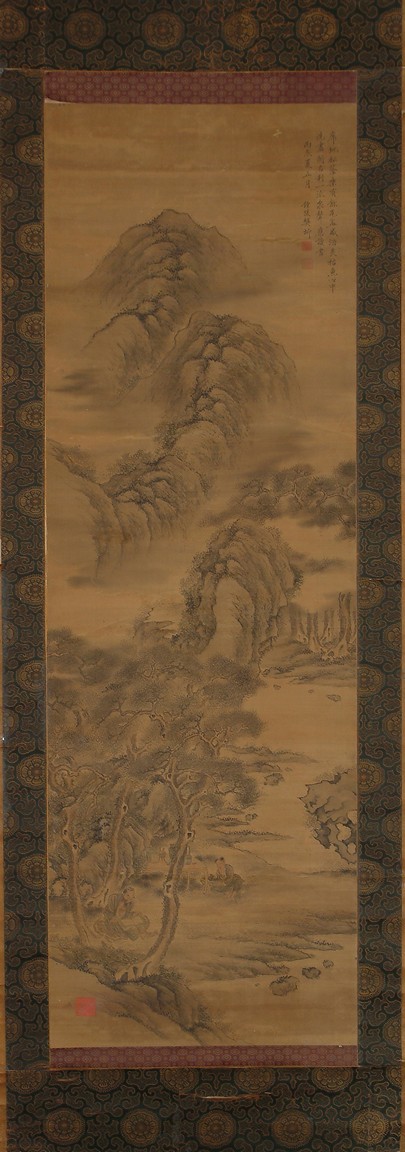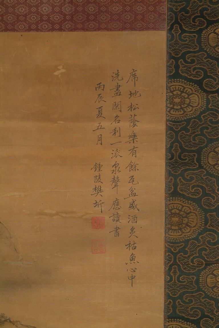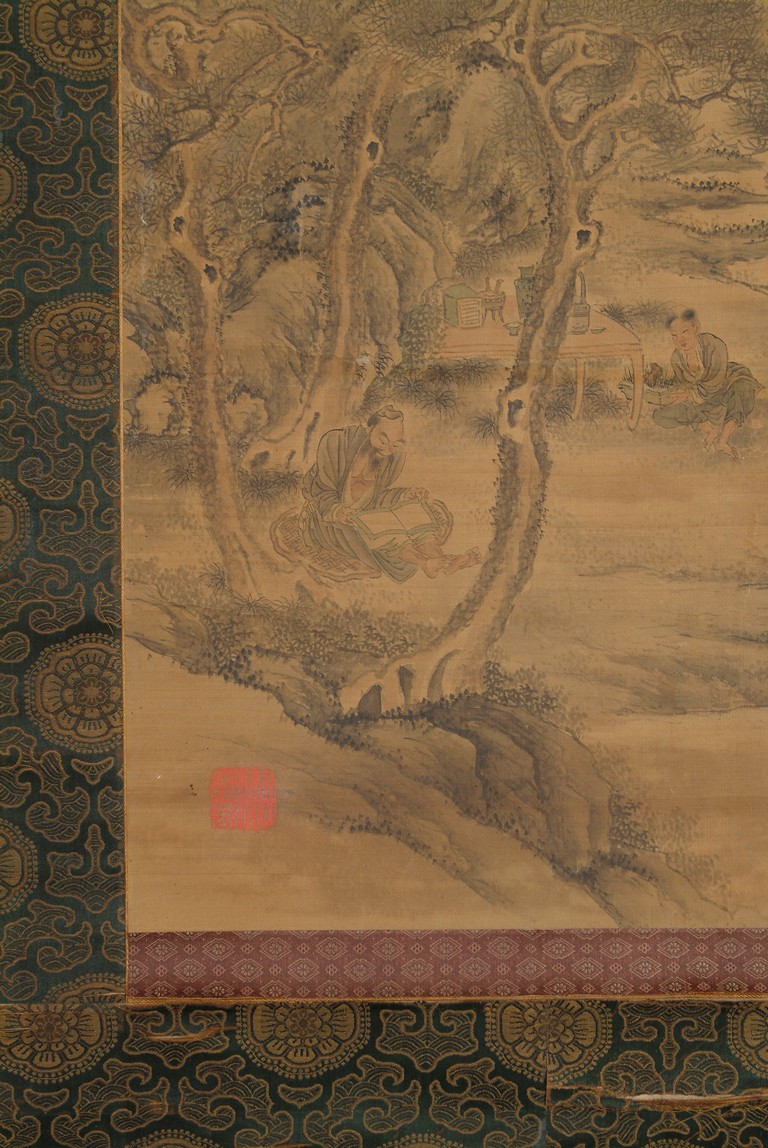 This painting depicts a panoramic view of mountain range, with a grove of pine trees in the front. Under pine trees and under foothill, a scholar and his attendant are seated near a table, reading and preparing food under the shade. A colophon of Chinese characters on the upper right hand corner attributes the artwork to 'FAN QI'. Ming Dynasty period.