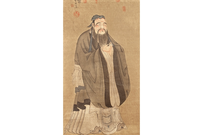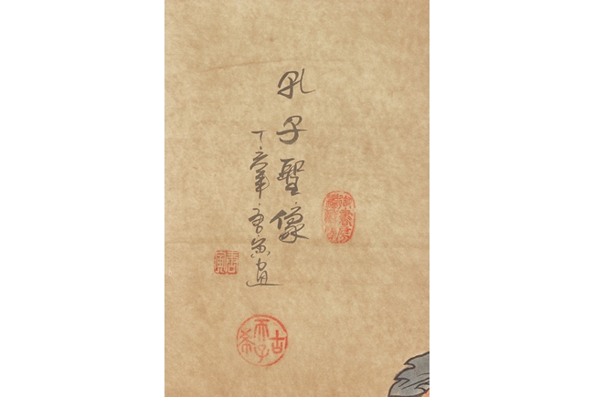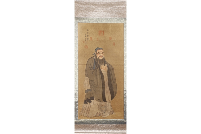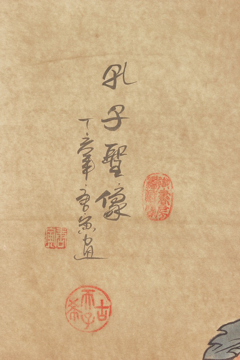A COLOR AND INK ON PAPER PAINTING OF CONFUCIOUS 唐寅款 大型孔子聖像