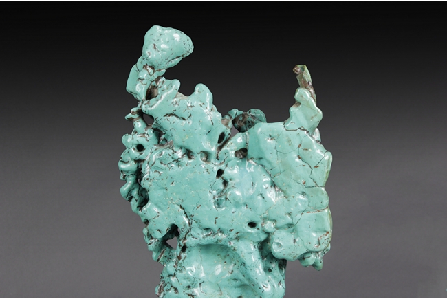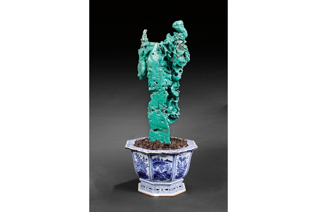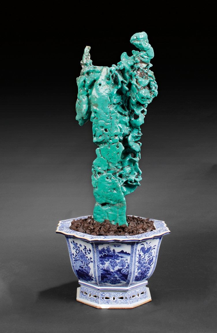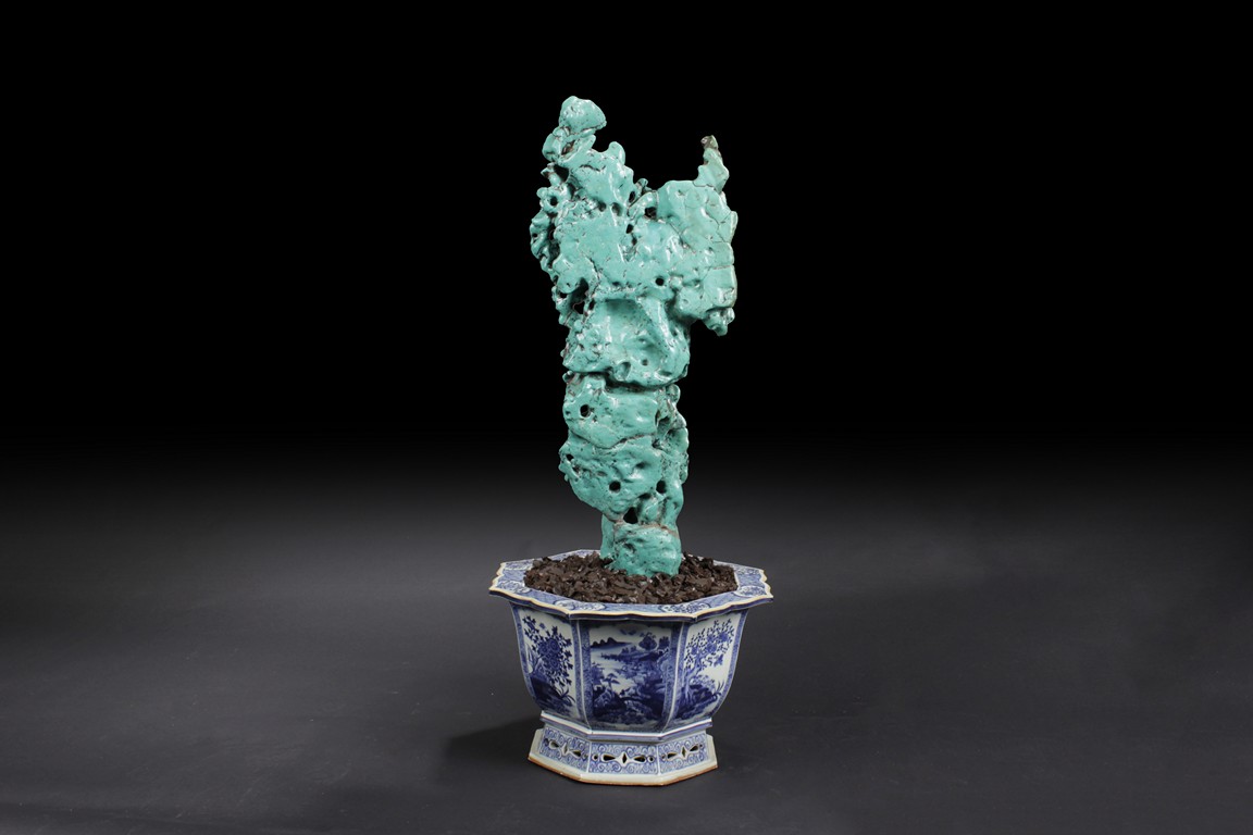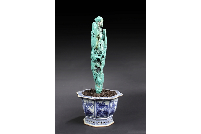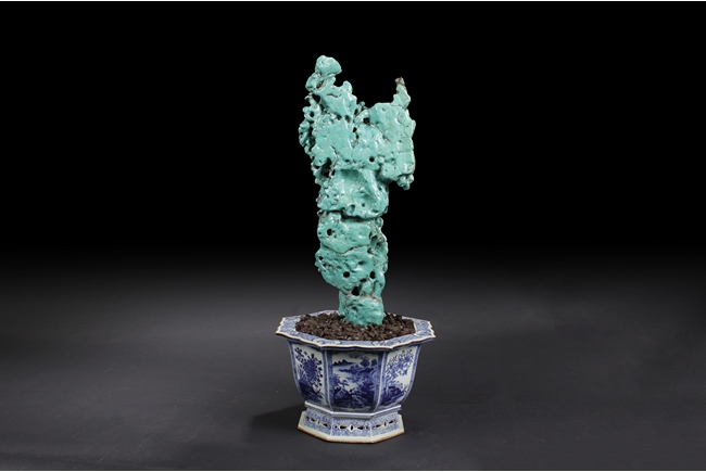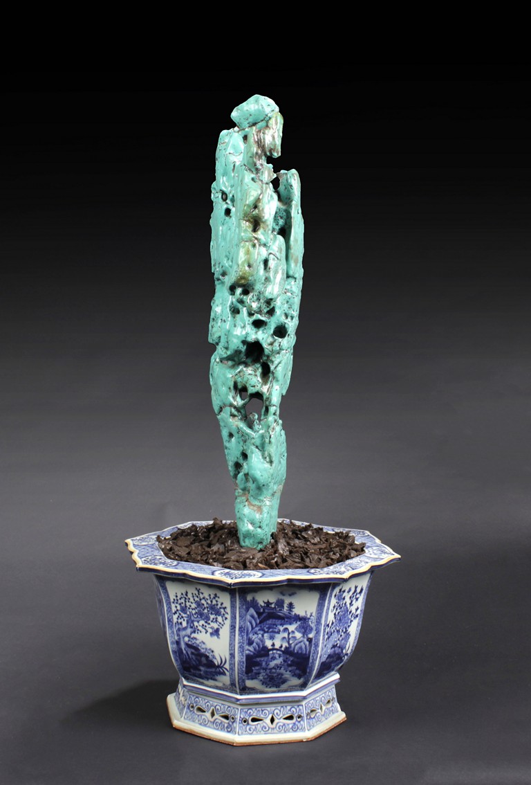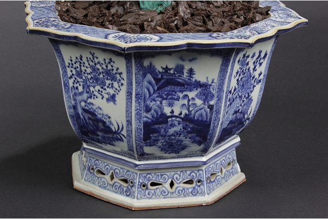 Of naturalistic rockwork design, the turquoise stone fitted in a blue and white planter,the color mostly teal with some russet, the center occasionally hollowed, and very smooth surface. The blue and white planter is in octogonal form with eight lobes, each depicting a landscape scene. Qing Dynasty period.