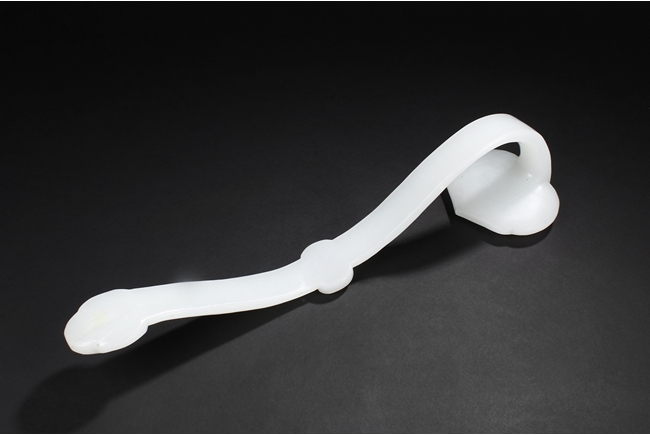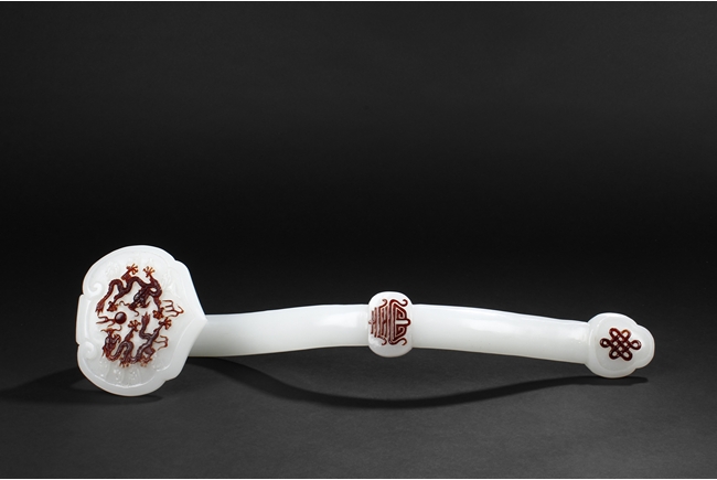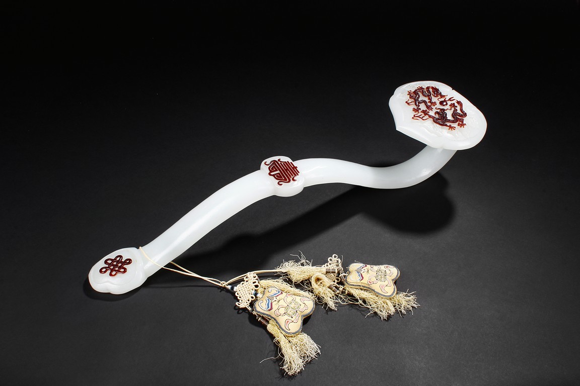 Of elegant S-shape, this ruyi scepter is elaborately carved through the red overlay to the opaque white glass with a flaming pearl flanked by two flying dragons in the head. The mid section is carved with a stylised character 'Shou', or longevity. It ends with a carved auspicious symbol of knot terminal and includes a yellow silk cord. Qing Dynasty period.
