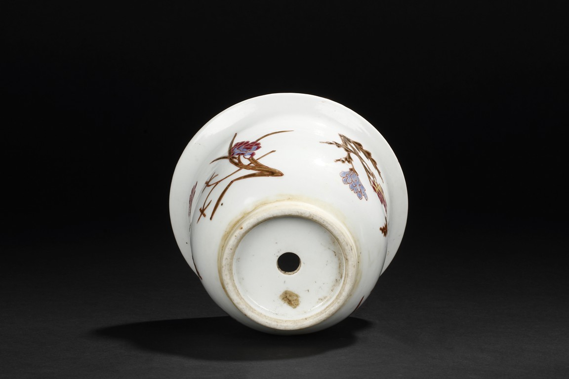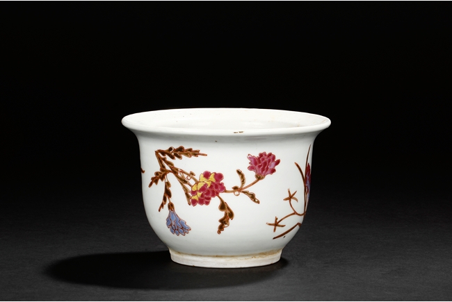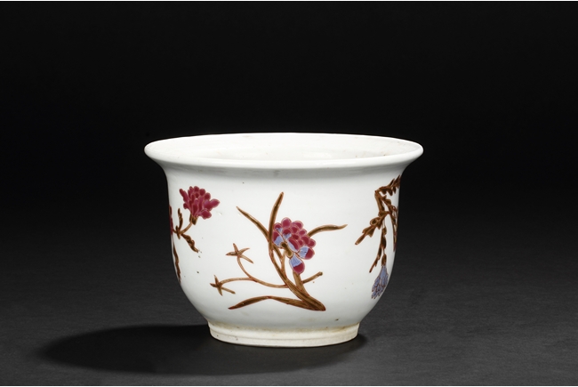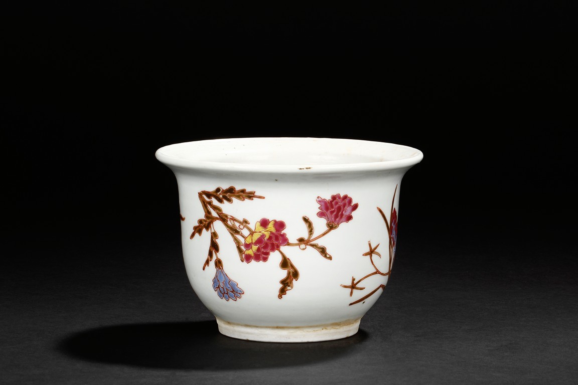 This jardiniere is raised by a short circular foot. Its flaring sides rise to a everted rim. The exterior of the body is painted with brownish foliage and red blue flowering designs in famille rose all against the white glazed ground.Qing Dynasty period.