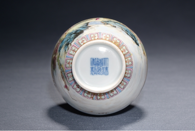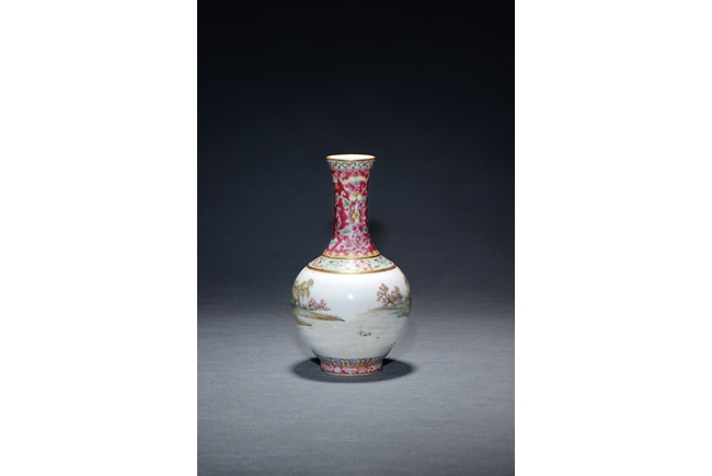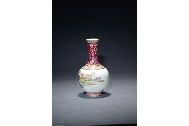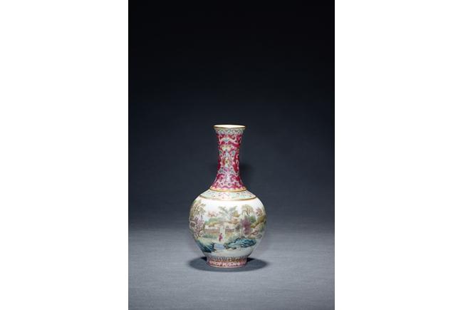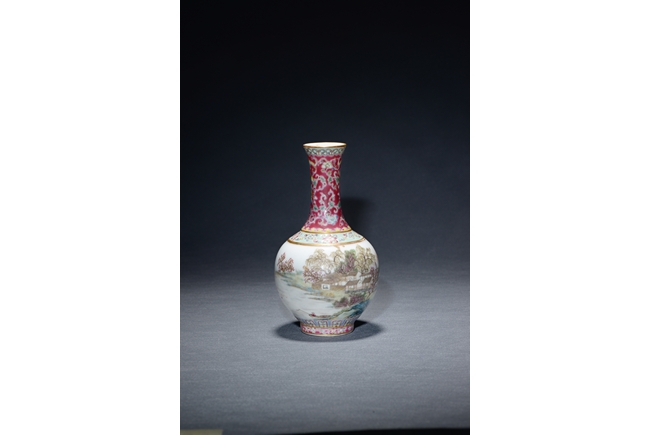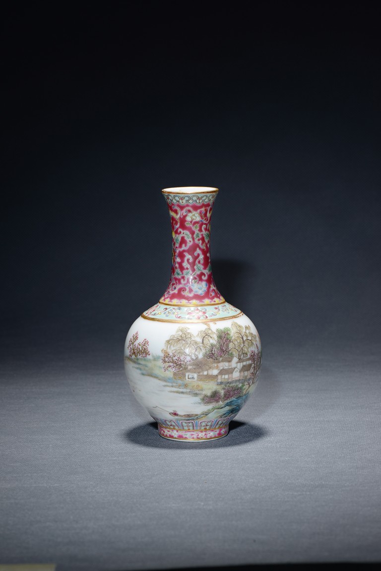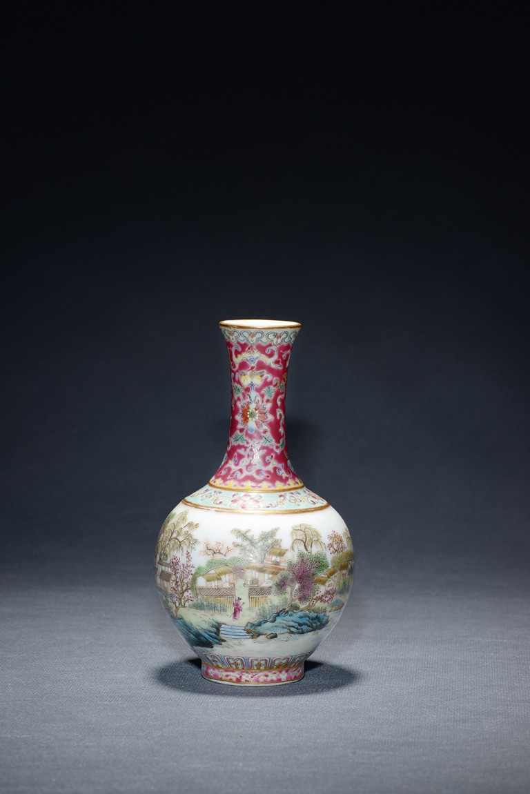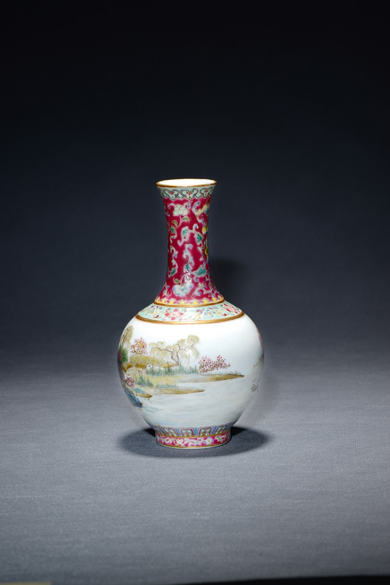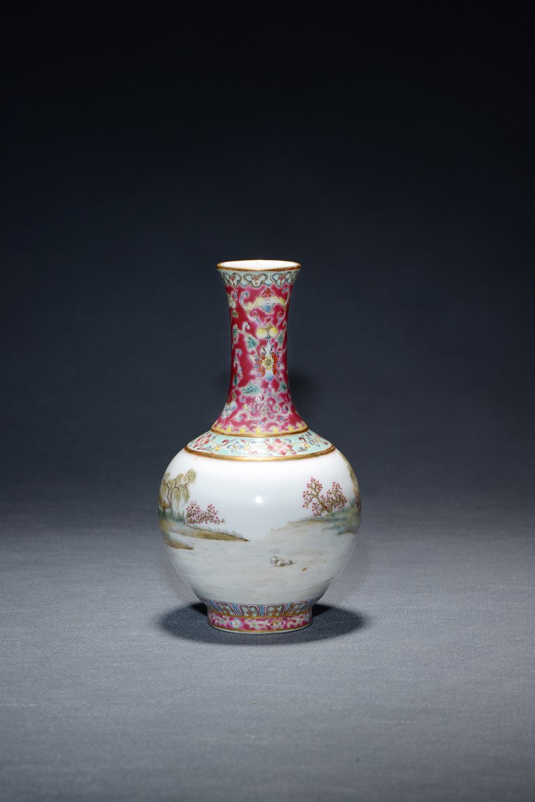 Supported on circular foot ring, the body is of elongated globular form finely enamelled with a continous scene of countryside by a river, the bottom with a band of petal-lappets, the long neck enamelled with foliate scroll reserved on red ground. The base with six character DAOGUANG mark. Qing Dynasty period.