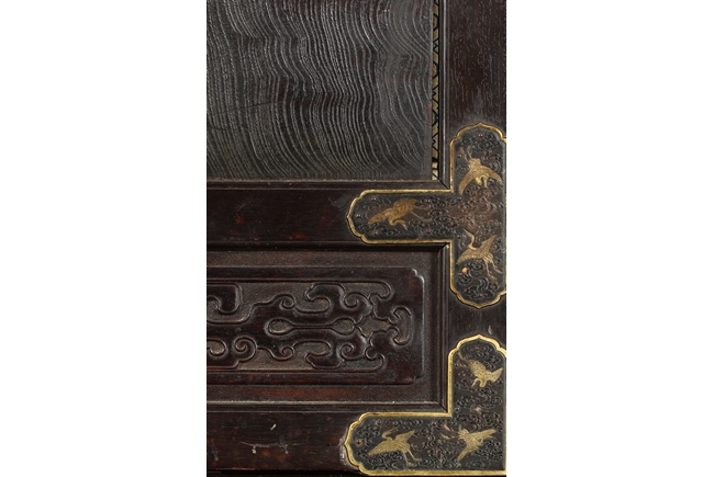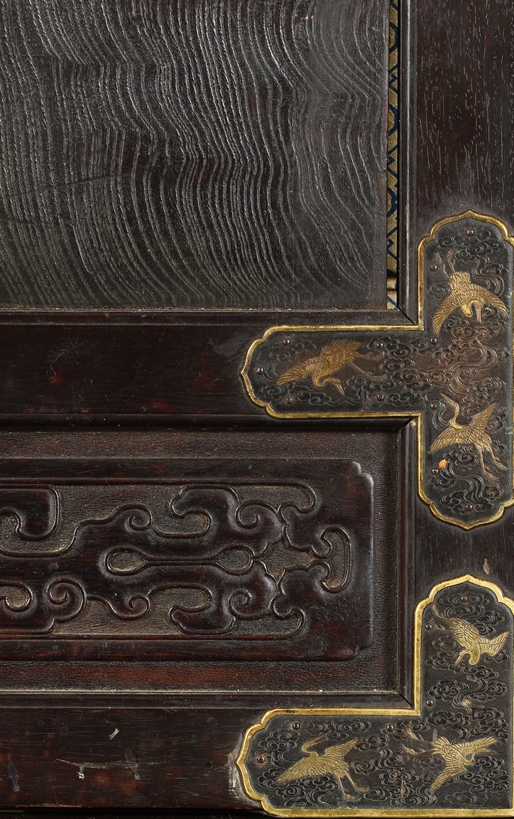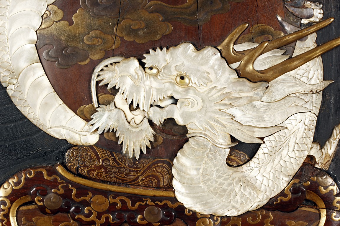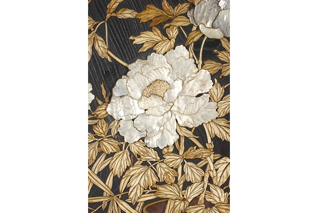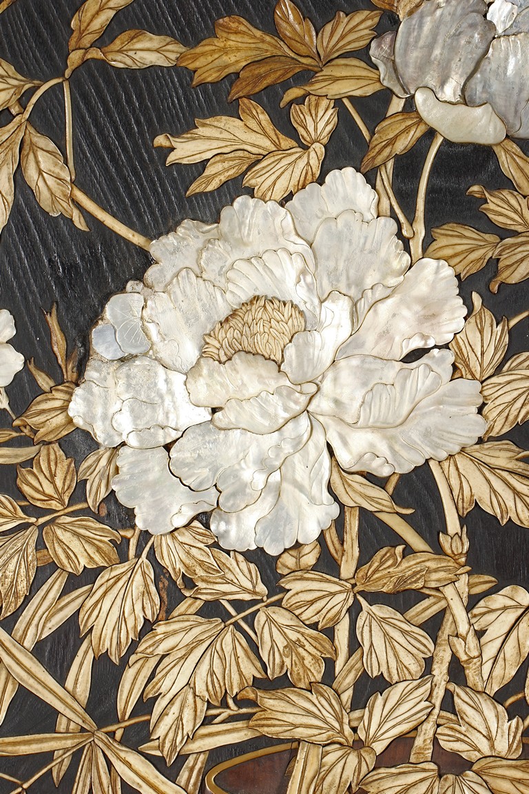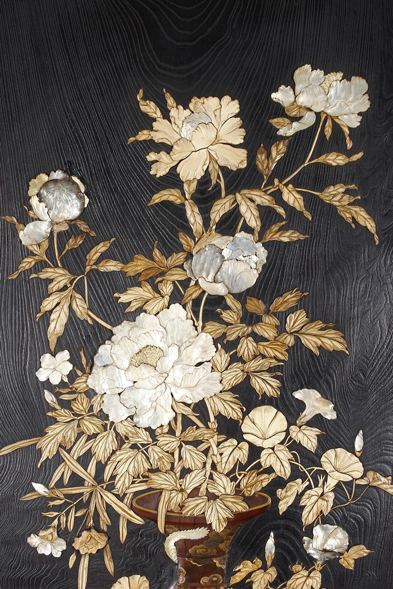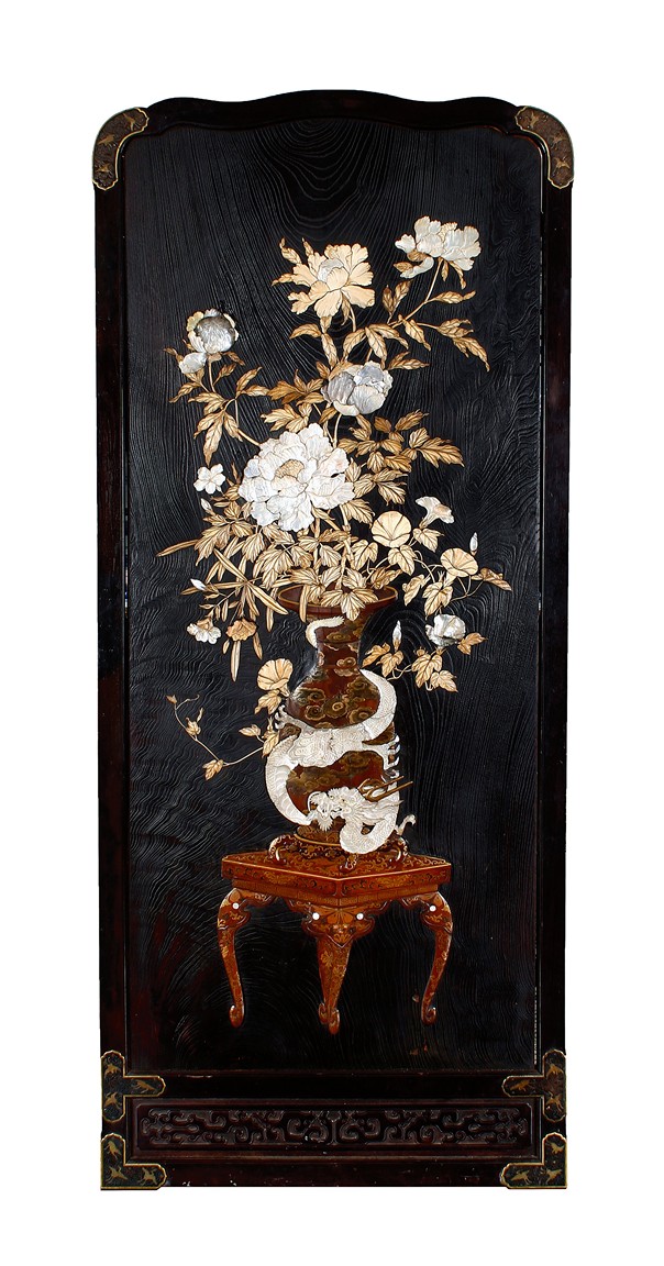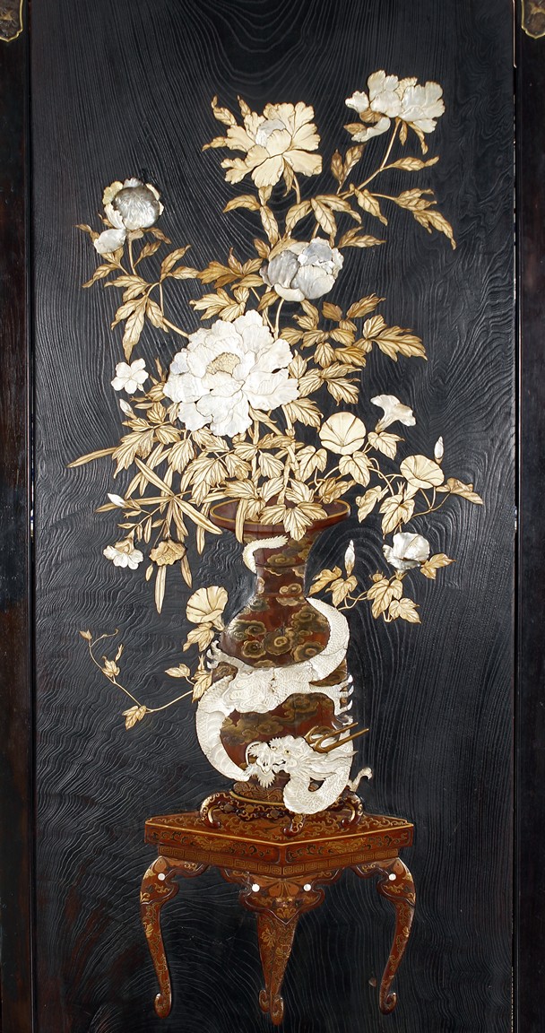 Inlaid in mother-of-pearl and bone, this hanging screen encloses a rectangular panel with depiction of a dragon winding around the vase on the table with leafy flowers issuing from the vase. The vase is exquisitely decorated with auspicious clouds motif and raised by cabriole legs above a table top of intricate scrolling foliage pattern and key-fret plain aprons supported by cabriole legs that terminated in scrolling feet, all against a black lacquer background. 19th Century.