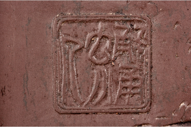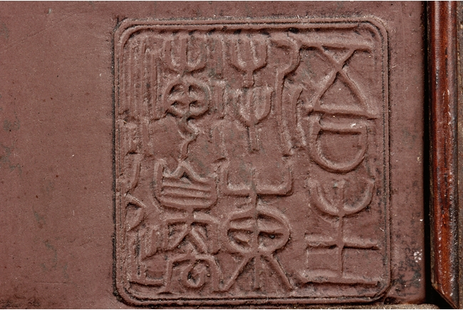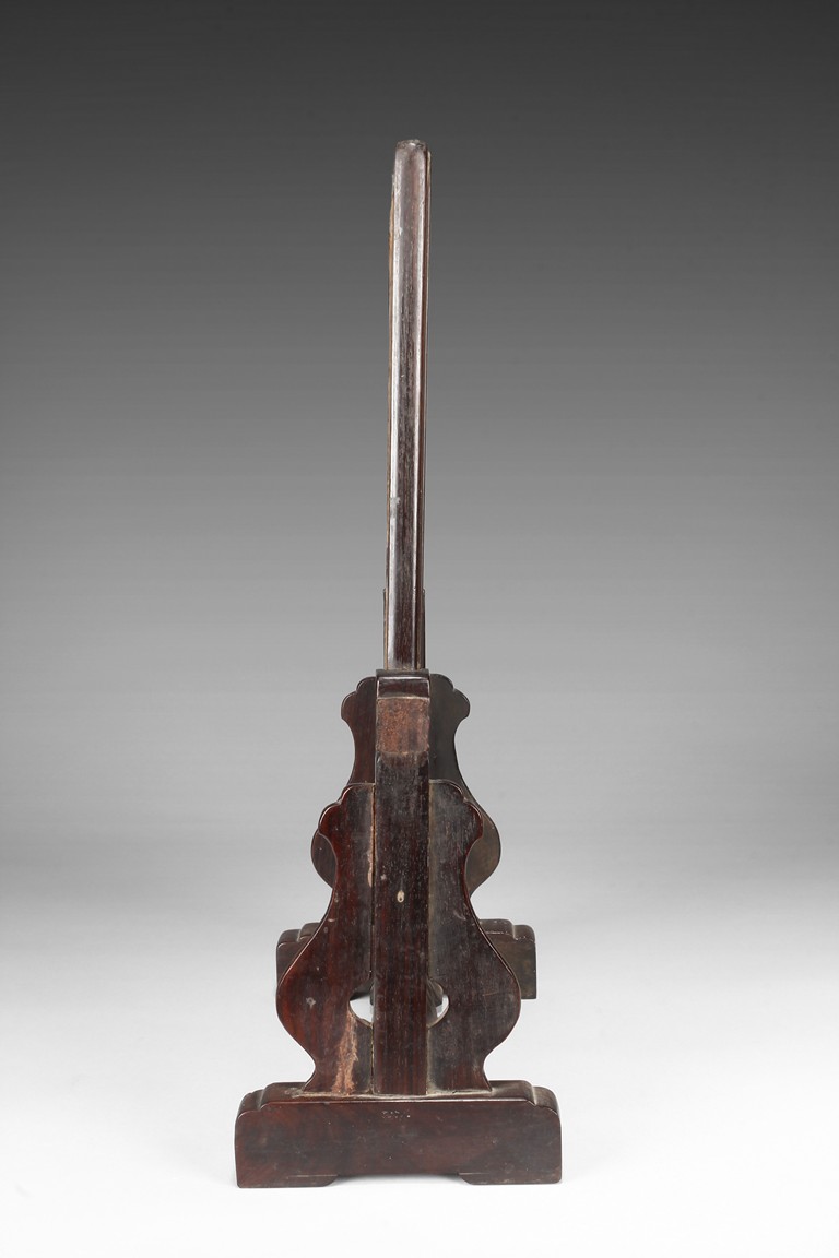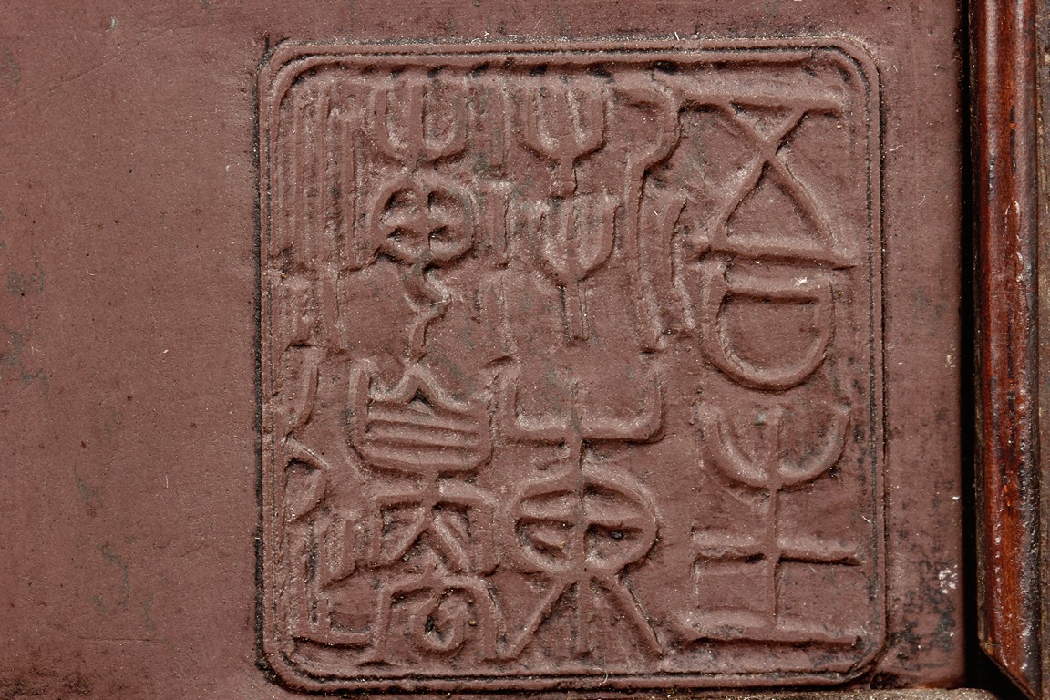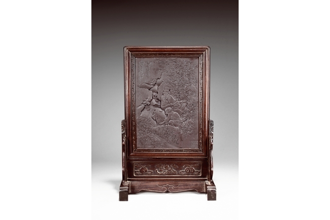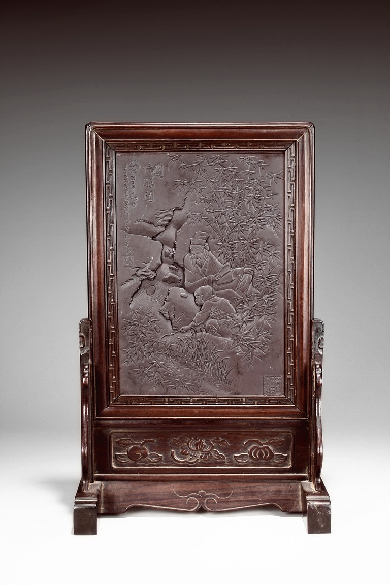 Of rectangular form, the Duan stone plaque depicts an elder and child in a riverside setting, resting near bamboo trees close to downstream , with poetry calligraphy and artist signature on top left, all enclosed in carved wooden frame, inset in original wooden stand, the front low relief carved with lotus flower and plants, the reverse in plain design. Qing Dynasty period.