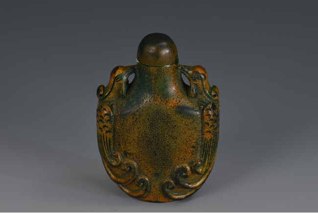 A carved horn snuff bottle with a pair of confronting phoenix. It is completed with a wood stopper. Qing Dynasty period.