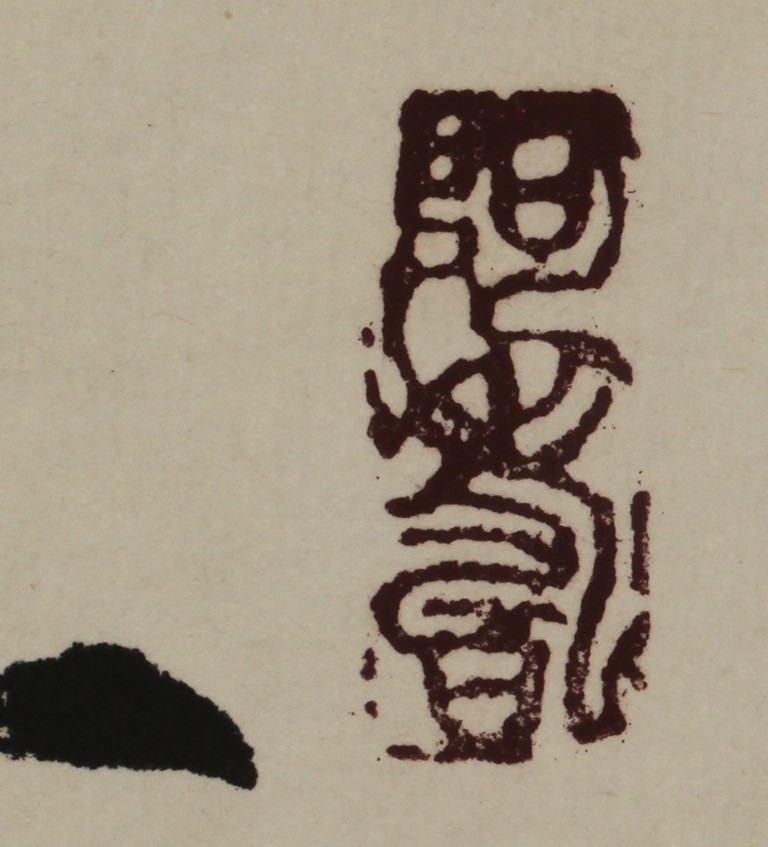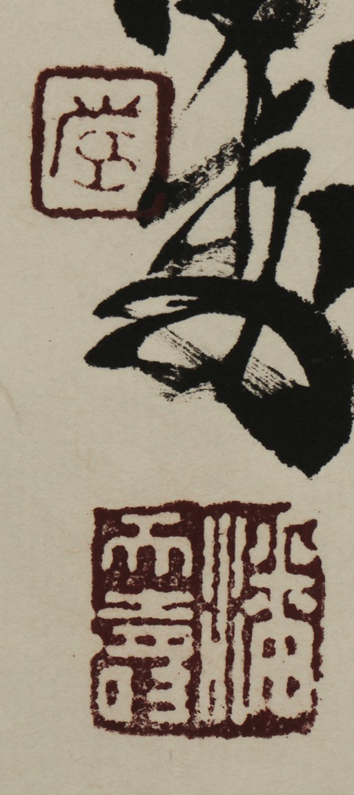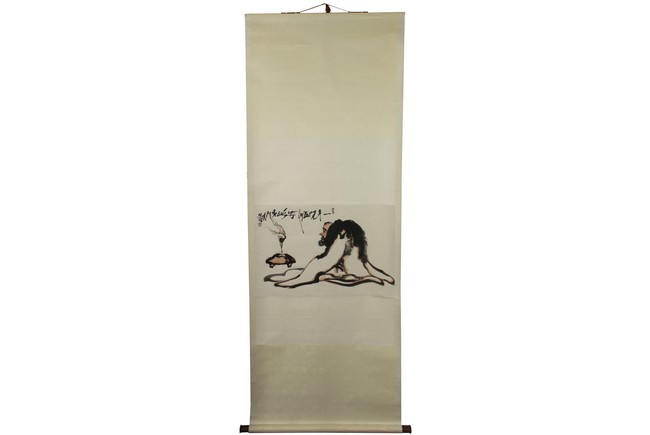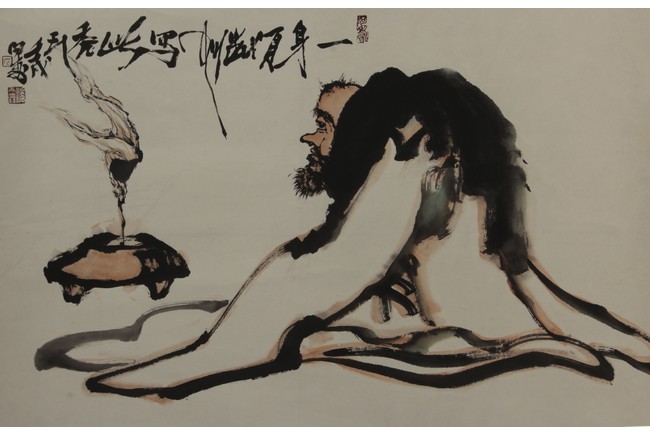 Ink and color on paper painting, hanging scroll. Painting depicts a seated Bodhidharma, facing away, with a censer in front of him. Artist signature and mark 'Pan Tianshou' on top. Attributed to Pan Tianshou.