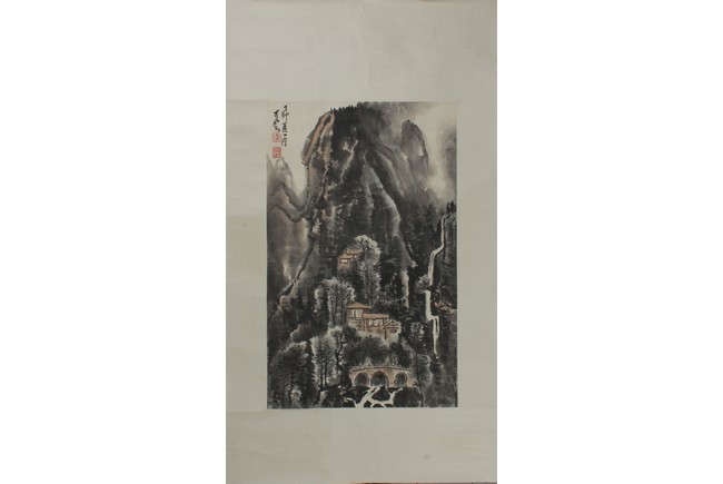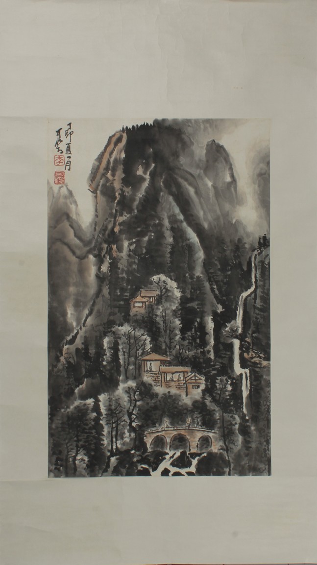 Ink and color on paper, scroll. The painting depicts mountain range scenery, with houses scattered deep within. Artist signature and mark 'Li Keran' on top left'. Attributed to Li Keran.