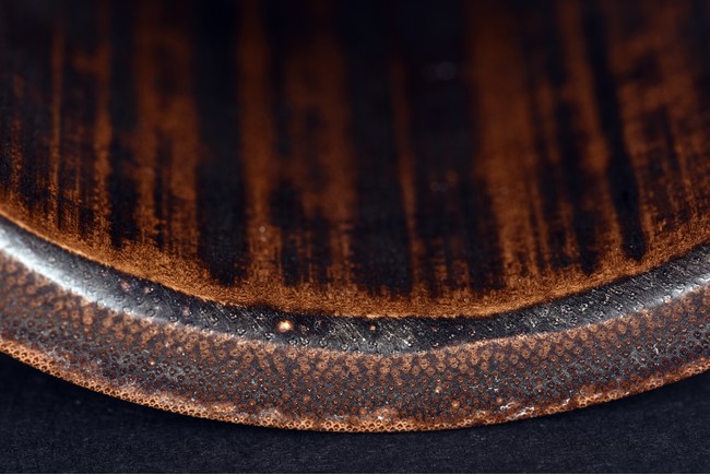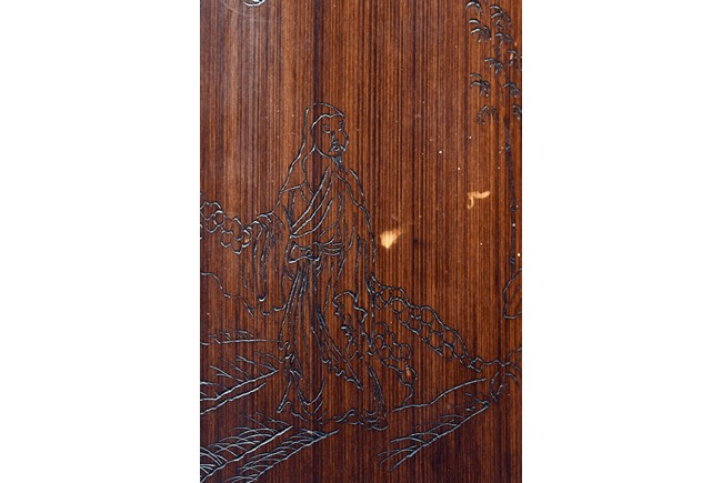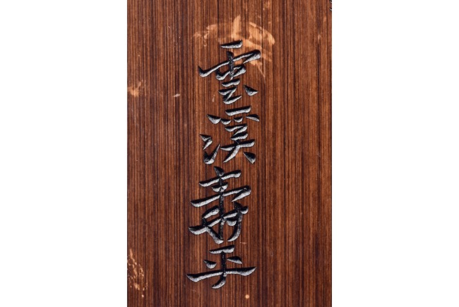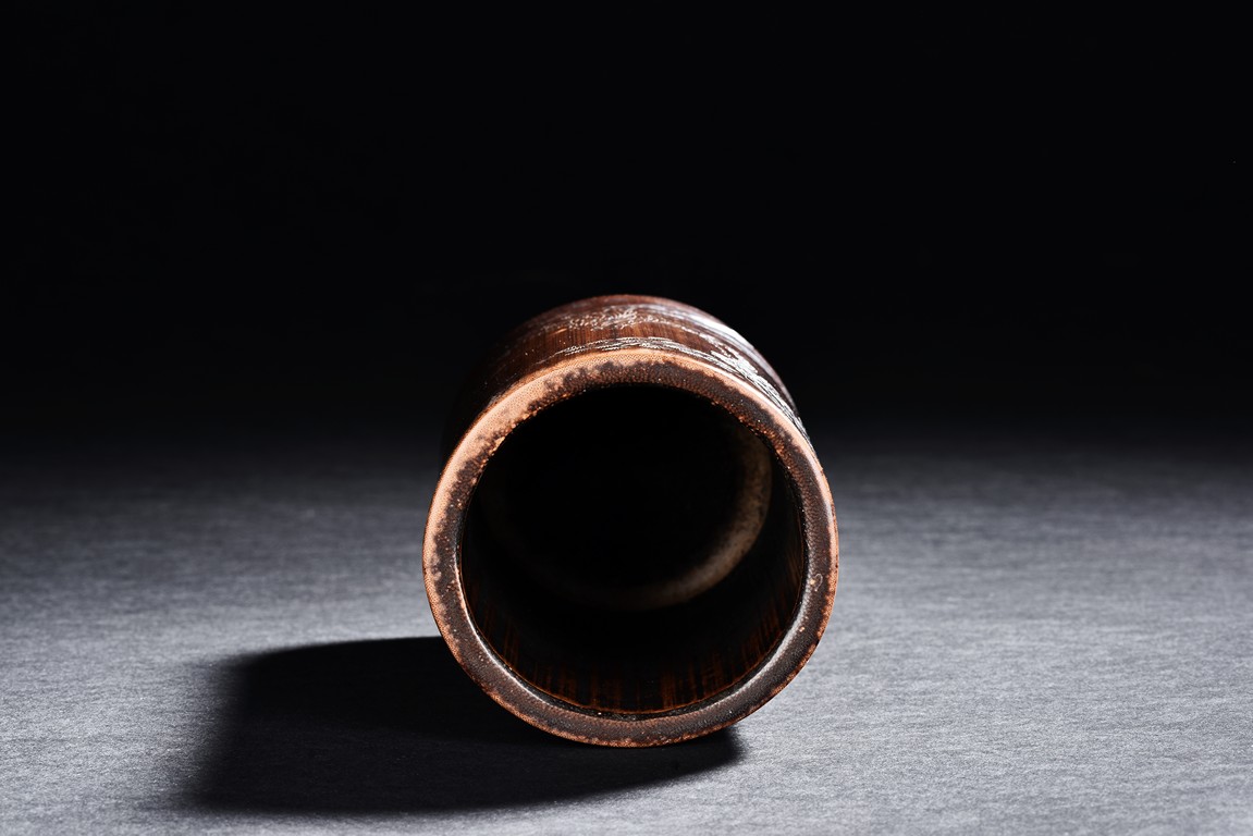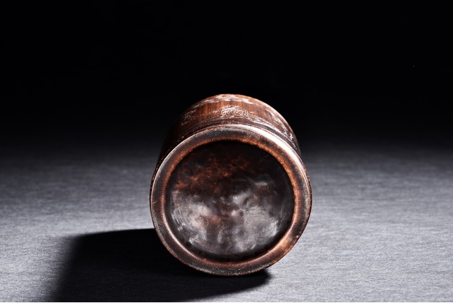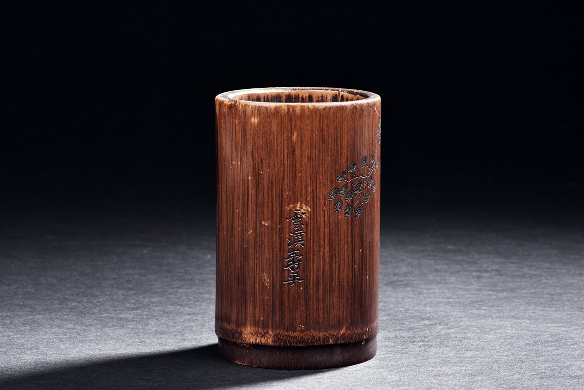 Cylindrical form, the body incised with a figure under pine tree with a four character inscription.
