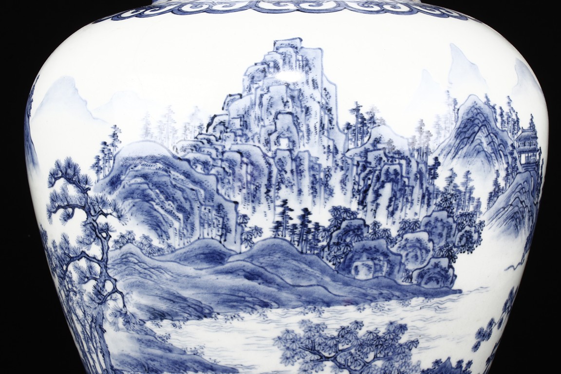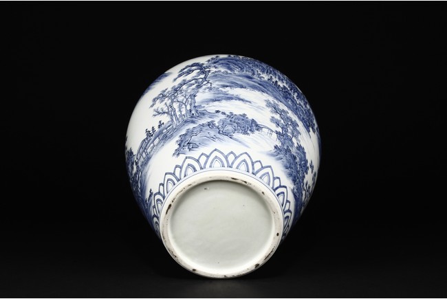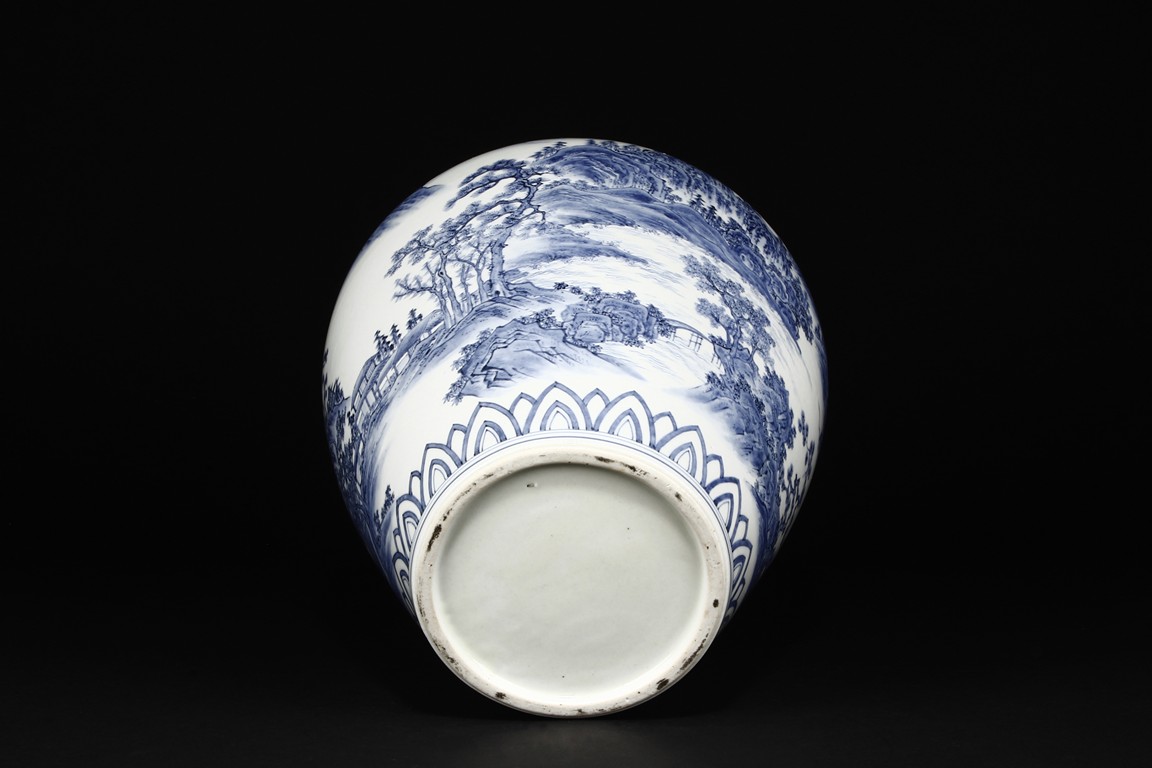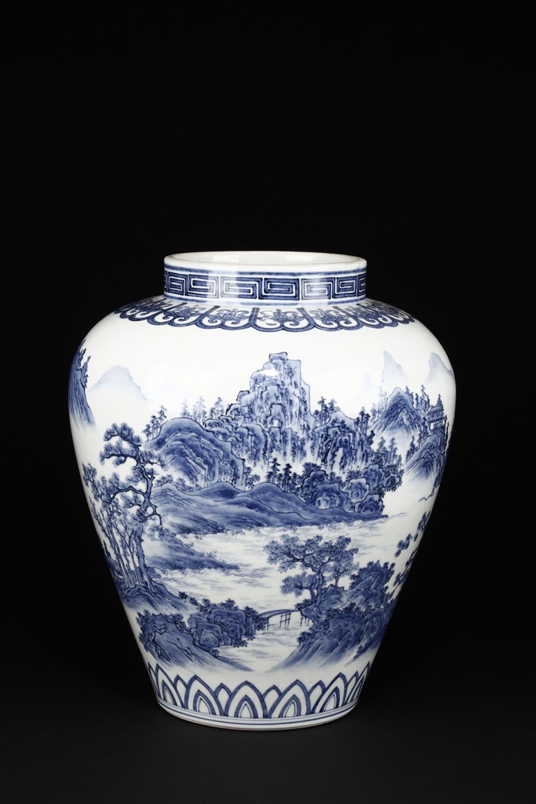 Tapering from the gently curved shoulders, the jar's body depicts a mountain, river, and village landscape scene, between band of lotus petal patterns and band of sectioned flower patterns, and the neck with key-fret patterns. Qing Dynasty Period.