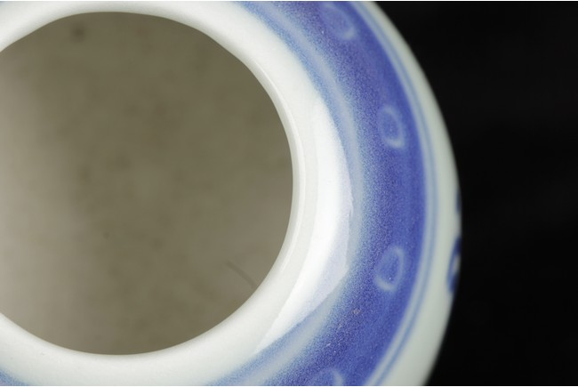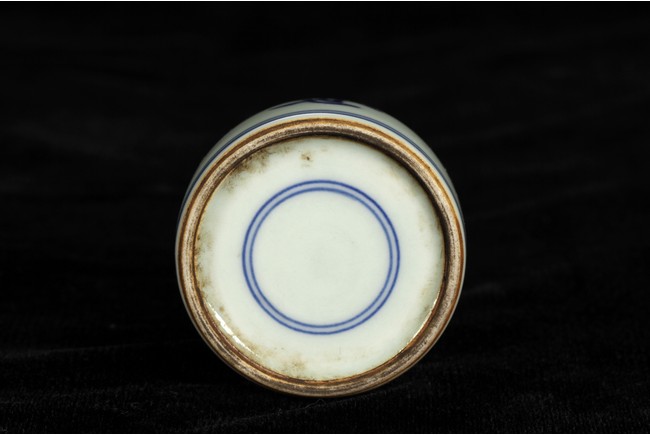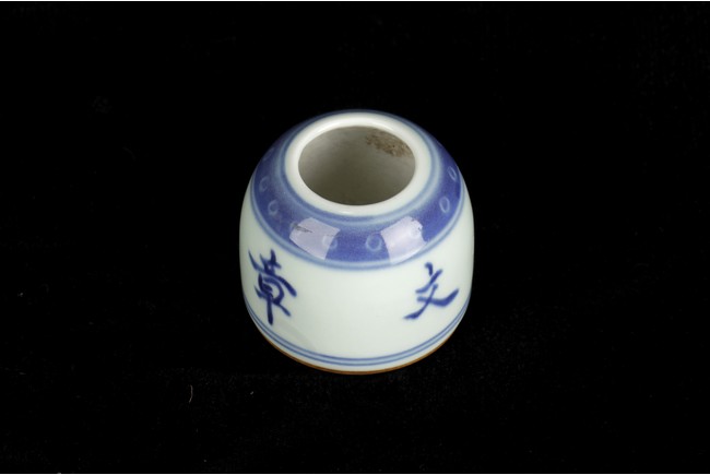 Of dome shape, the blue and white brush washer depicts four Chinese characters on the body, between scrolling double line patterns and scrolling band of round dots, the bottom with double ring pattern. 19th century.