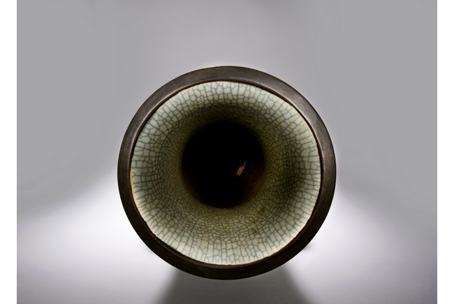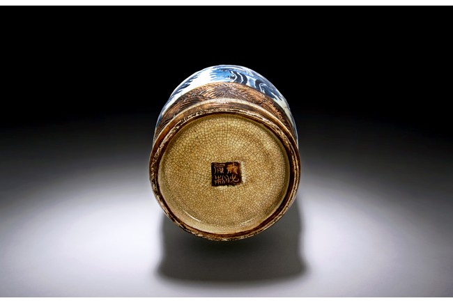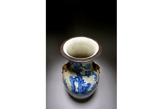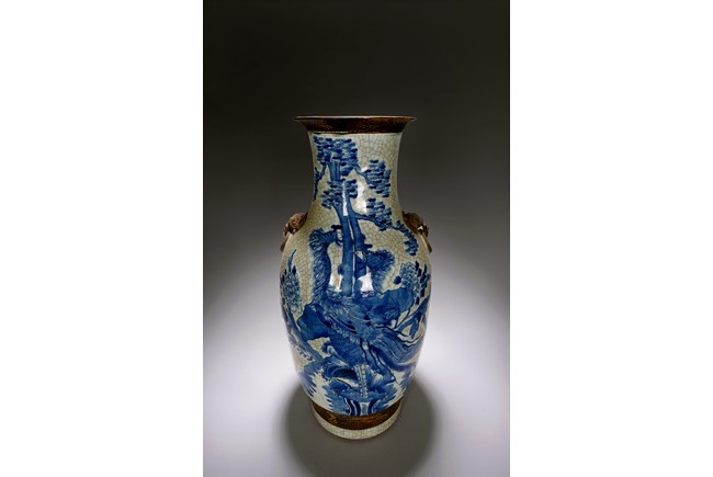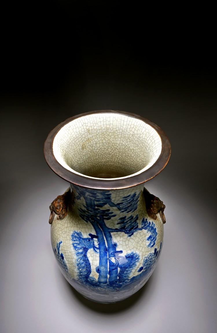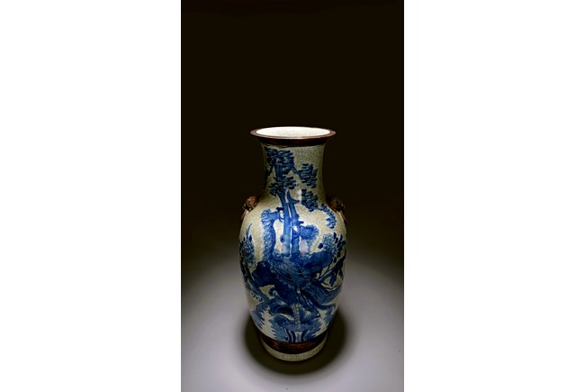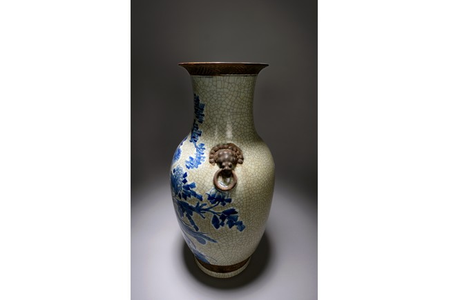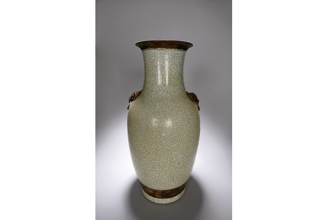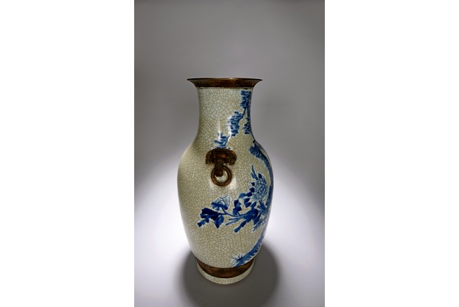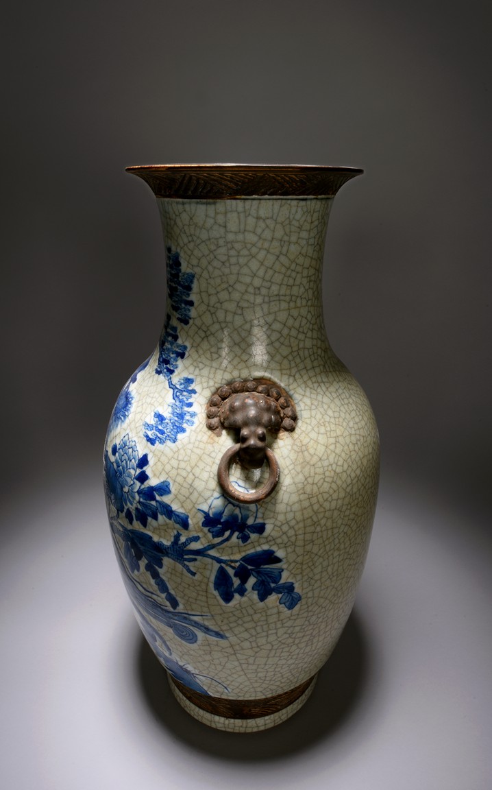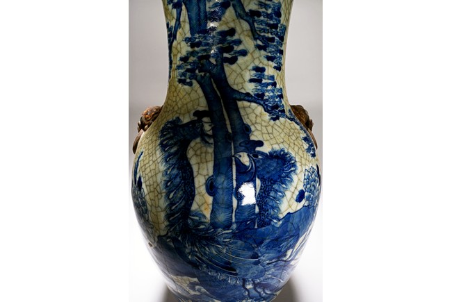 The vase finely painted with two phoenix against white celadon glaze ground with fine crackles, flanked by two mythical beast ring handles, the base with four character mark 'CHENGHUA'. Qing Dynasty period.
