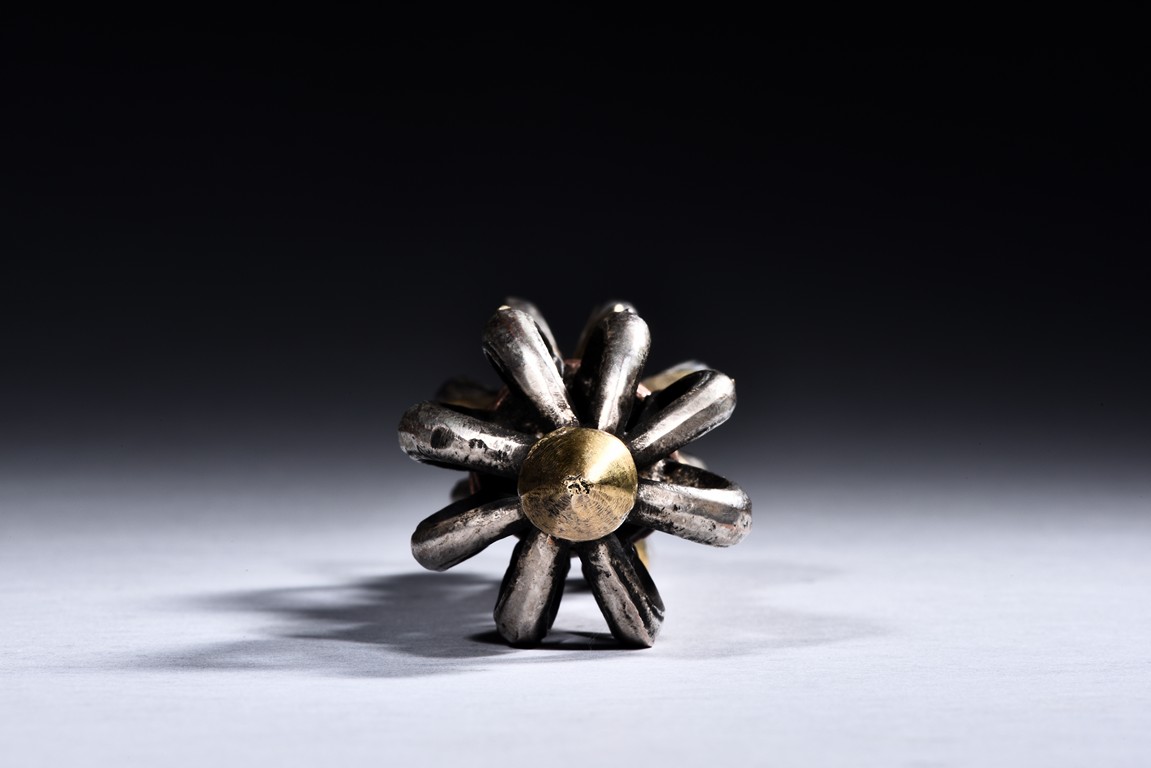 The rounded eight-pronged vajra with knob center finely cast in silver and bronze