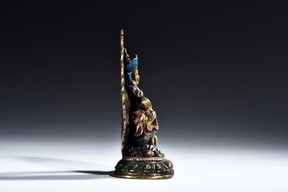 Set on a lotus throne and enamelled in red, green, and blue, the bodhisattva is shown standing upon a Buddhist lion, his large belly exposed, face with stern expression and wearing pointed crown, backed by a large throne back-slab.