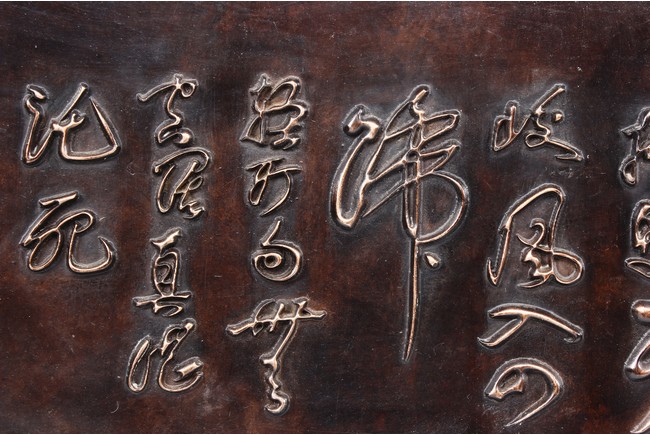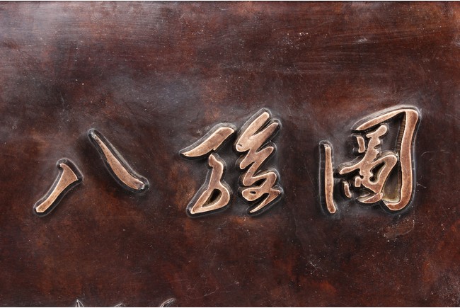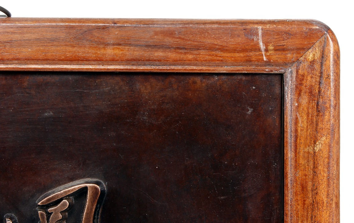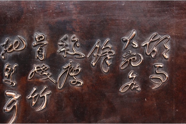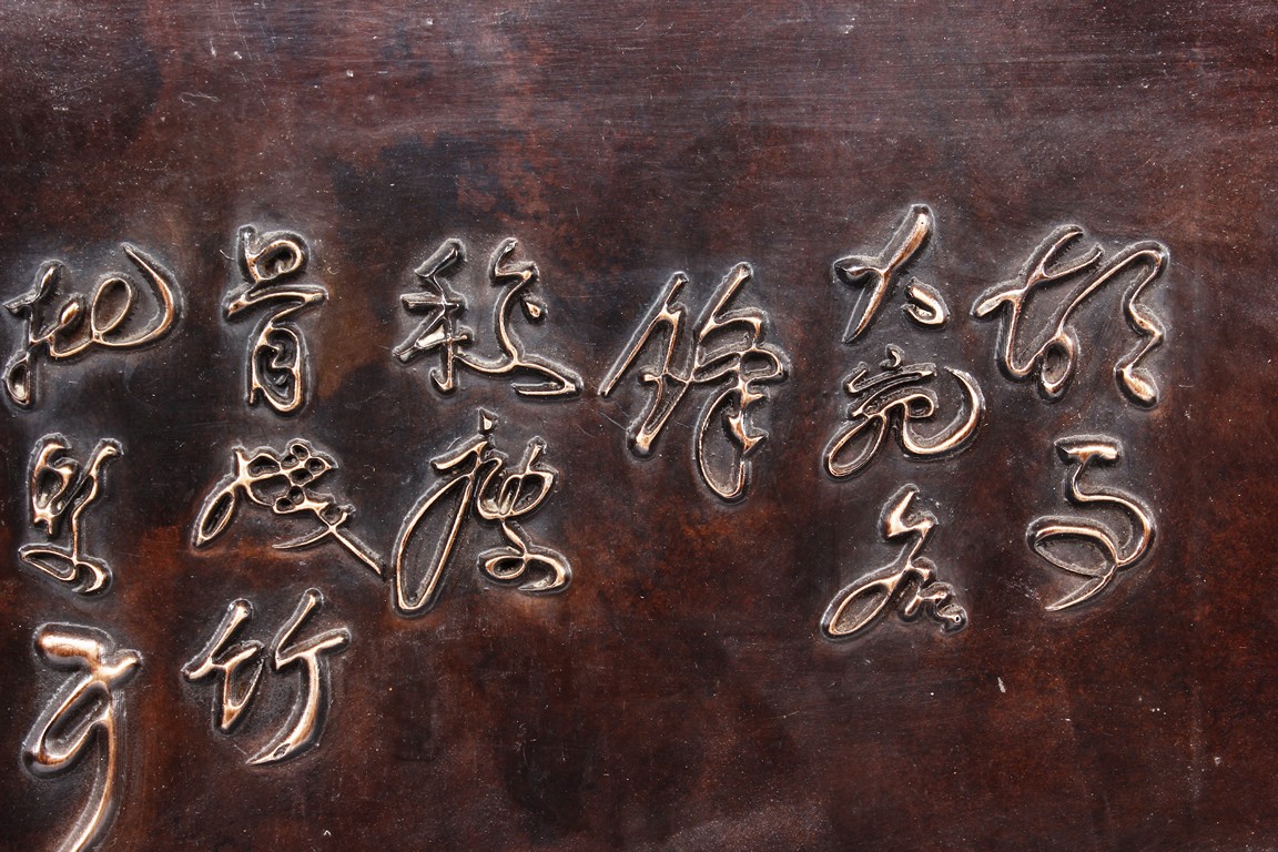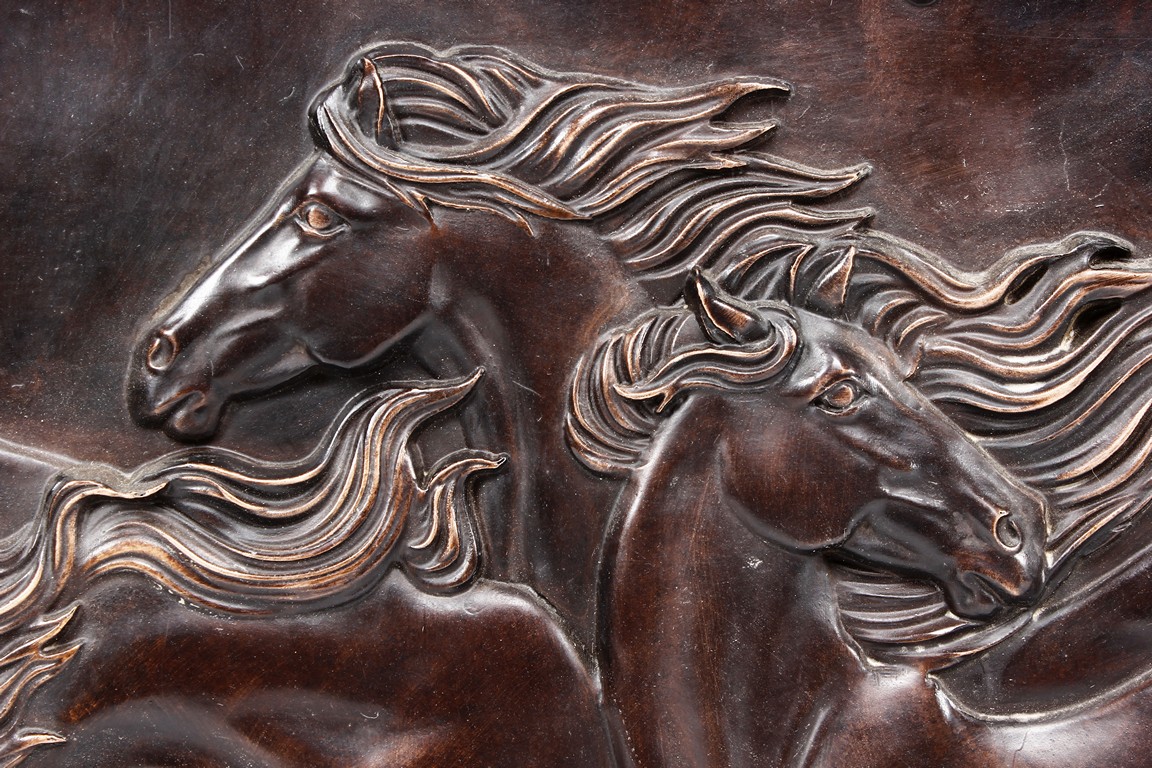 The bronze rectangular panel is cast in relief with eight horses sprinting with inscriptions above.