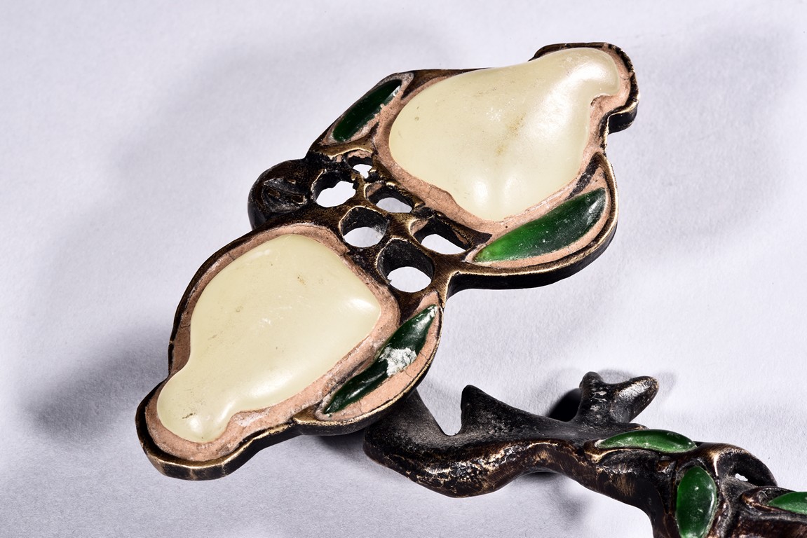 A BRONZE GEMS INLAID 'LINGZHI' RUYI SCEPTER 銅鑲玉如意