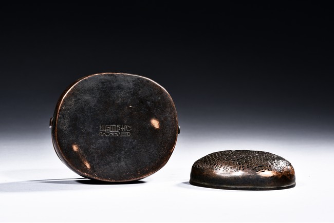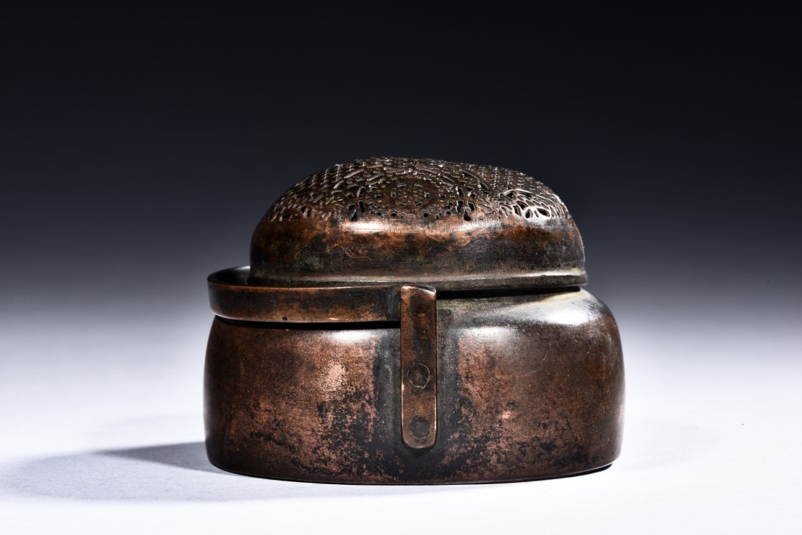 Of cylindrical form with a swing handle, the cover pierced with openwork floral pattern. The bottom bears three character mark 'Zhang Ming Qi'. Qing Dynasty period.
