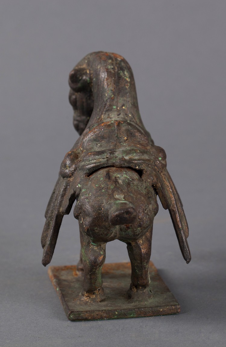 The bronze figure depicts a horse rising his front right hoof high in the air, ready to gallop forward. It has beautiful mane, and has an elaborate saddle on the back.