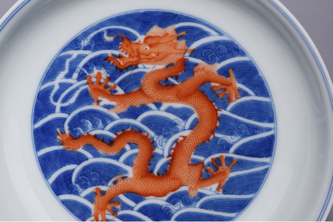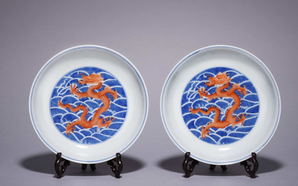 Each dish has rounded sides that flare at the rim, decorated on the interior with a medallion of an iron-red dragon leaping against a background of cresting waves, and on the exterior with a similar frieze of three dragon against waves. The base with six character QIANLONG mark.