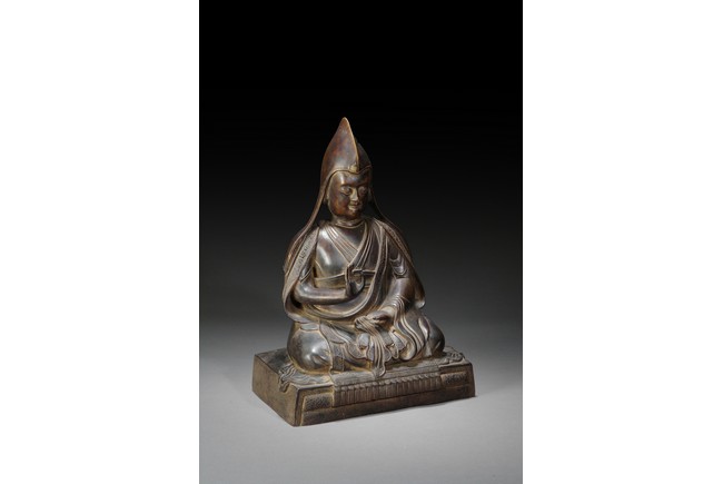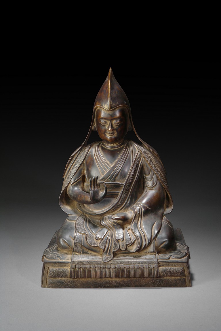 The well casted Tsongkhapa bronze figure is seated on a rectangular pad, with flowing robes, and traditional hat, in praying pose. Qing Dynasty period.