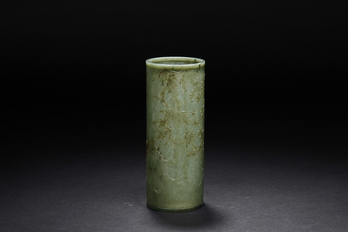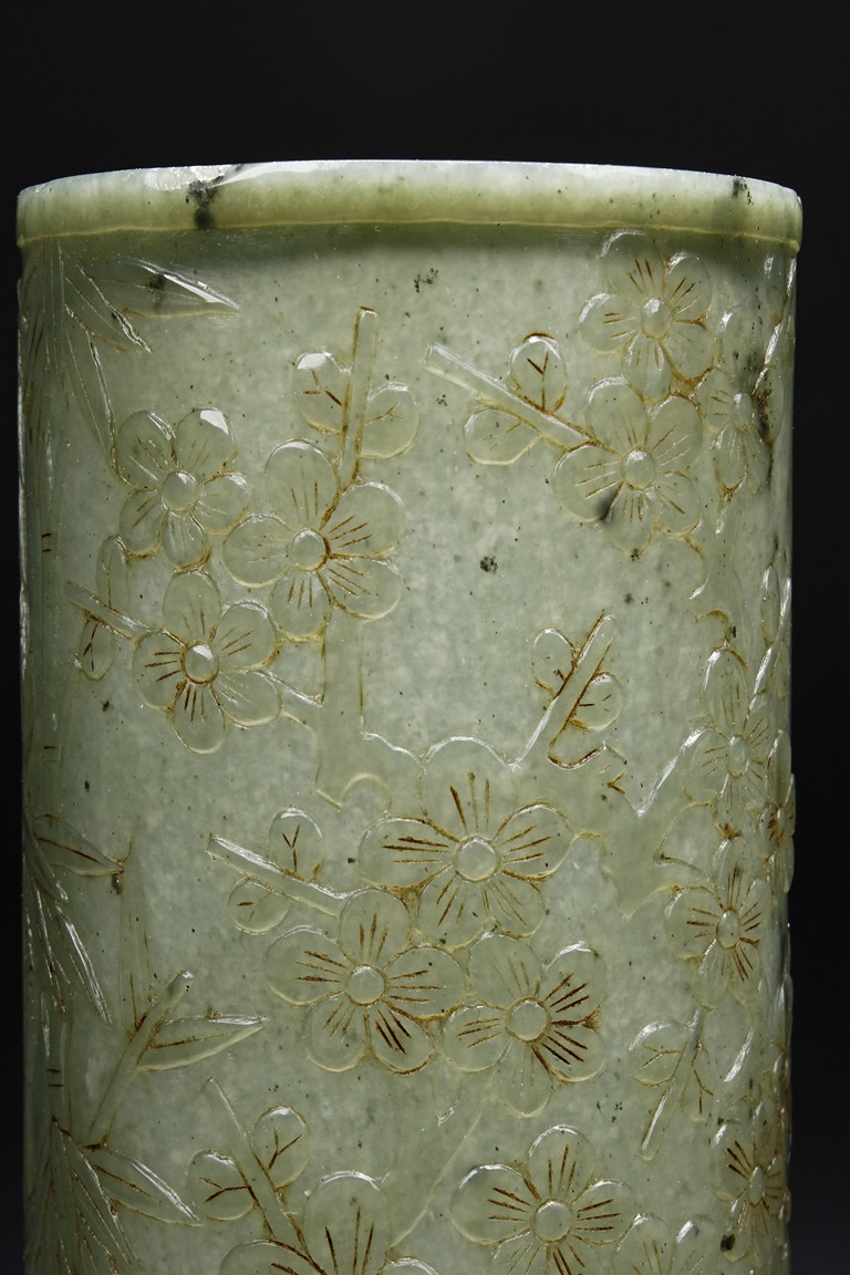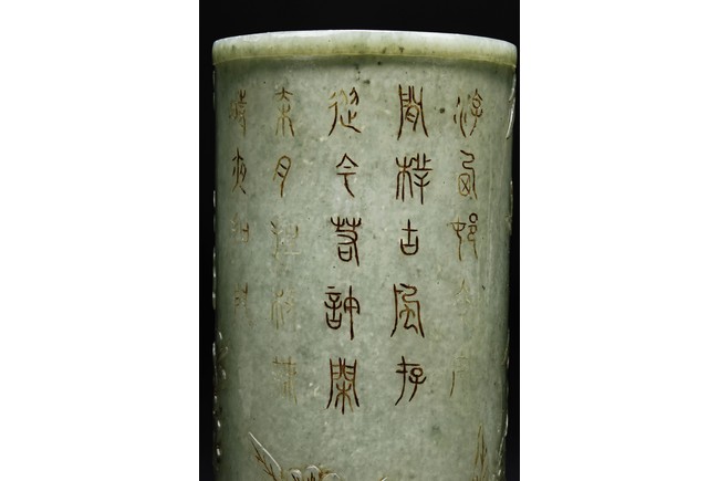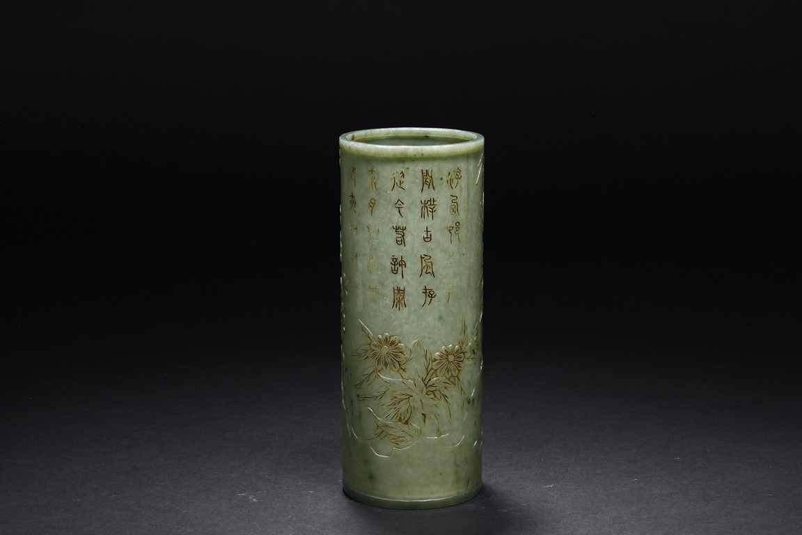 The brush pot is carved in cylindrical form, the exterior finely incised with poems in seal format, above a continuous landscape of plum, chrysanthemum, and bamboo issuing from rockwork. The bottom bears four character mark. The stone is of celadon tone. Republic period.