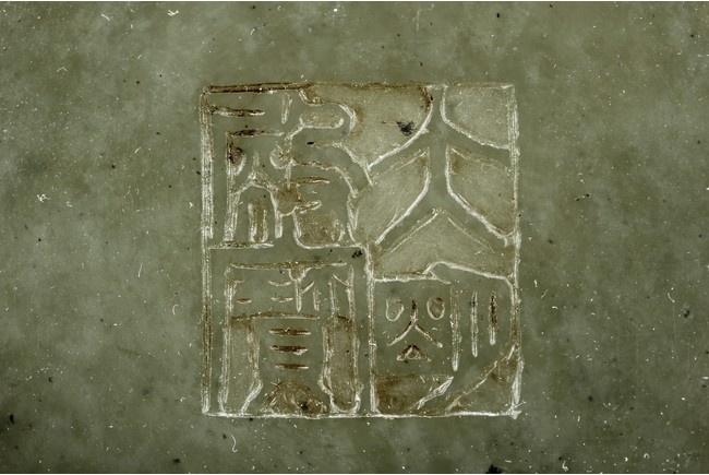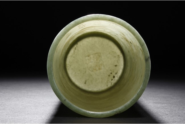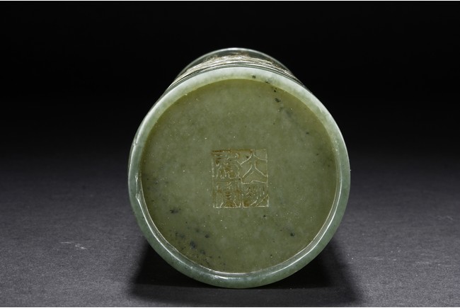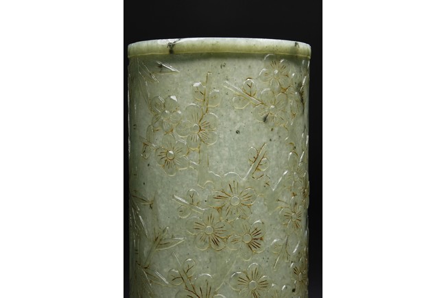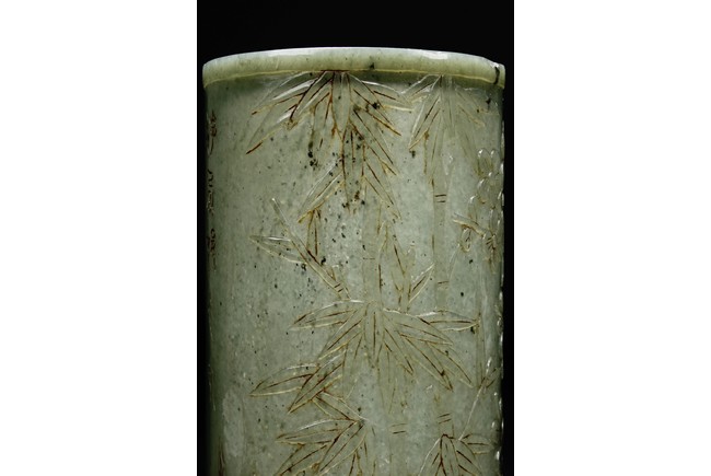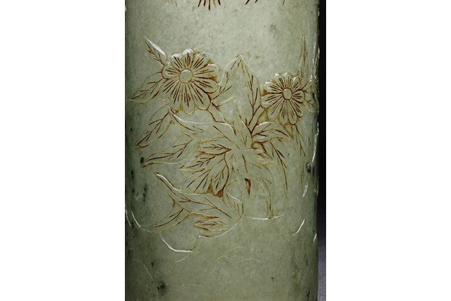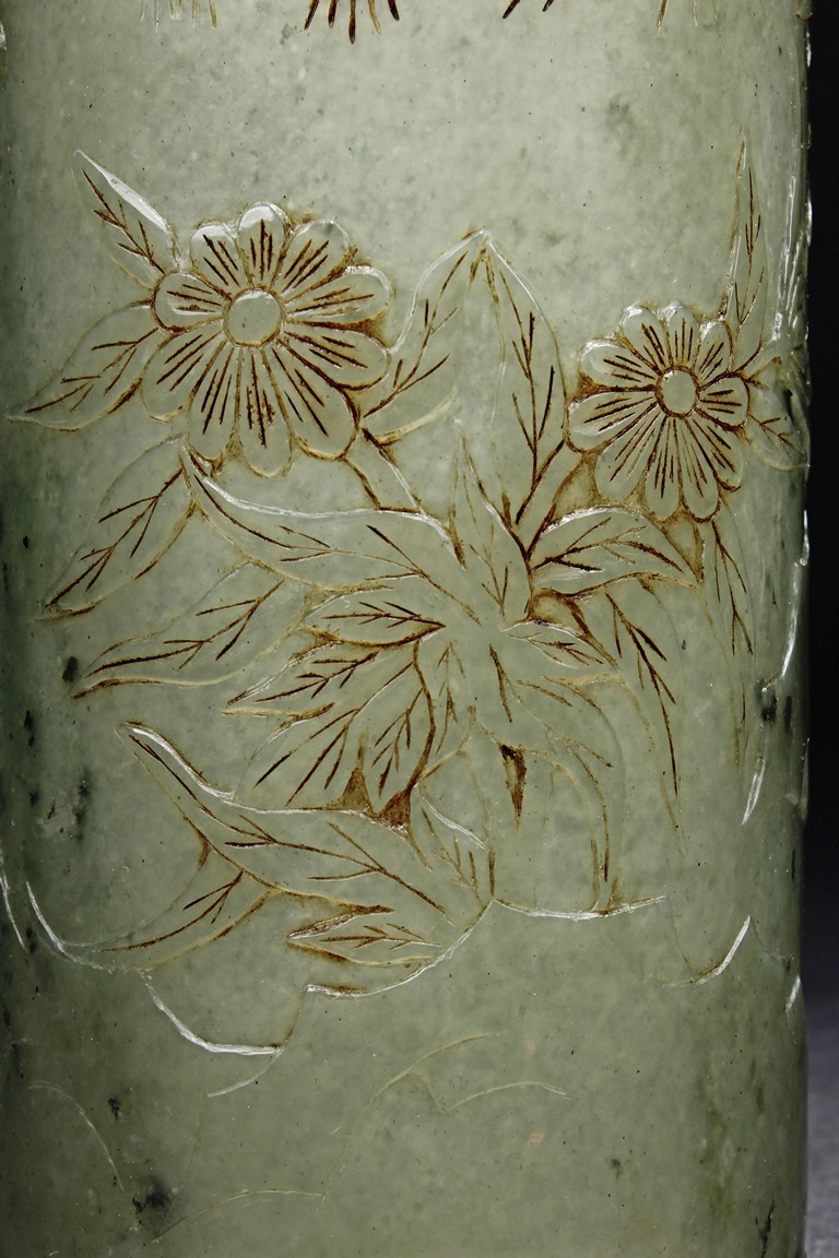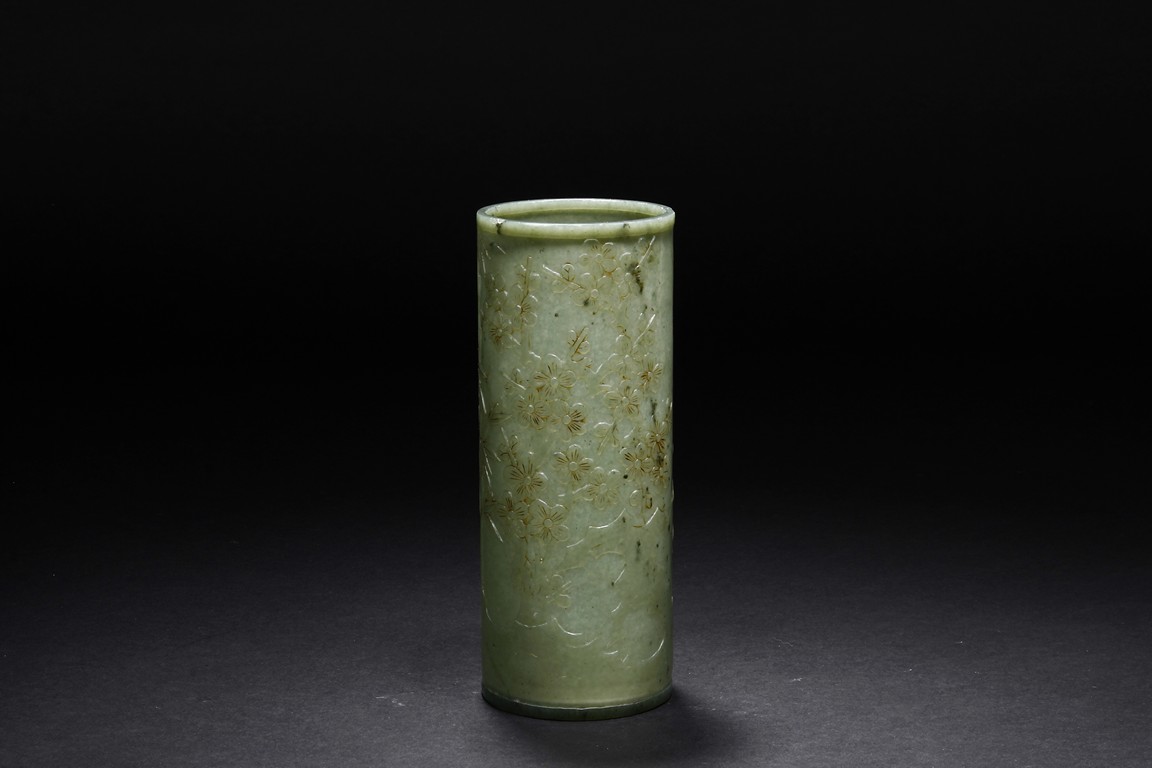 The brush pot is carved in cylindrical form, the exterior finely incised with poems in seal format, above a continuous landscape of plum, chrysanthemum, and bamboo issuing from rockwork. The bottom bears four character mark. The stone is of celadon tone. Republic period.