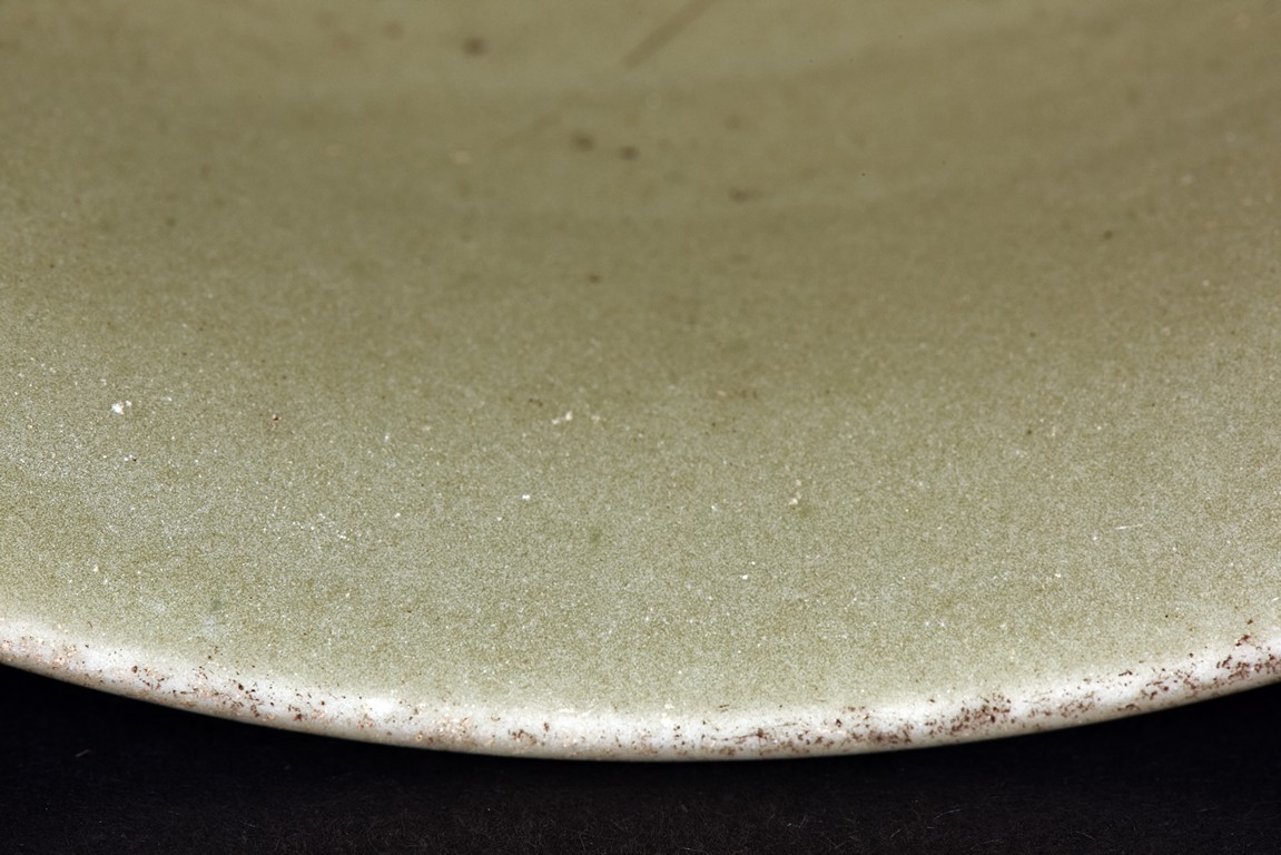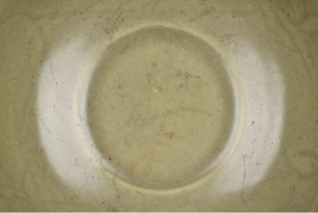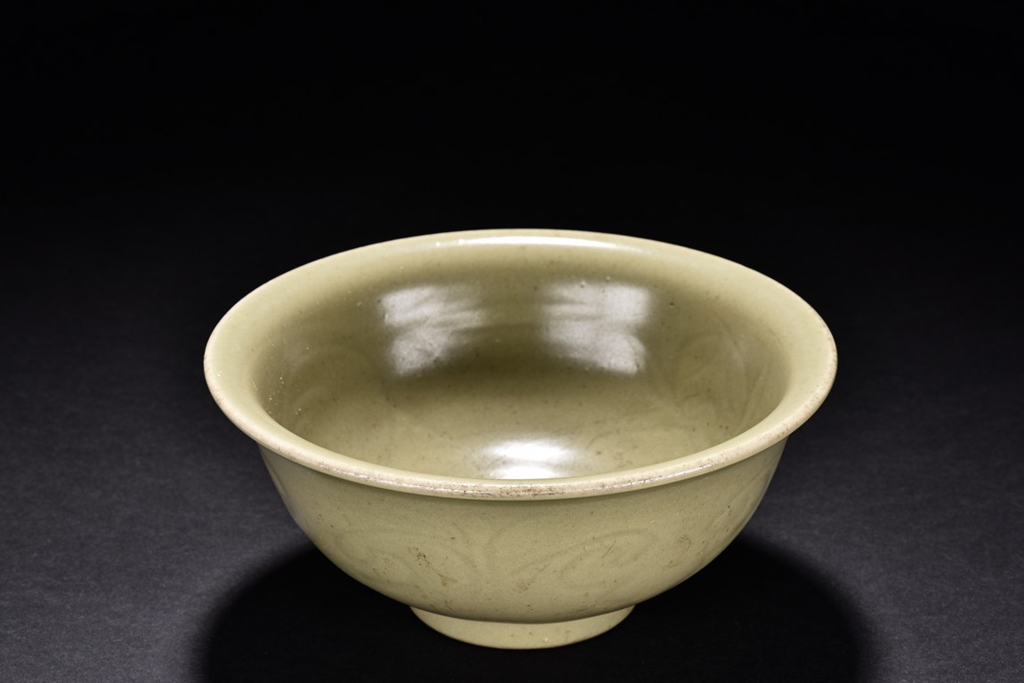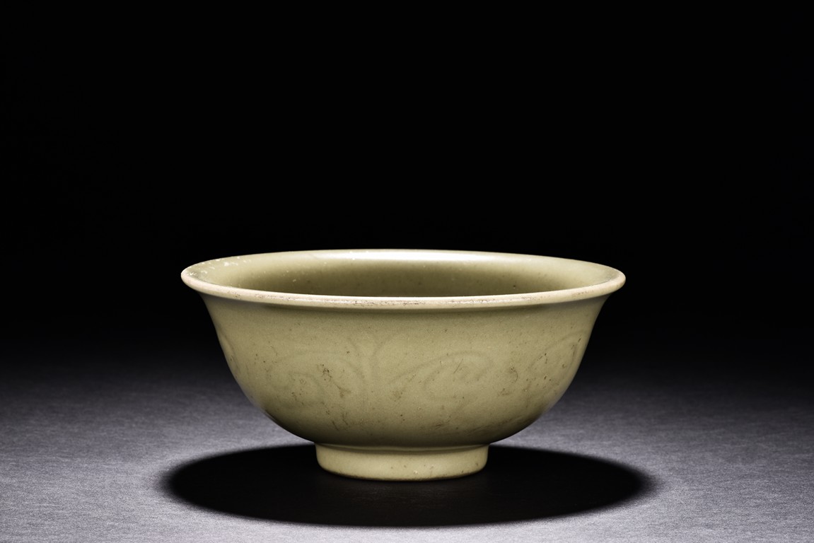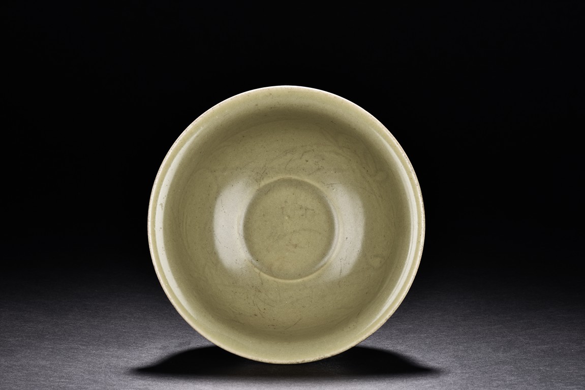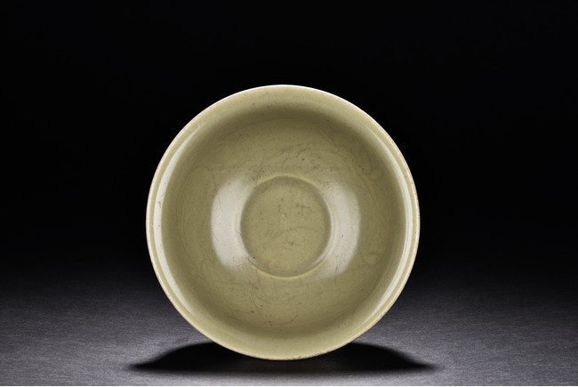 rising from a circular foot ring, it is overall covered in celadon glaze with shallow floral motif to the exterior and interior. Qing Dynasty period.