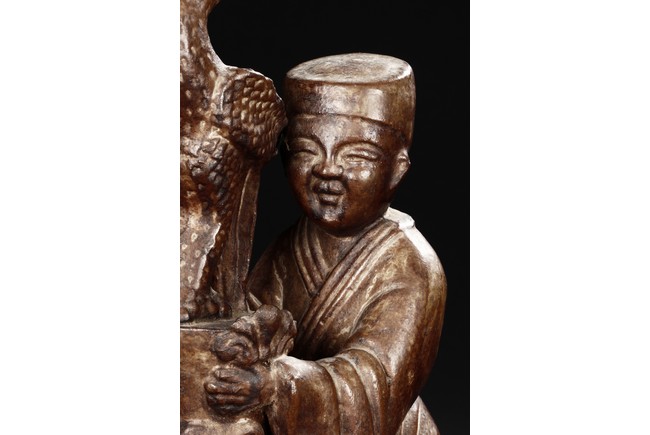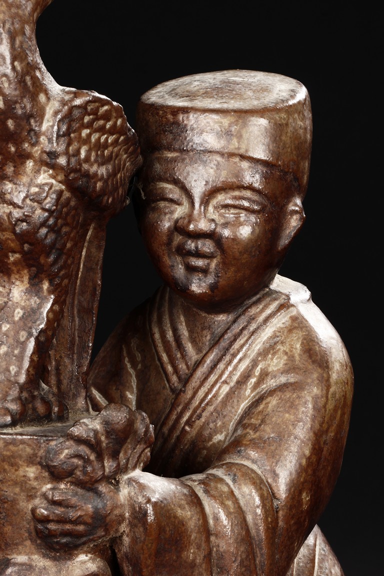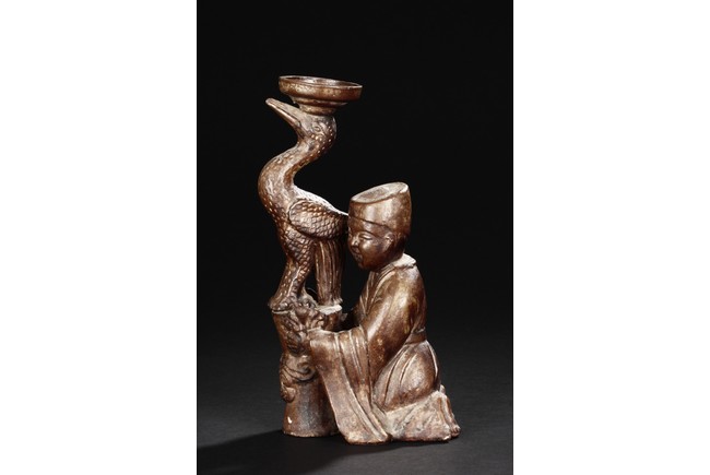 Carefully sculpted, the ceramic candleholder depicts a robed man kneeling in front of a drum-shaped column, which mounts a crane with head raised high, holding a bowl for the candle, all glazed in dark brown with excellent patina.