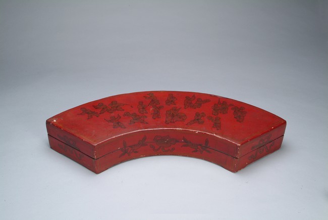 The box is shaped like a fan, with many playful children on the top cover; flower patterns on the edges.