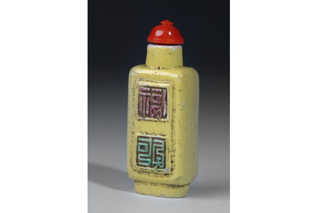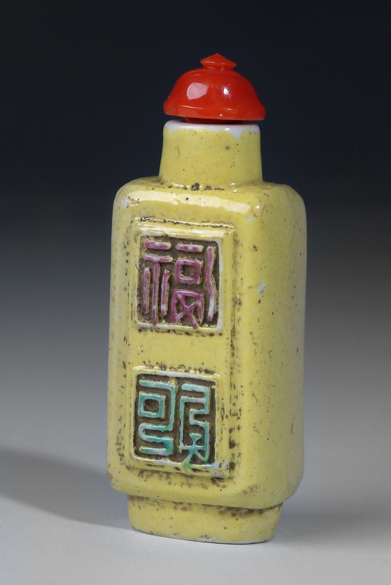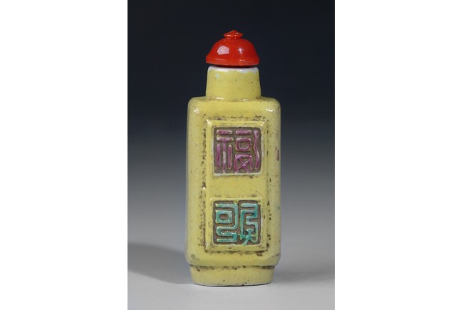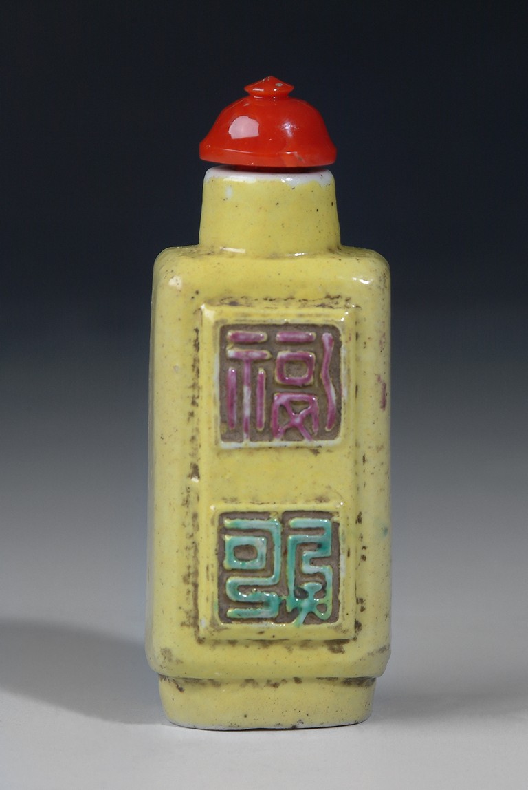 This yellow glazed square porcelain snuff bottle with four molded 'Shou' characters on the two sides, each molded character was glazed with an accent color. The bottle was completed with a coral stopper. Qing Dynasty period.
