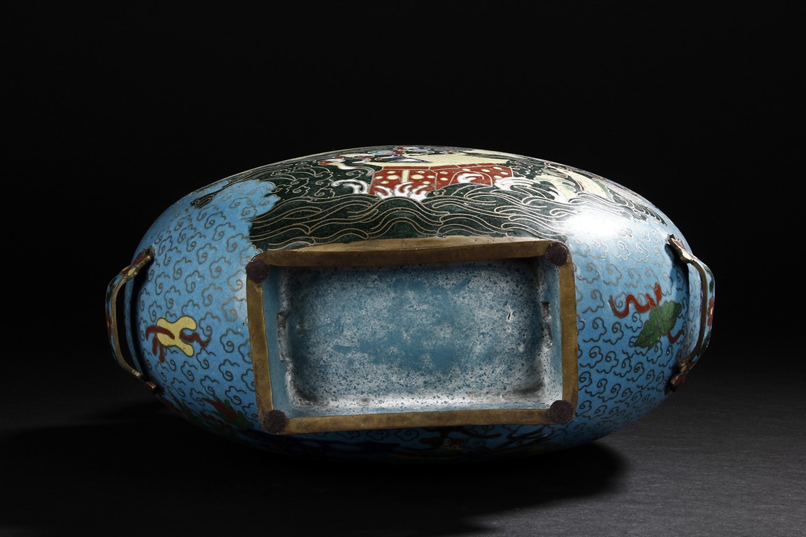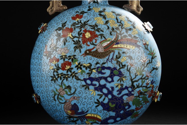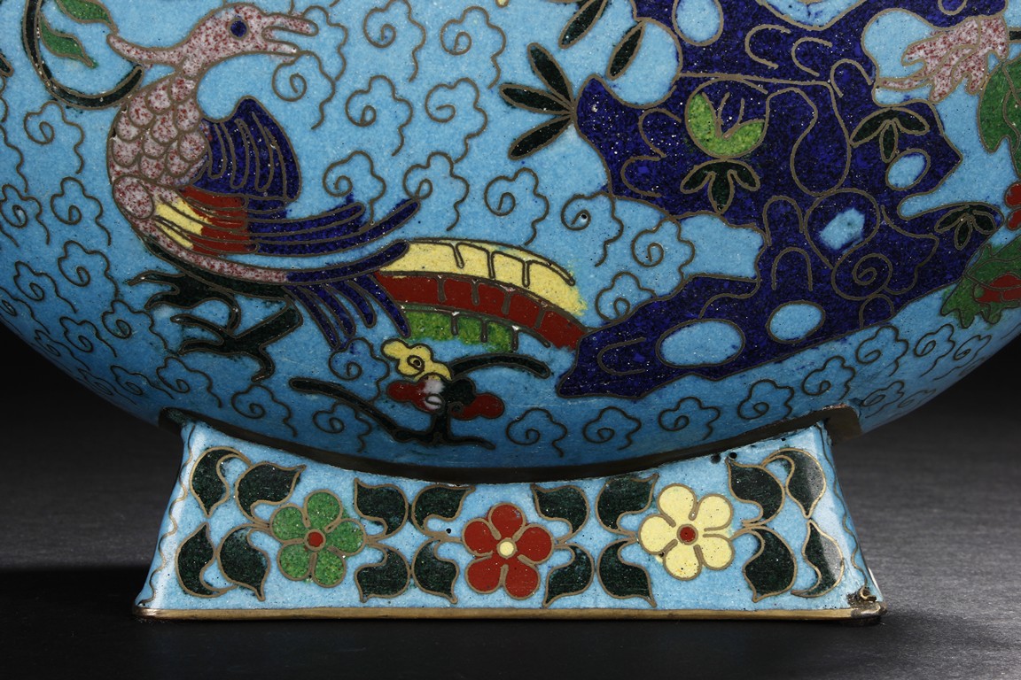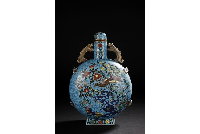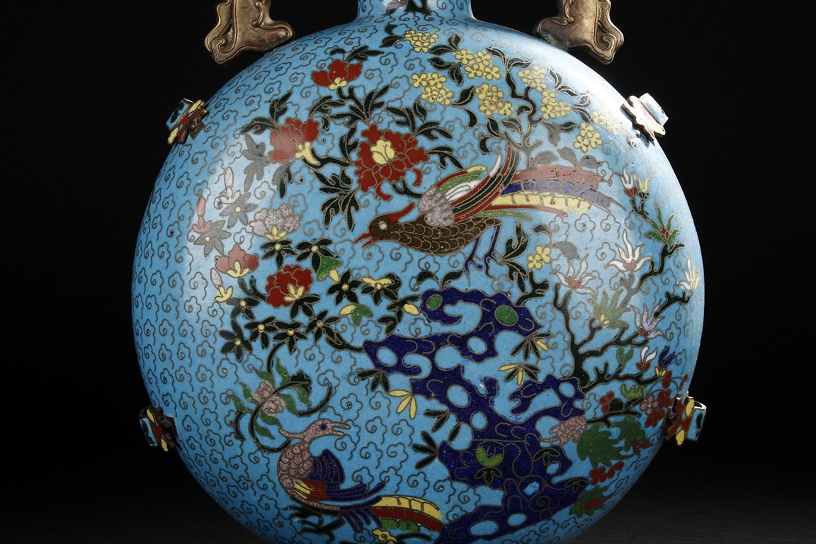 Of flattened circular body, the moonflask is enamelled on one side with scene of carp jumping over the dragon gate, the other side with two phoenix amongst leafy flowers issuing from rockwork, all reserved on turquoise ground with auspicious cloud motifs. The neck further decorated with two gilt mythical beast handles. Early 20th century.