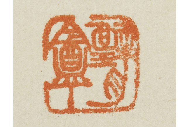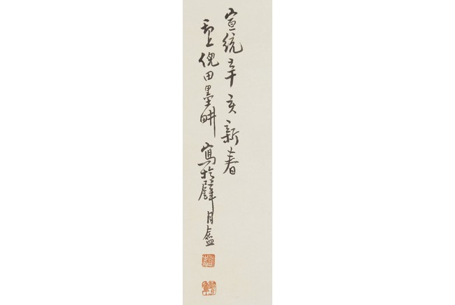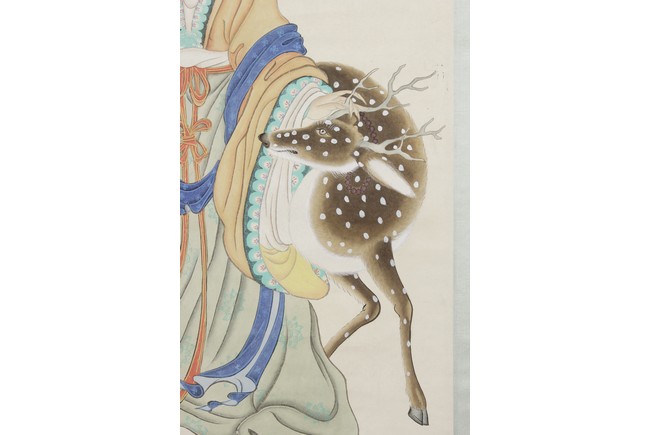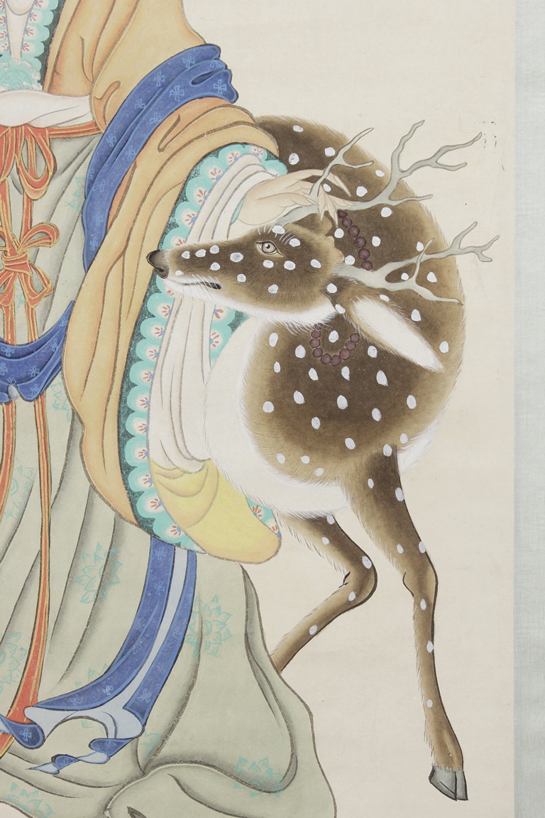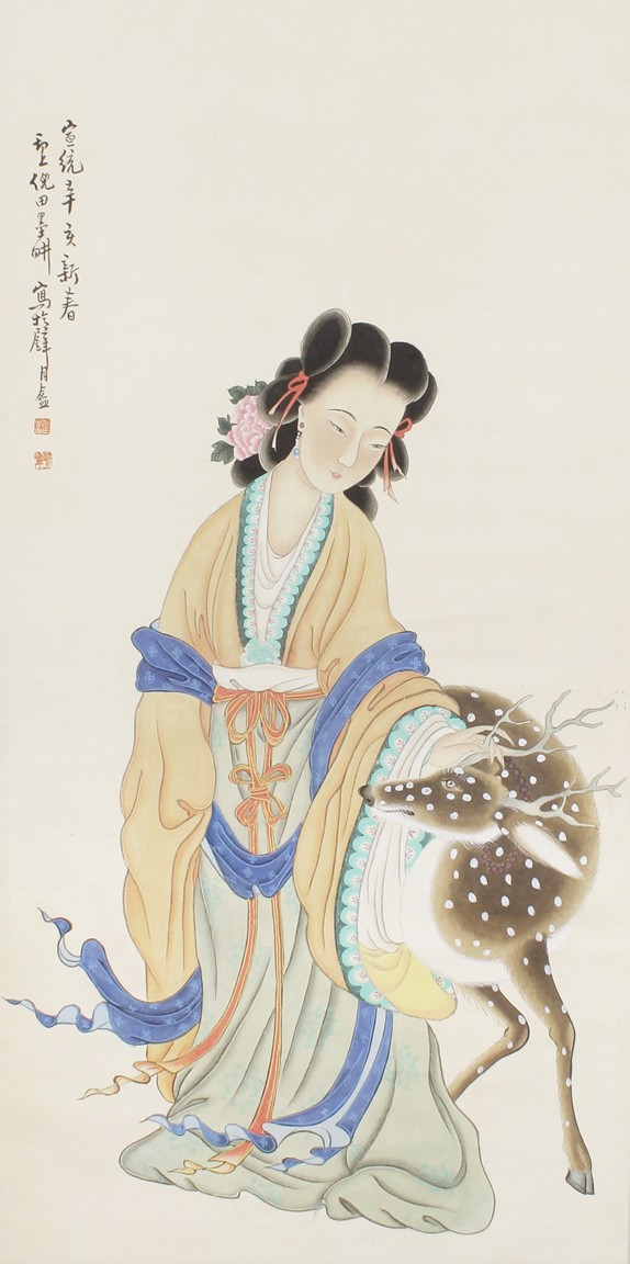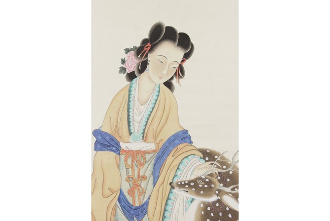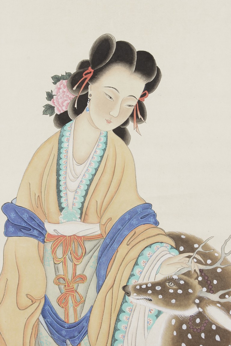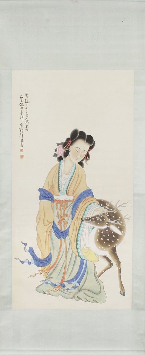Color and ink on paper, hanging scroll. The painting depicts a well dressed beauty sympathetically petting a sika deer with prominent stags and spot patterns. Chinese colophon, artist signature and mark on the top left corner.