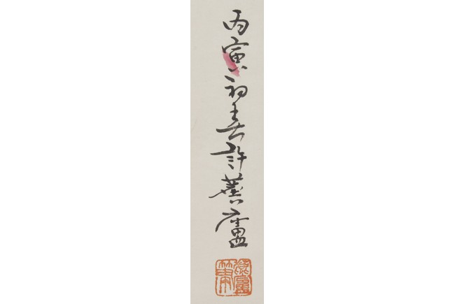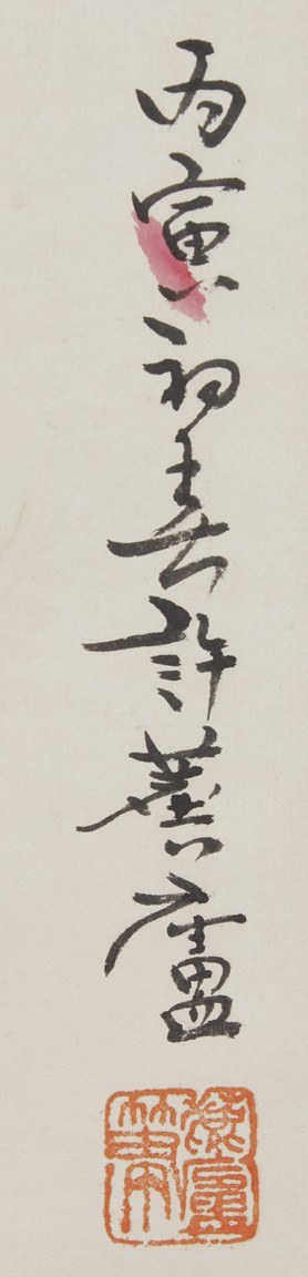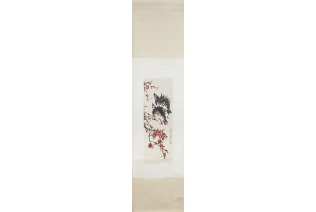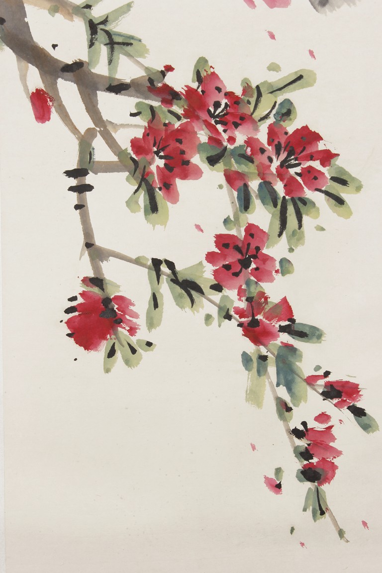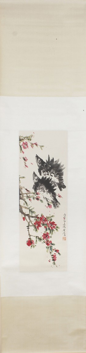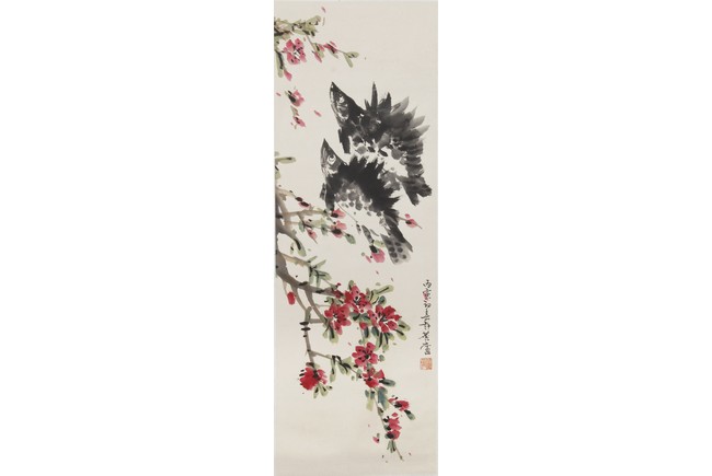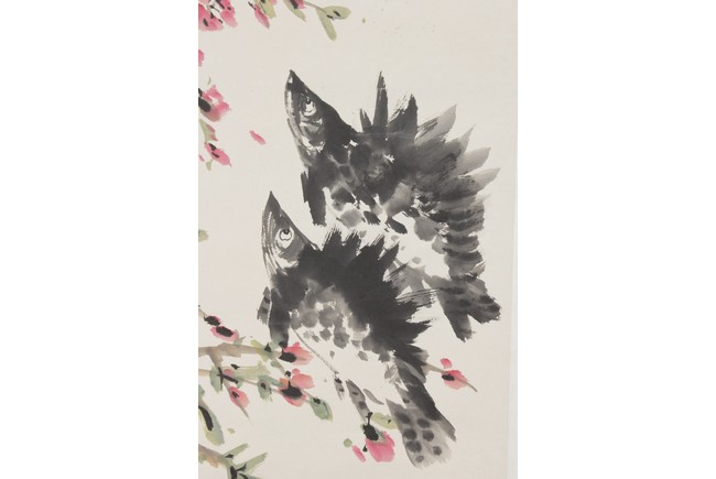 Color and ink on paper, hanging scroll. The painting depicts two fishes swimming up the river against the reflection of blossoming flower tree. Artist signature and mark 'Xu Linlu' on the right side.