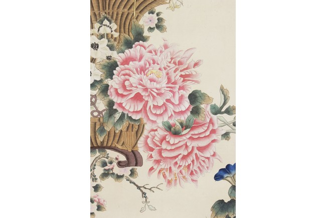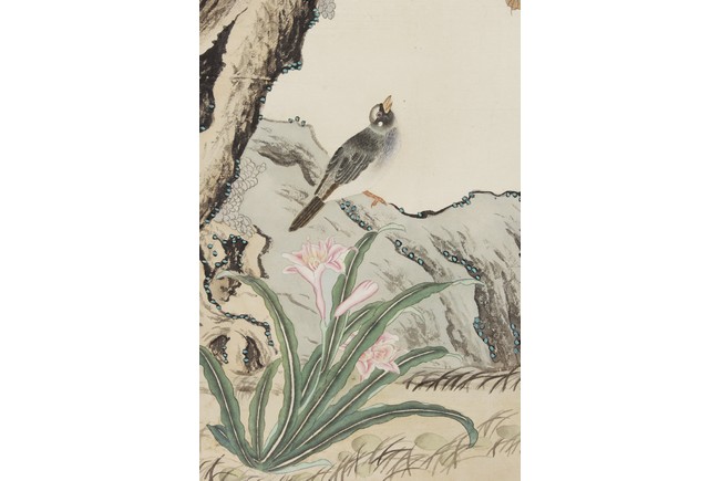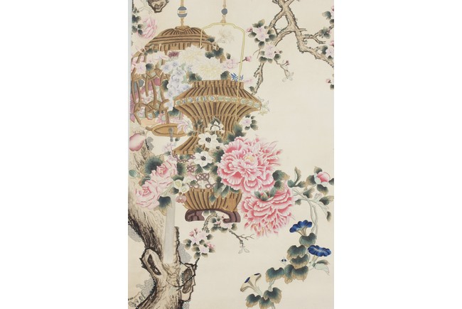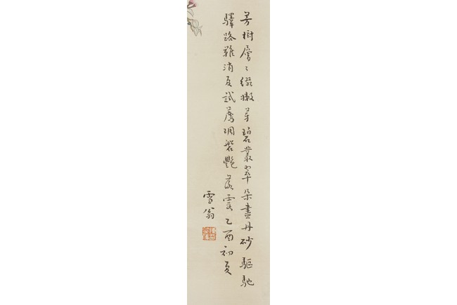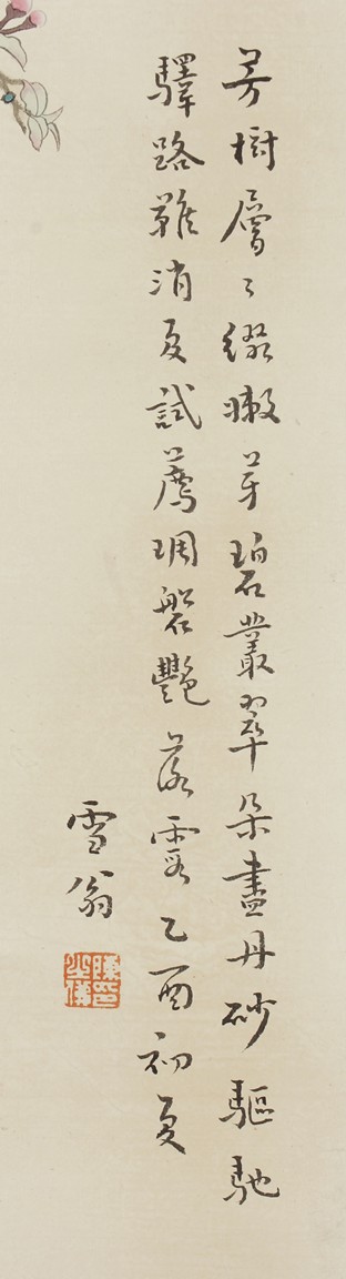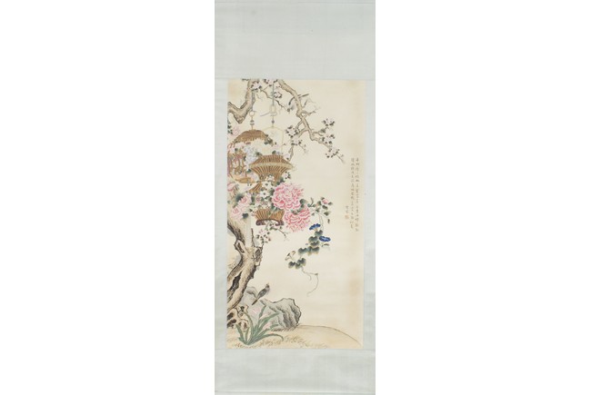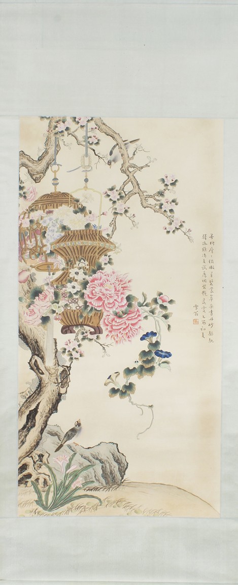 Color and ink on paper, hanging scroll. The painting depicts a scene of blossoming flowers on a tree with flower baskets, and two birds perched on stone and branch. Chinese colophon, artist signature and mark 'Chen Zhifo' on the right side.