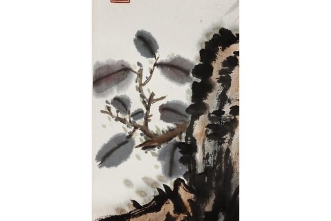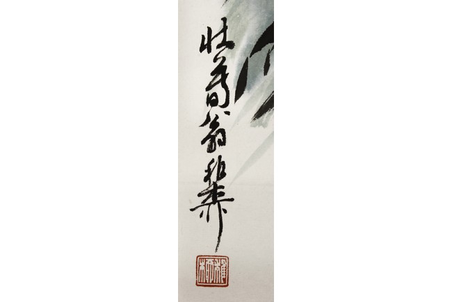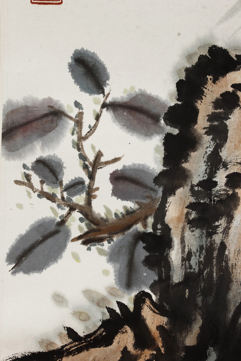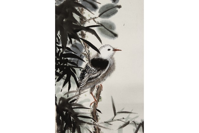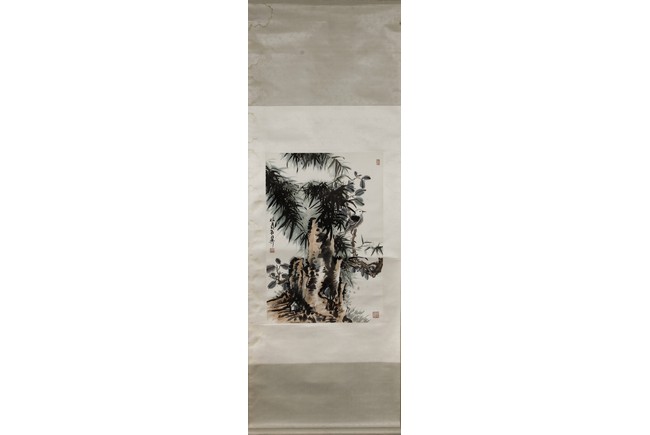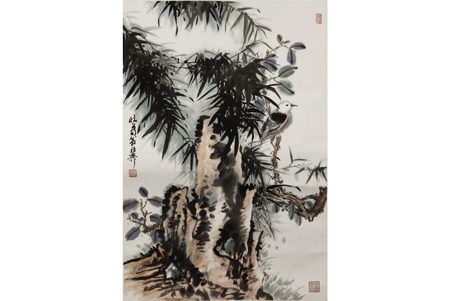 The painting depicts a bird perched on pine tree branches, surrounded by bamboo trees, leaves, and jagged stones, artist signature and mark on left side, additional marks on top right and bottom.