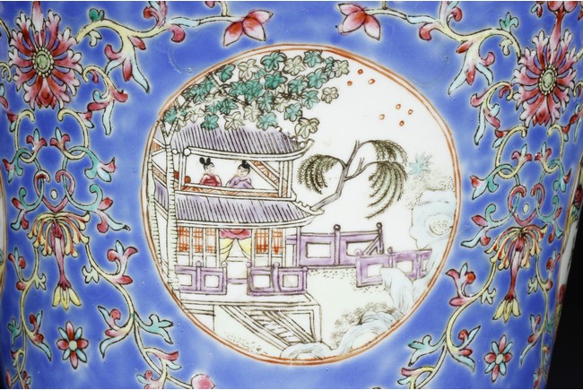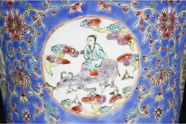 Of tapering cylindrical form, the planter's exterior enameled with four roundels, one with a herder riding on water buffalo through ruyi-head clouds, one with lady walking amidst flying birds and clouds, one with two ladies looking outside in a garden setting, and one with a kid with two ladies in a river side setting, all surrounded by intertwining flowers and vines over blue ground, the flaring rim with key-fret patterns, and bottom bears six character 'QIANLONG' mark. 19th century.