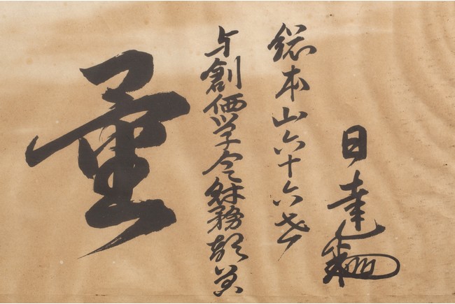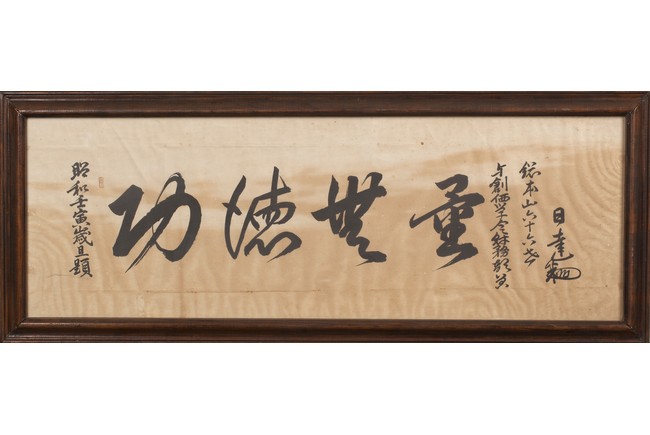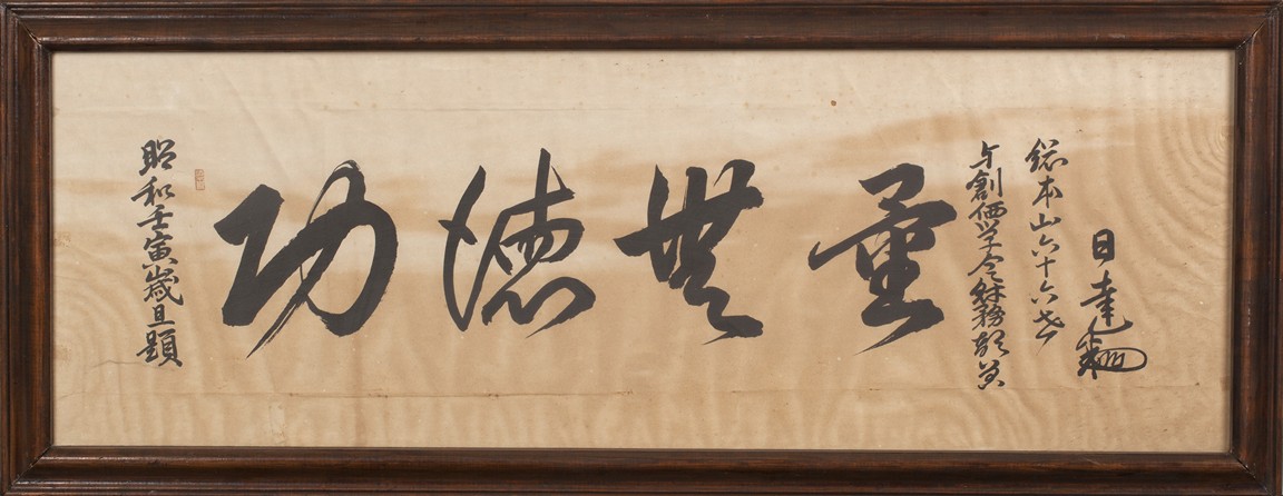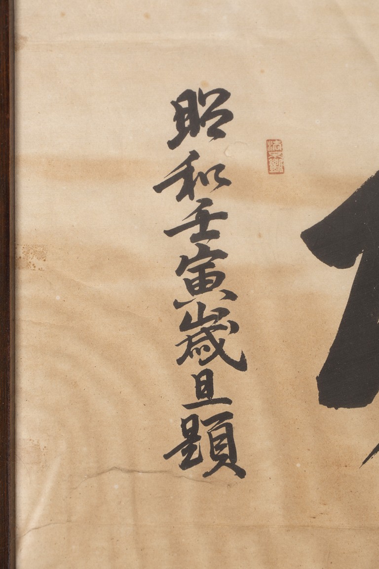 This calligraphy writing has four main characters in the middle, with signature and dates on the sides.