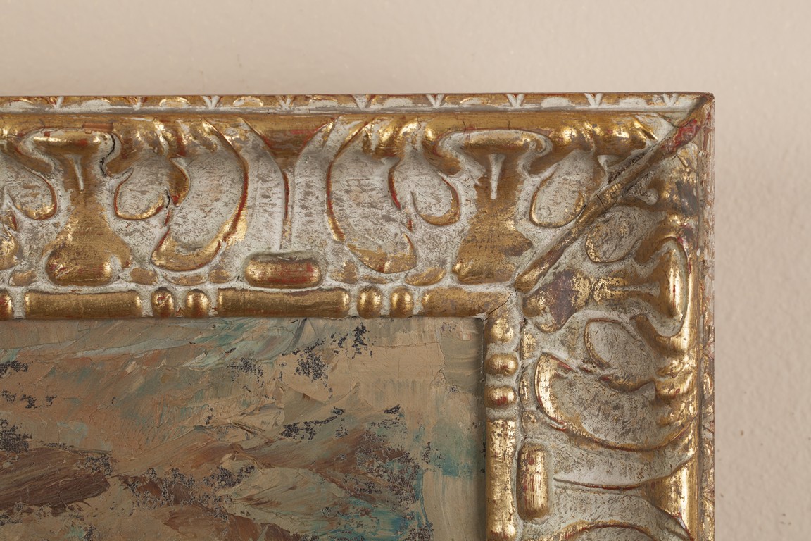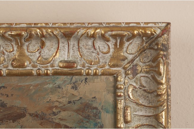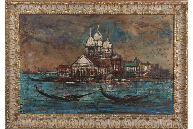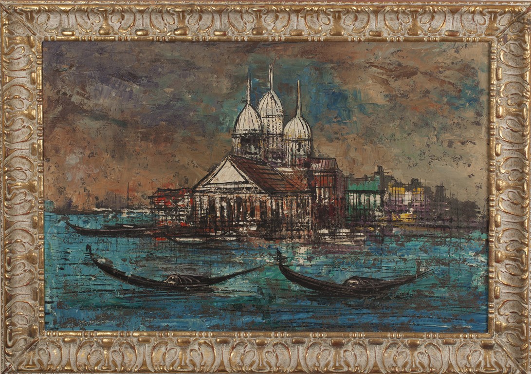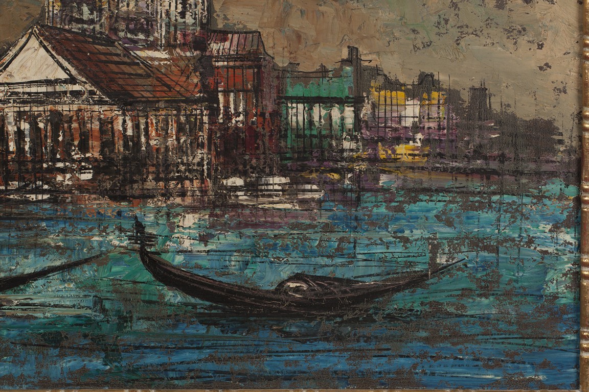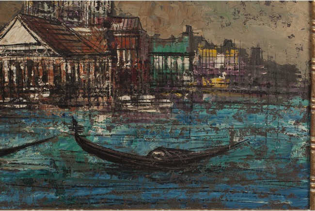 This painting features a very beautiful cityscape of Venice accompanied by two gondolas on the front.