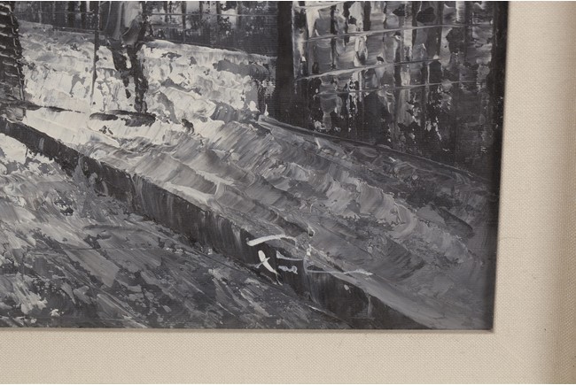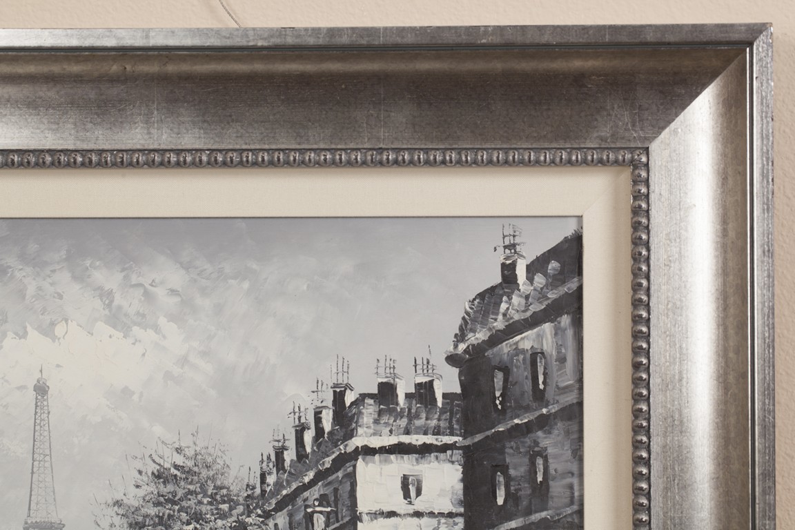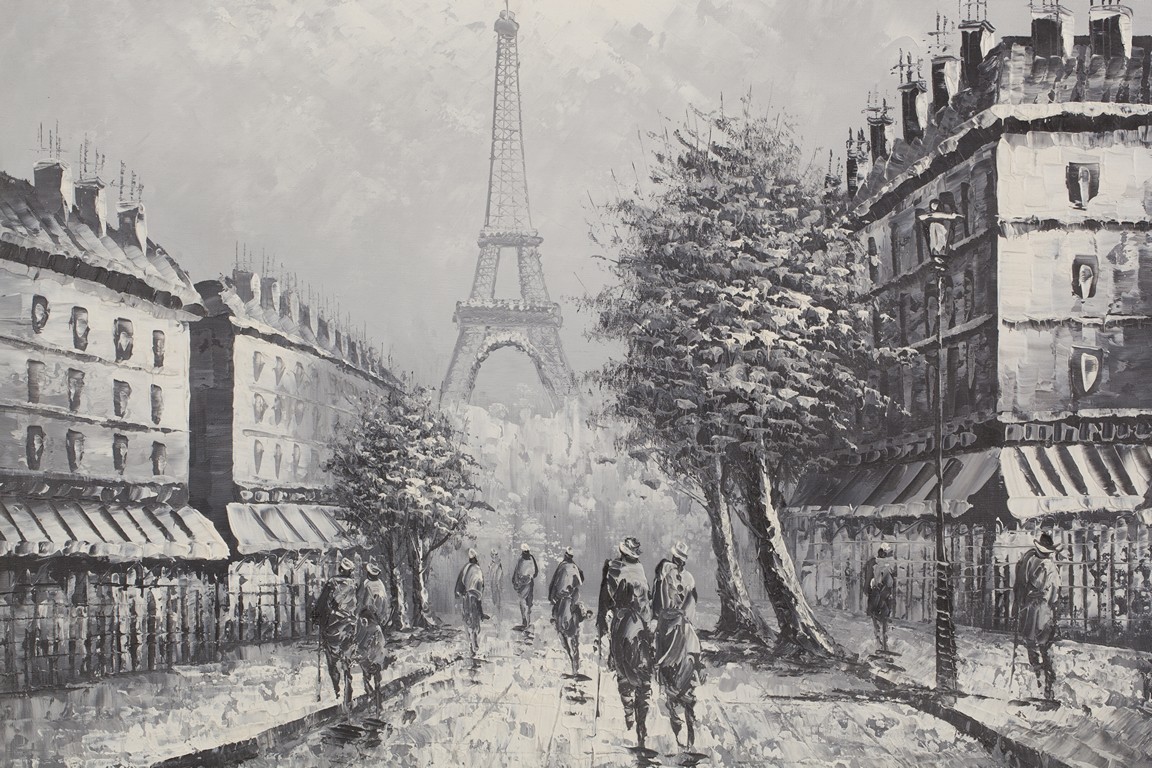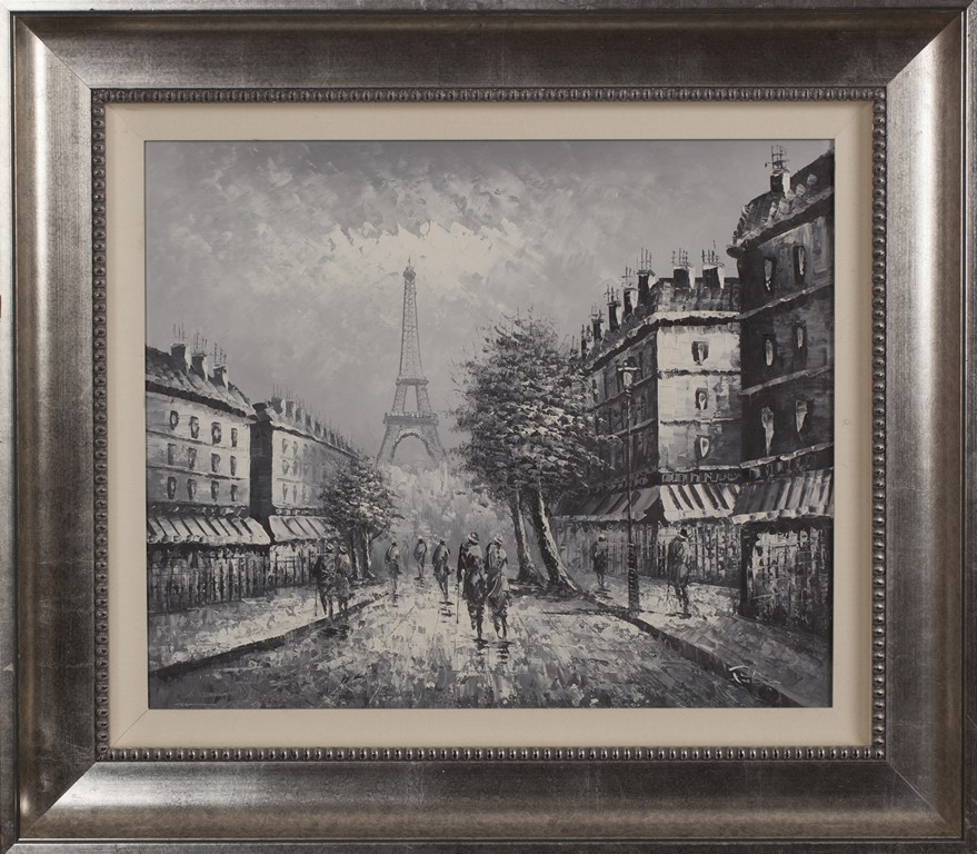 This monochrome oil on canvas painting features pedestrians walking towards the iconic Eiffel Tower on street full of buildings. Artist signature on bottom right.