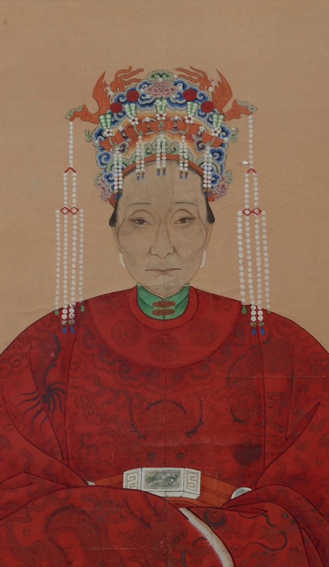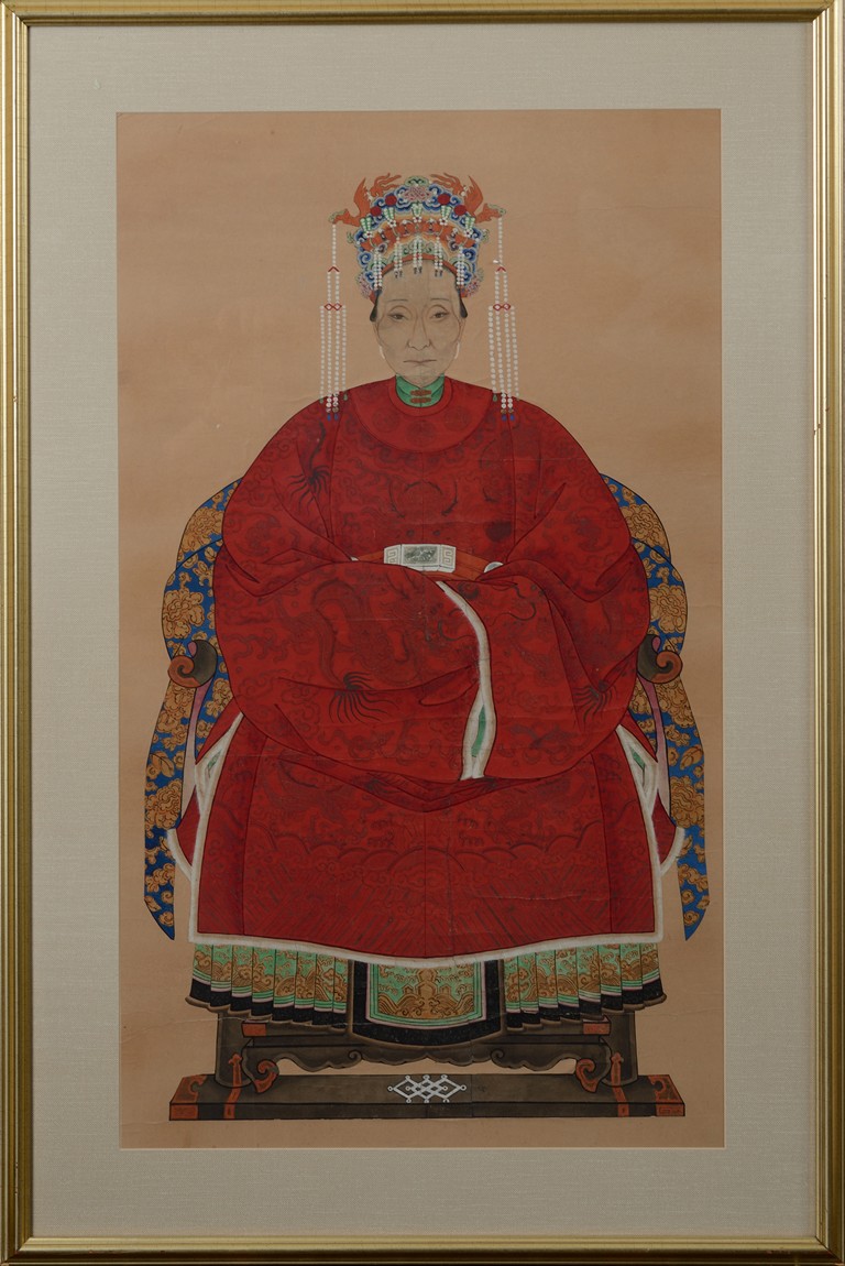 A framed multi-hue ancestor painting on paper, with elaborate hair adornment and a bright red dragon robe.