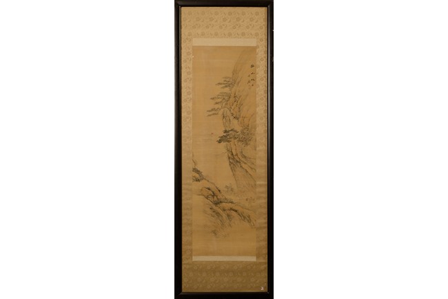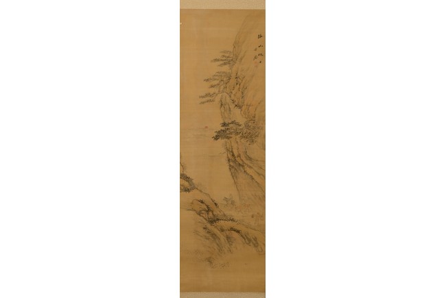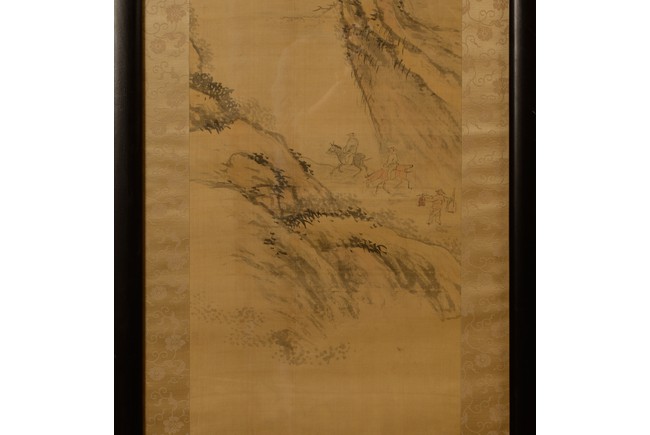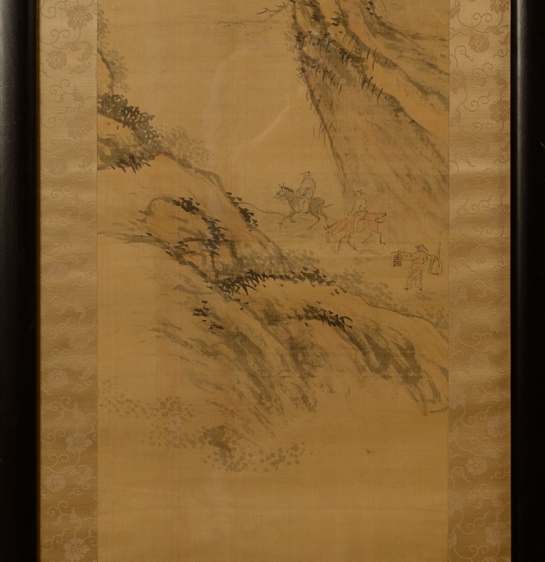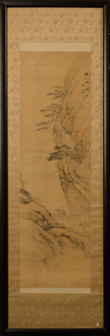 The silk painting of a mountain scene with the sun setting on the distant lake, and two scholars riding the horse on the mountain trail.