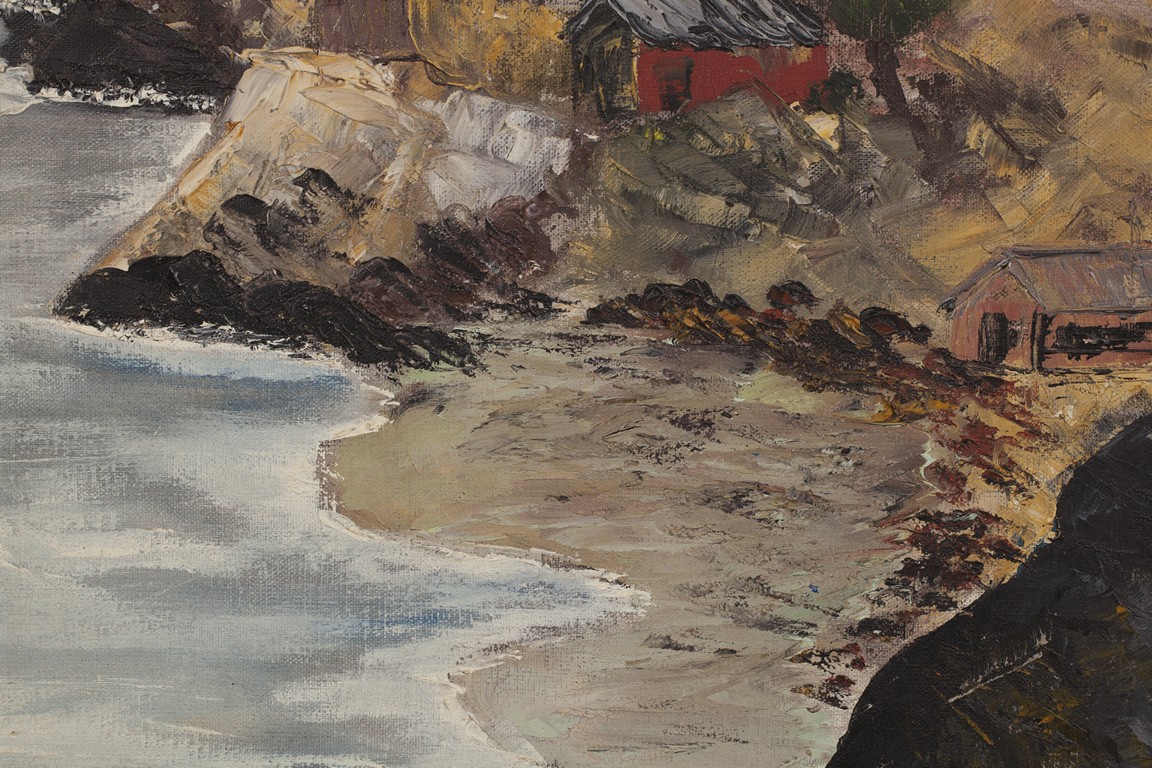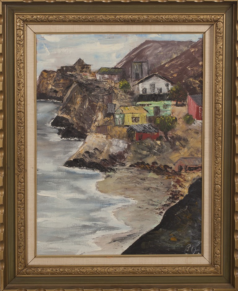 A FRAMED SEA-SIDE VILLAGE PAINTING 海邊城市風景油畫