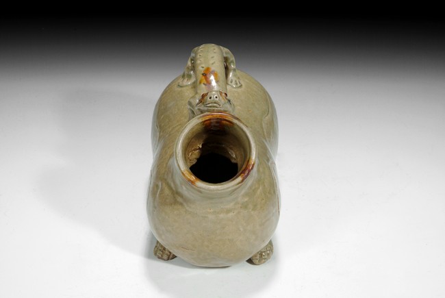 A green glazed urinal in the shape of tiger with a dragon handle on the top.