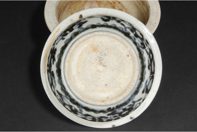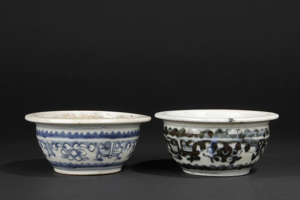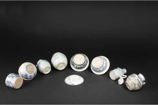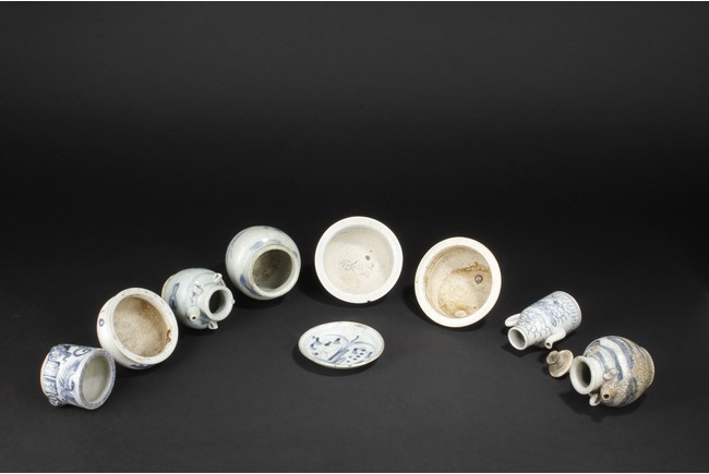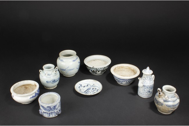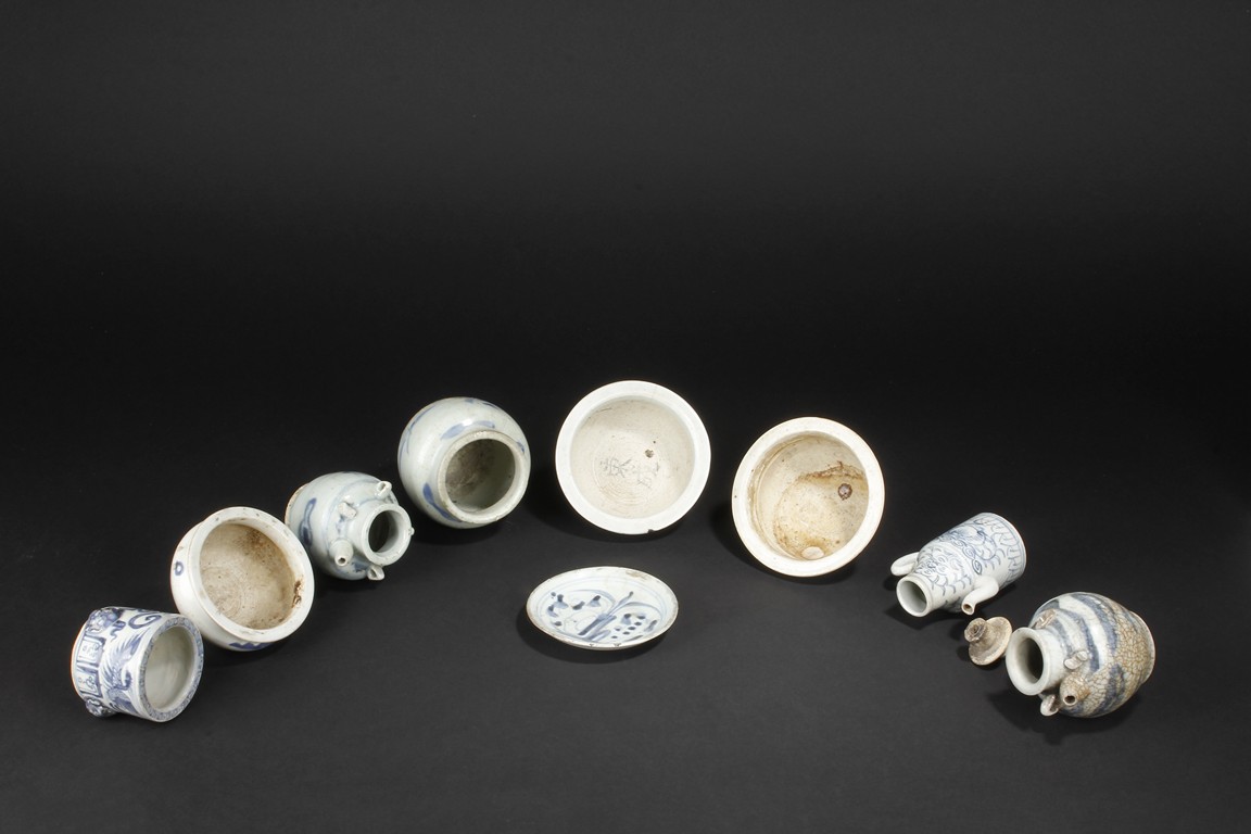 The group includes nine pieces of blue and white porcelain, such as bottles, jars, and bowls with different designs and shapes.
