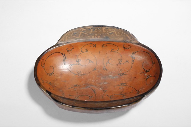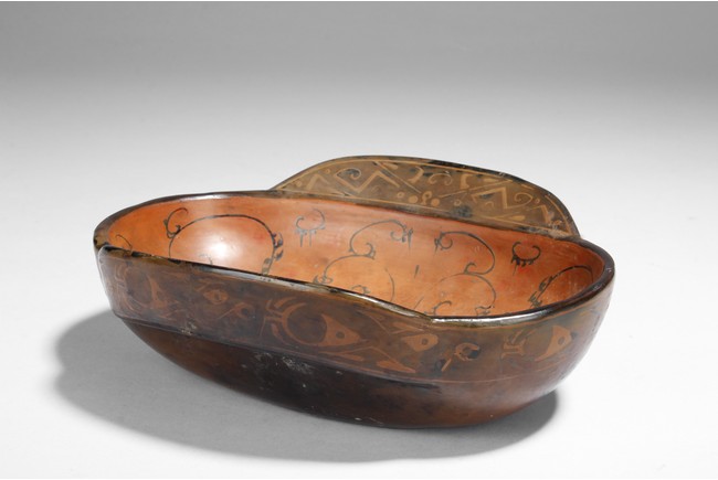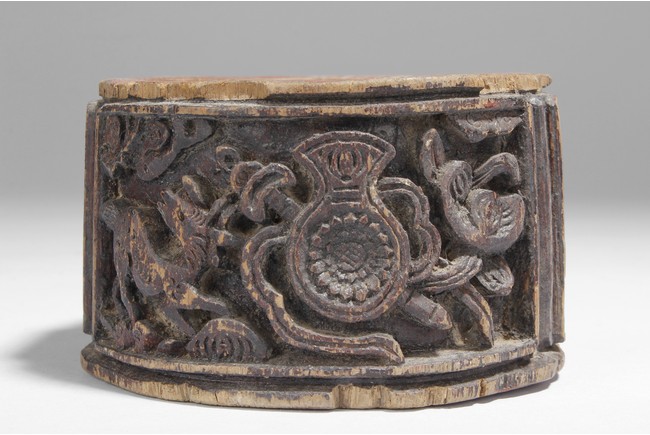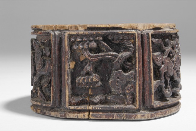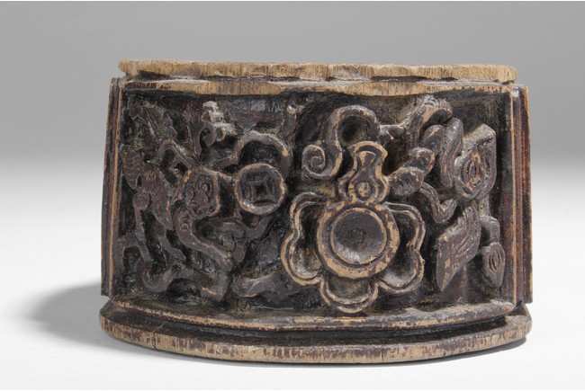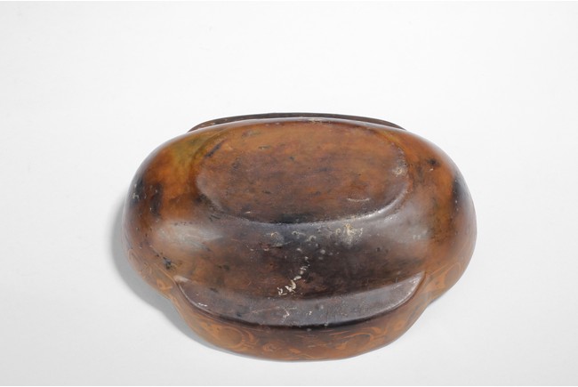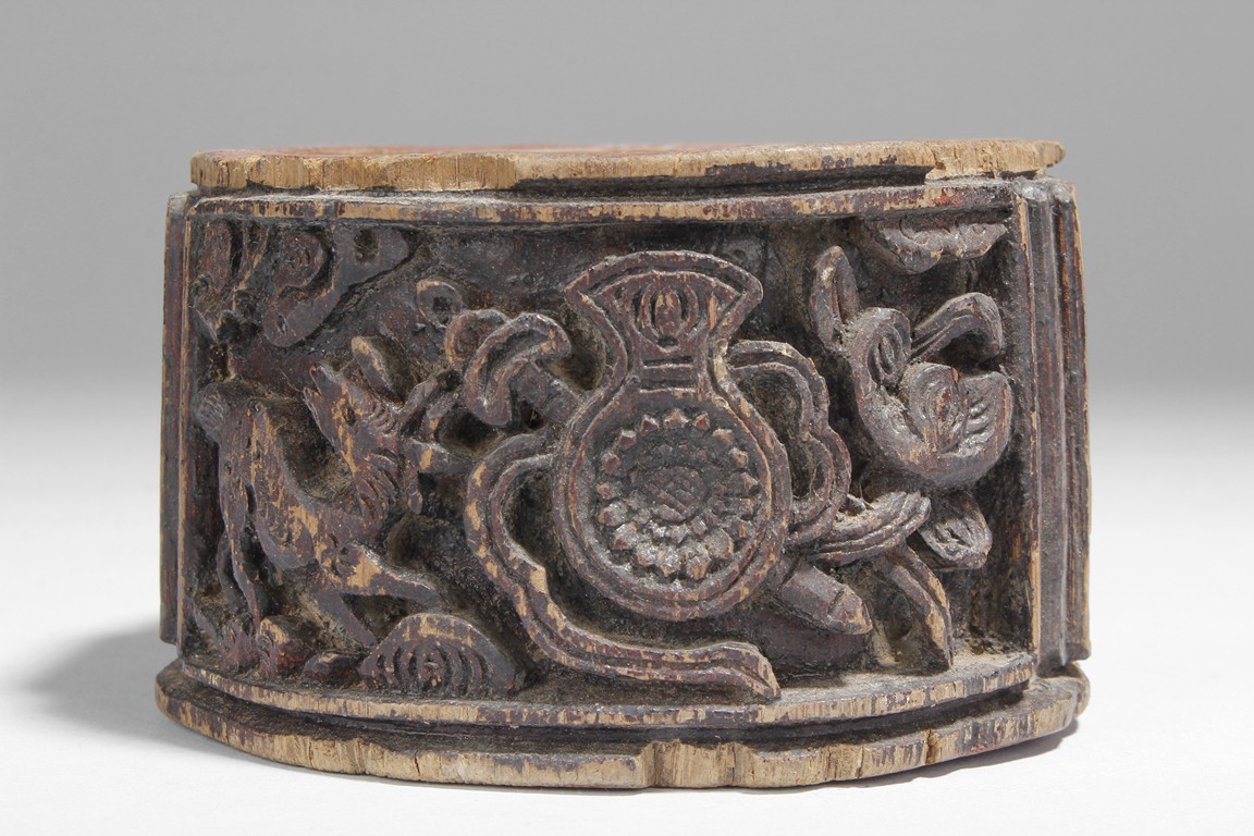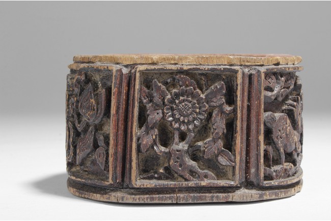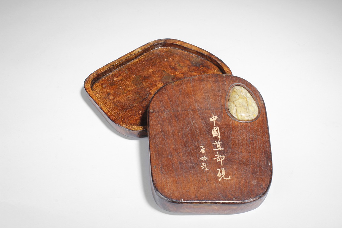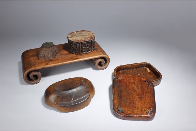 The group includes a wooden ink stone box with a inlaid stone on the top surface of the case, a round carved container, a hexagonal bowl, and an oval shaped bowl.