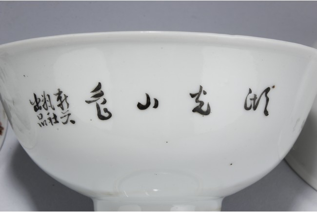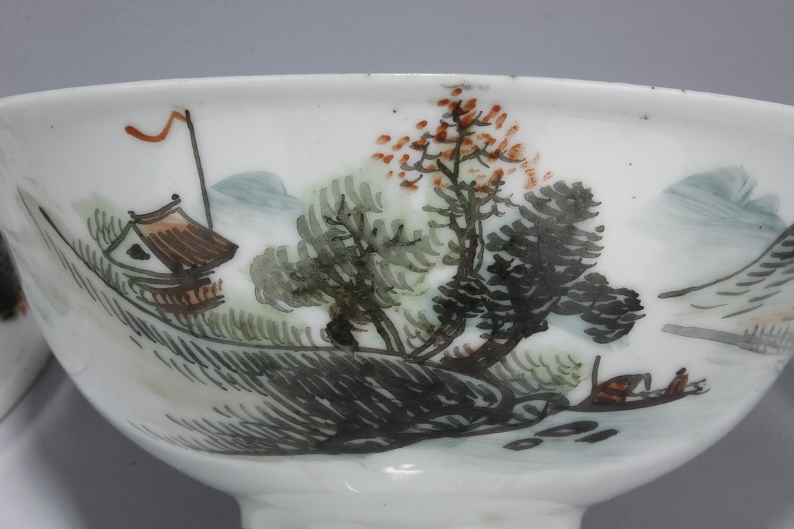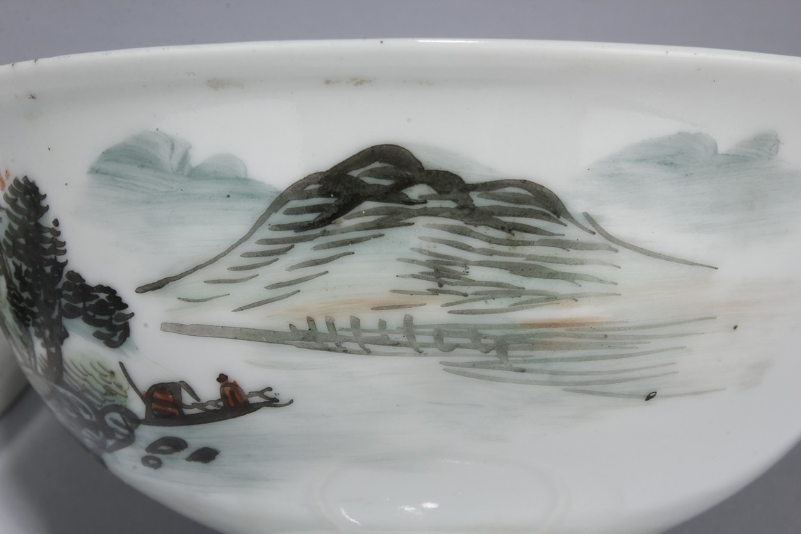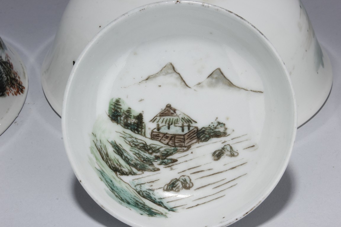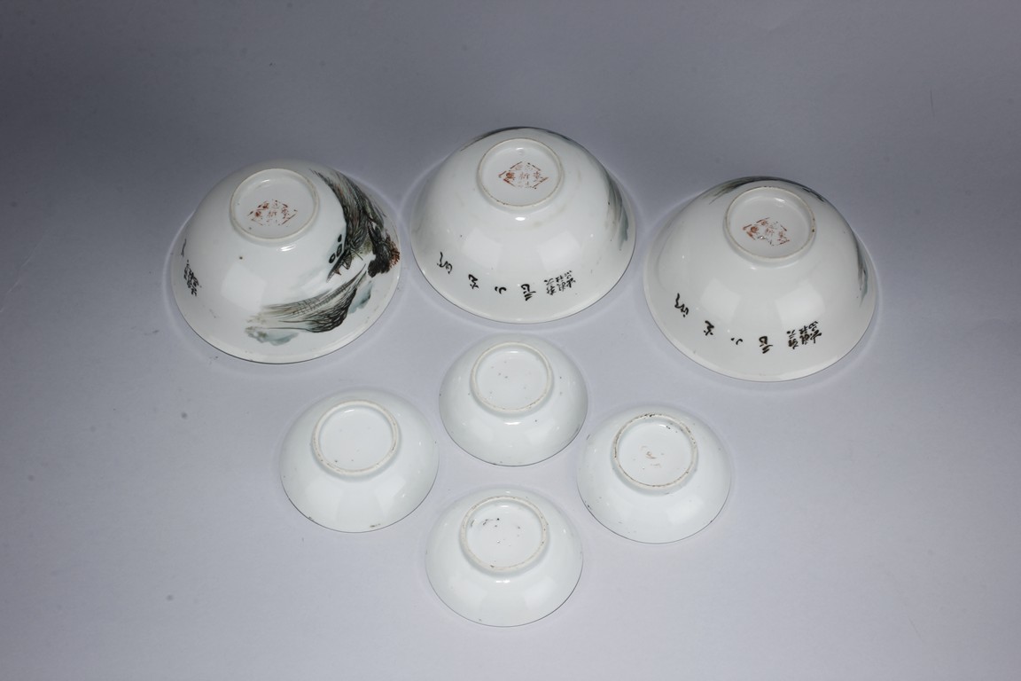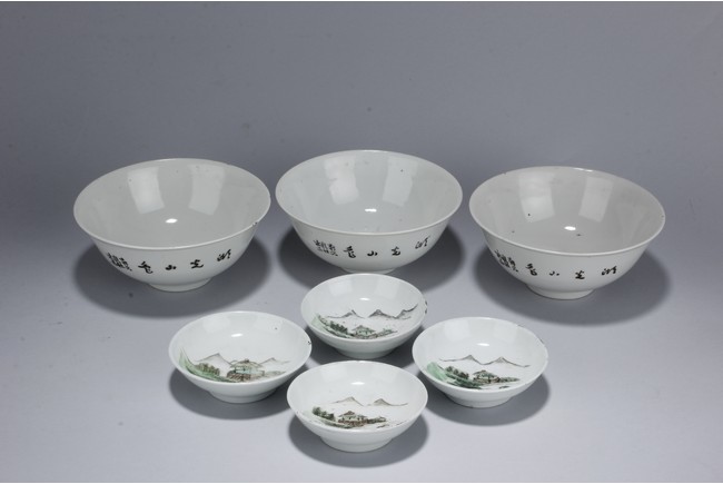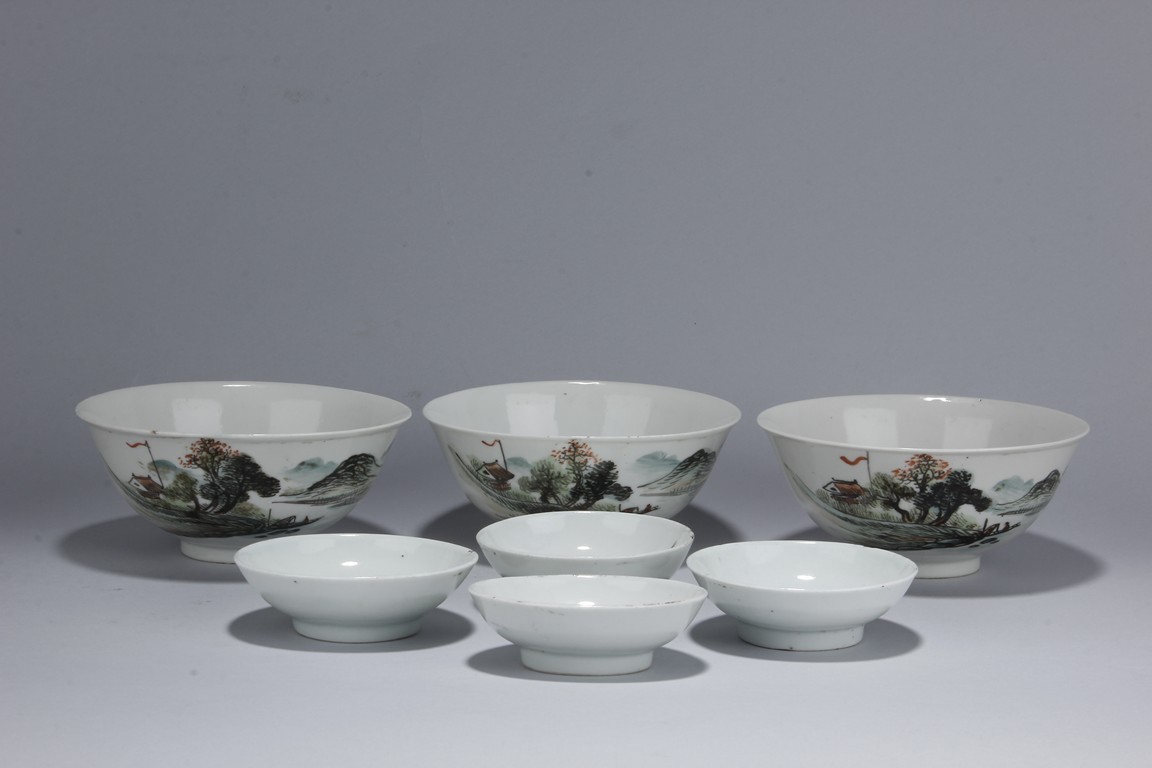 The group includes three larger bowls and four saucers. Three larger bowls with flared rims depict landscape scenery with village, boat, mountain, and river, with Chinese characters on the back.The saucer's interior depict a landscape scene with pavilion, river, and mountains. Bowls also with red marks on the bottom. Republic period.